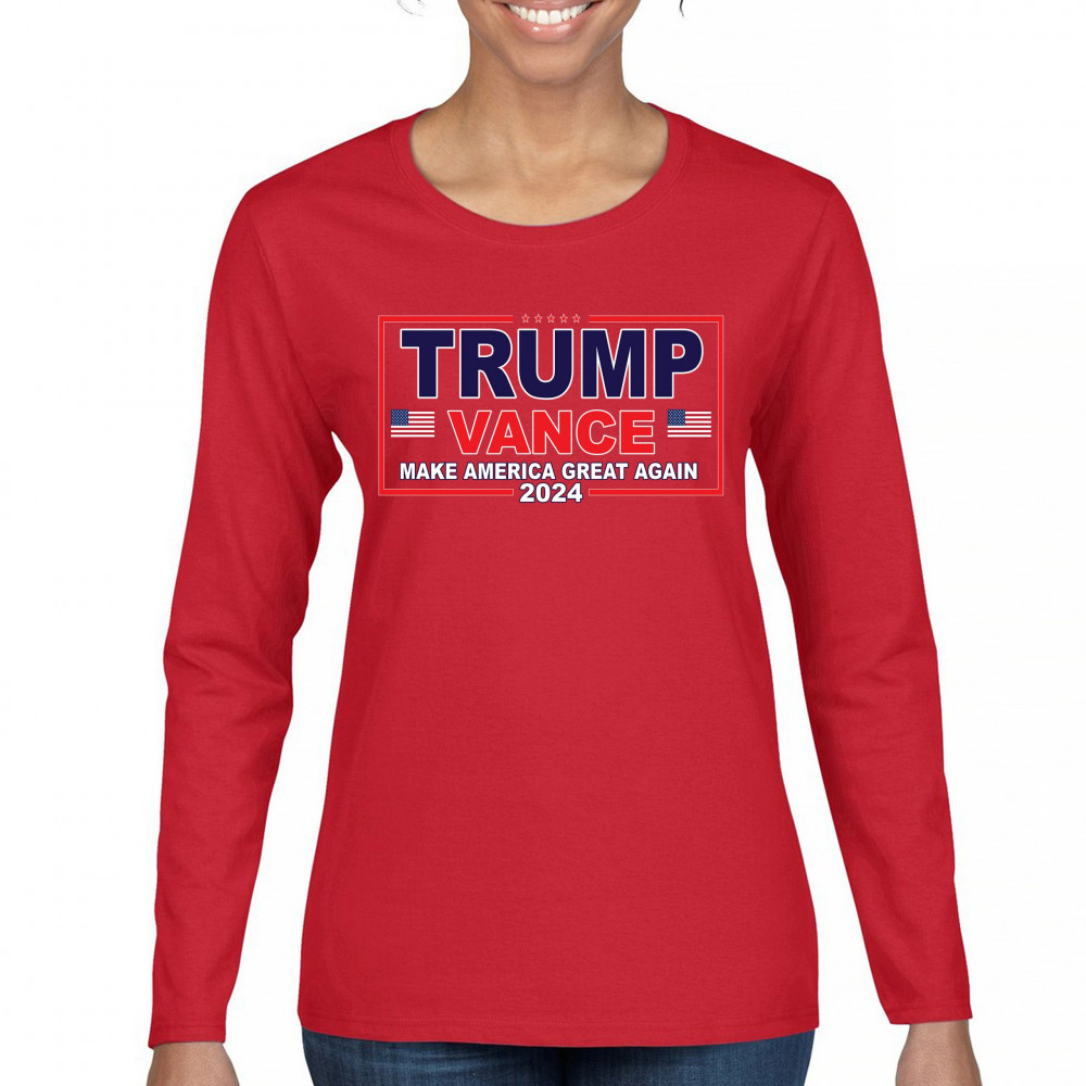 Showcase your support for the Trump-Vance 2024 campaign with this bold patriotic design featuring the American flag and "Make America Great Again" slogan.