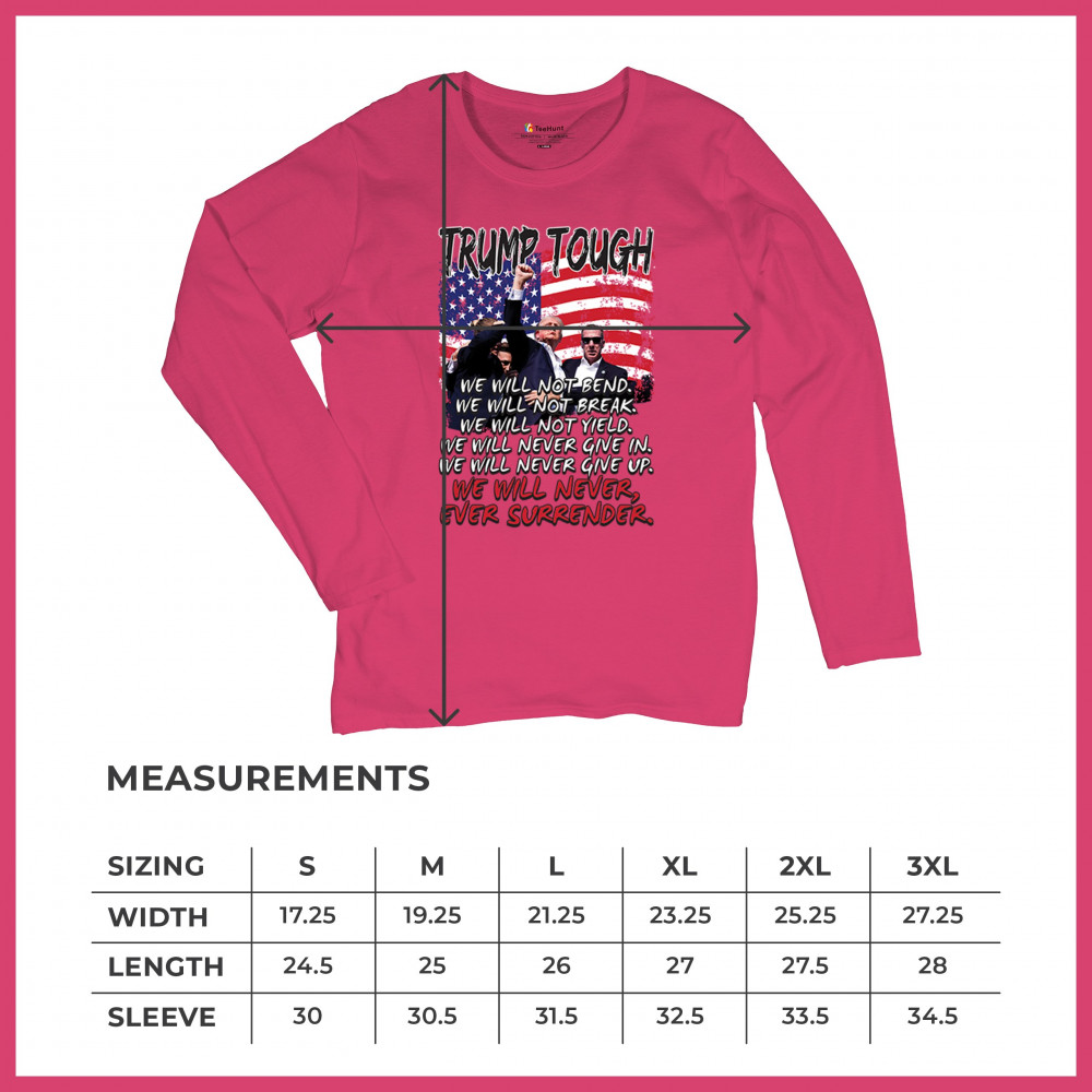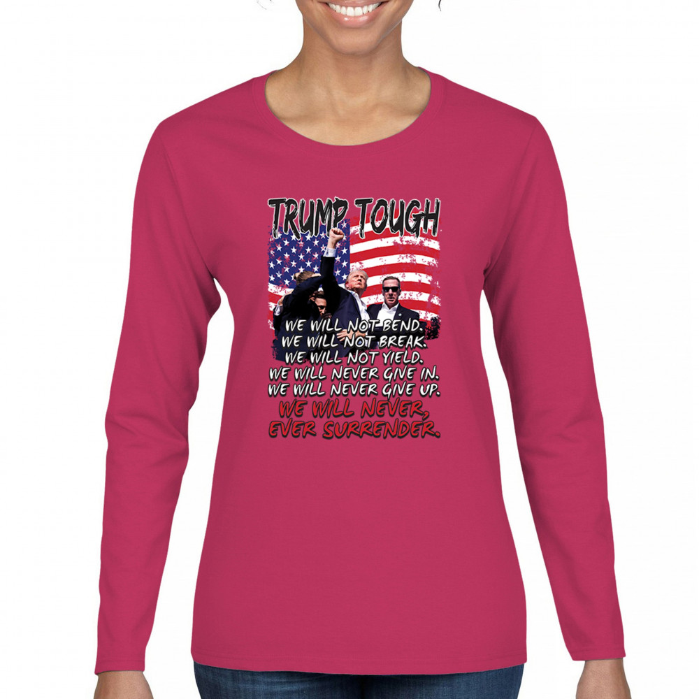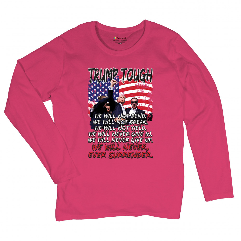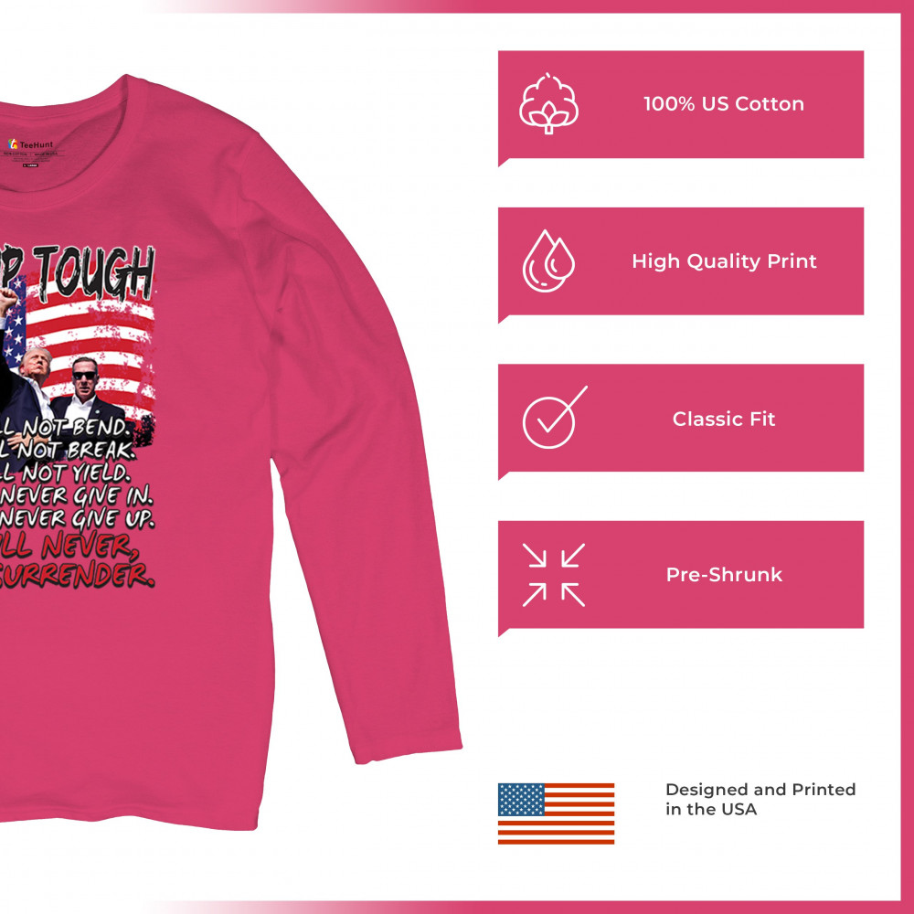 Express your support for Trump 2024 with this bold, patriotic design featuring the American flag and a powerful message. Never surrender your values.