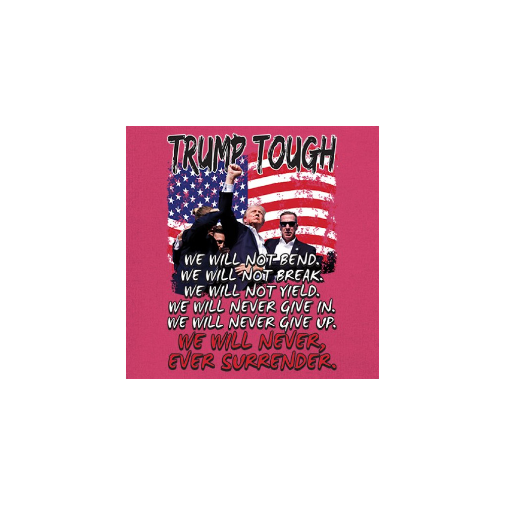Display your unwavering support for Donald Trump with this powerful design. Crafted for those who believe in conservative values and the America First agenda, it’s perfect for any rally or event. With a striking image and the American flag in the background, this design embodies the spirit of those who refuse to give up or surrender. Show your dedication and pride every time you wear this. Join the movement and stand firm in your beliefs.