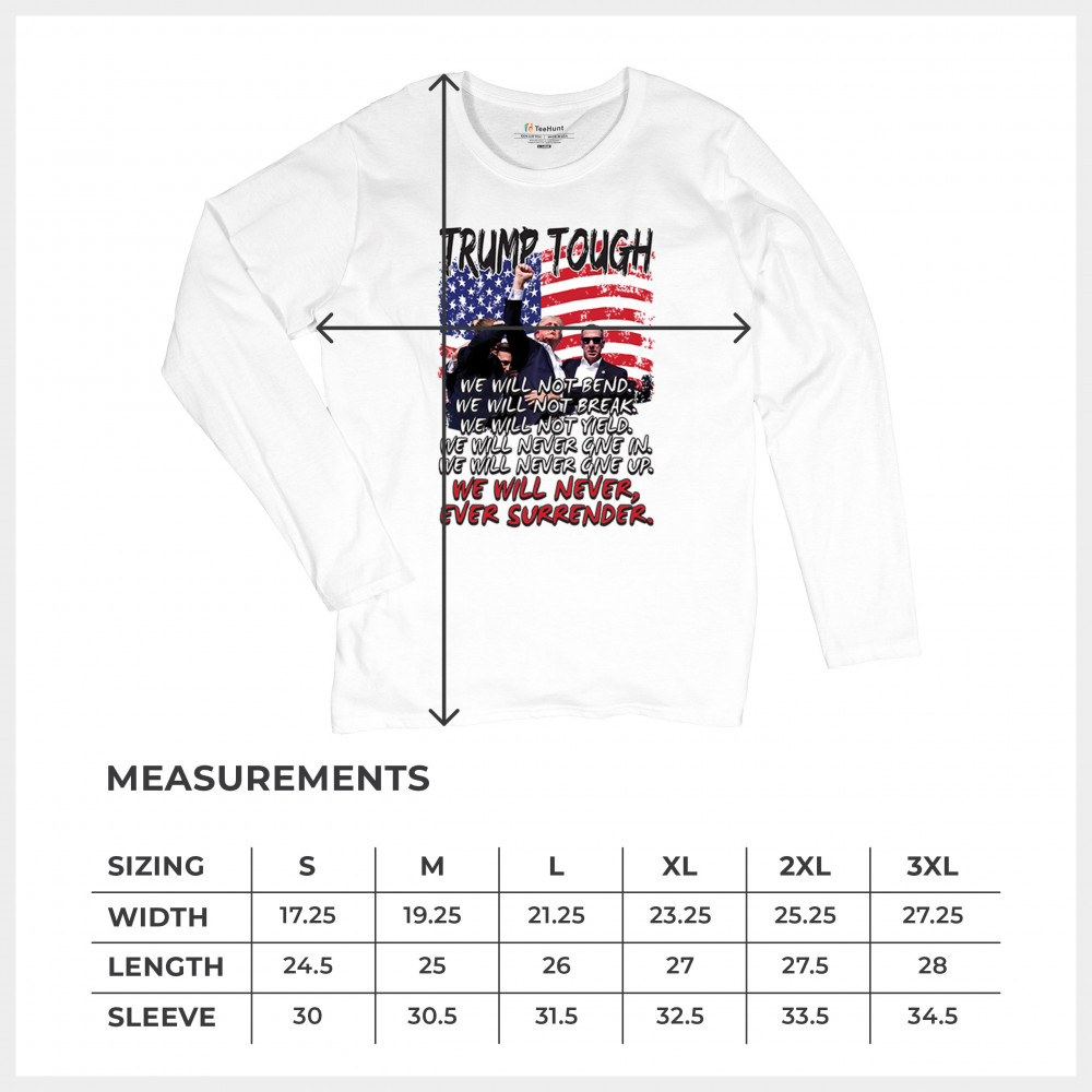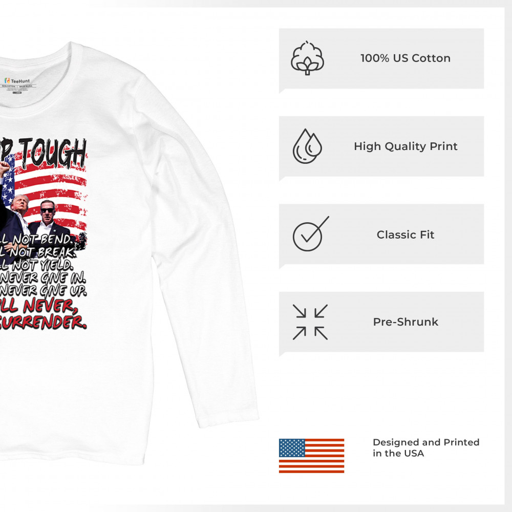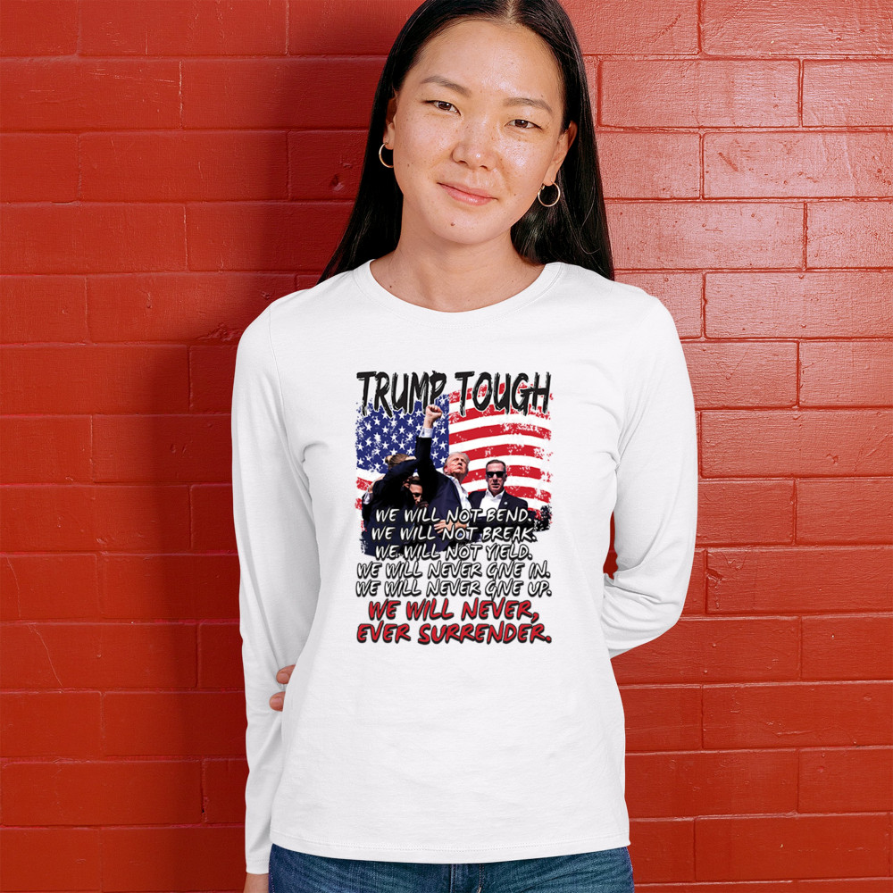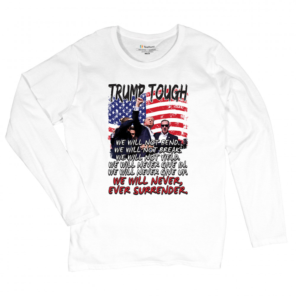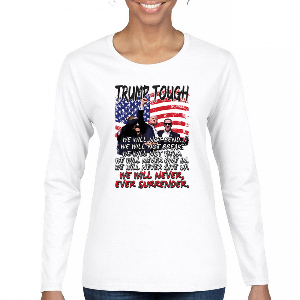 Express your support for Trump 2024 with this bold, patriotic design featuring the American flag and a powerful message. Never surrender your values.