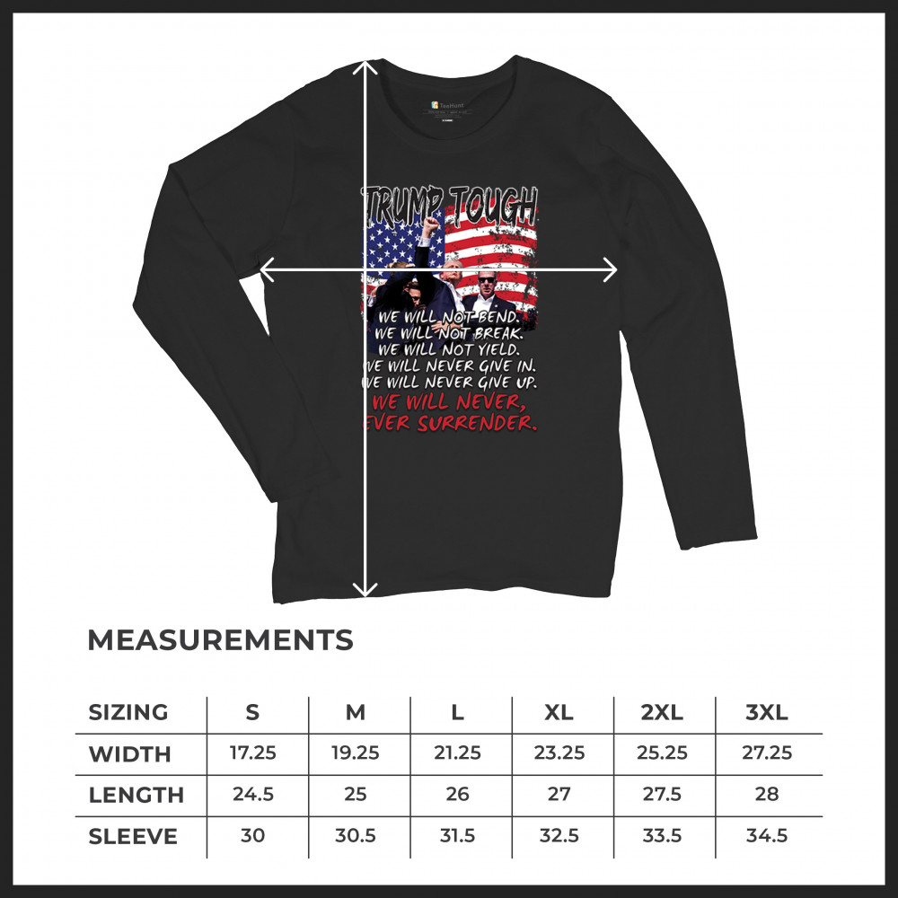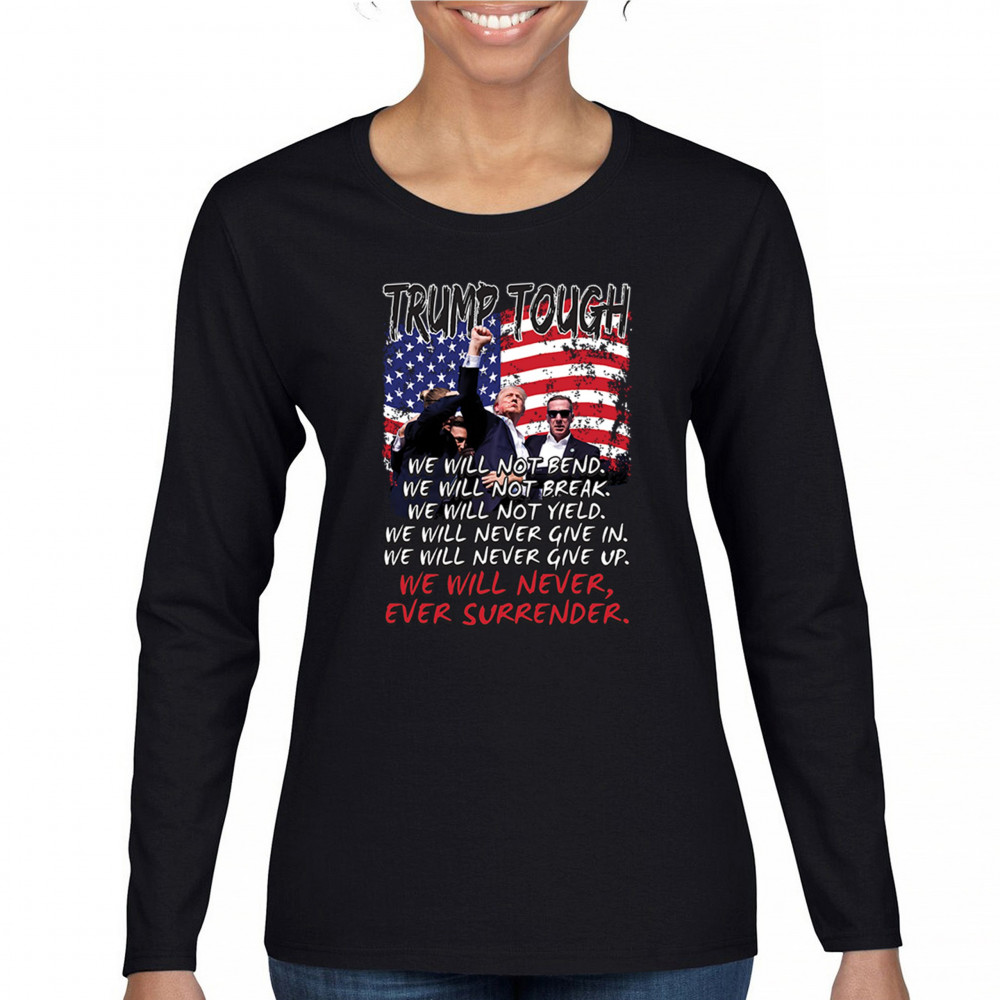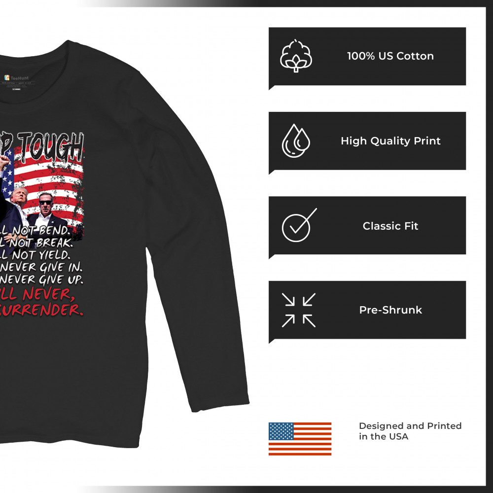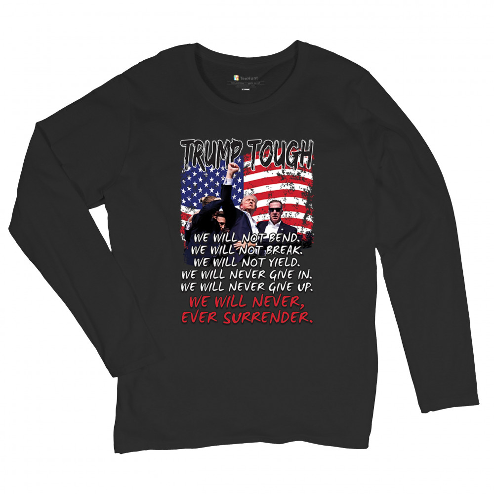 Express your support for Trump 2024 with this bold, patriotic design featuring the American flag and a powerful message. Never surrender your values.