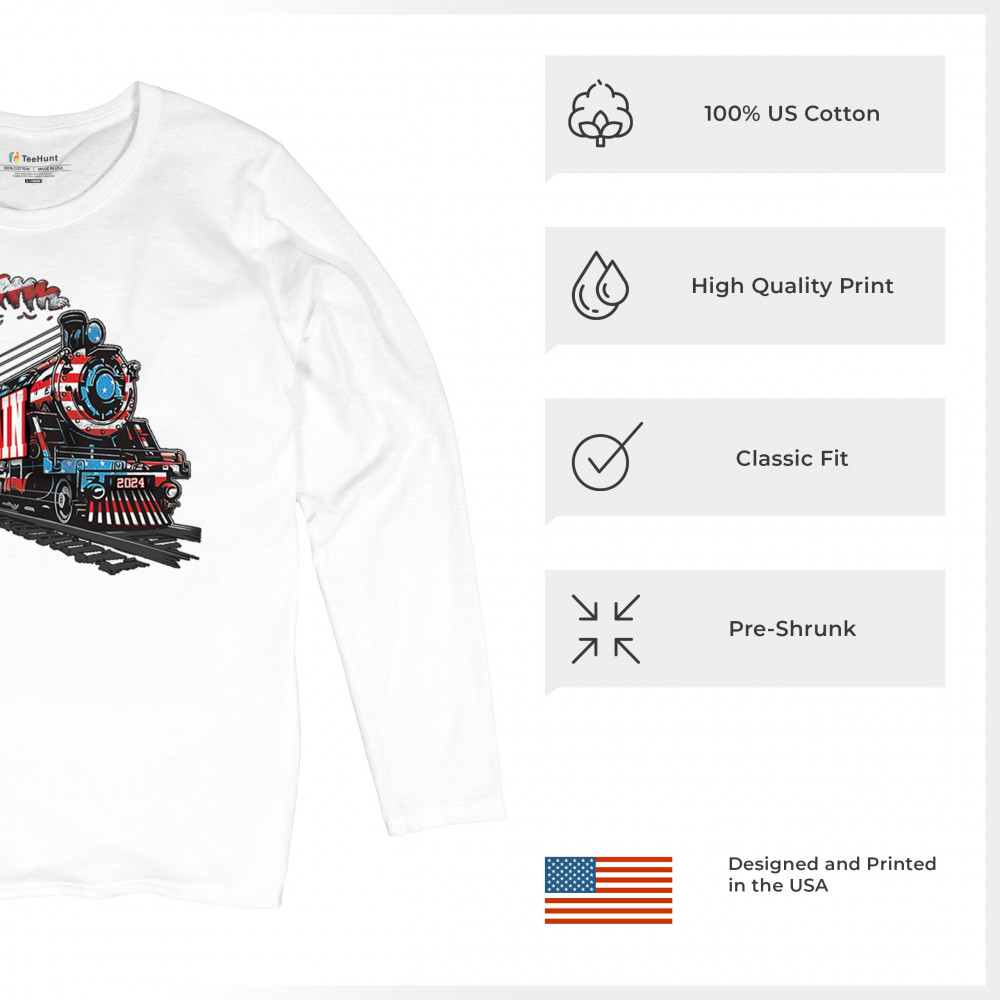 Celebrate the Trump Train with this bold, patriotic design. Featuring a steam engine wrapped in the American flag, this tee is perfect for Trump supporters and conservatives looking to make a statement. Join the Red Wave, fight for victory, and showcase your support for the 47th President. Whether at rallies or casual events, this design represents we the people have spoken and the push for 4 More Years.