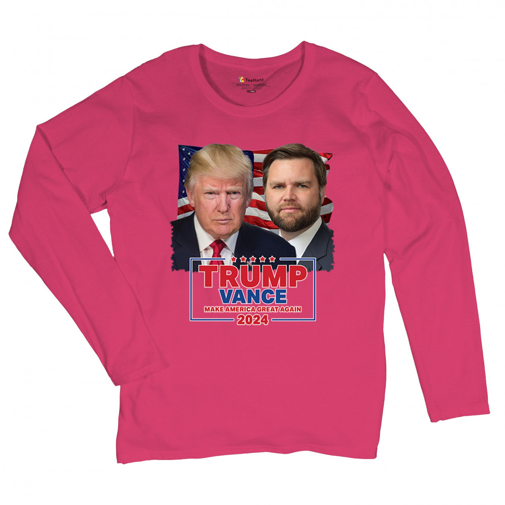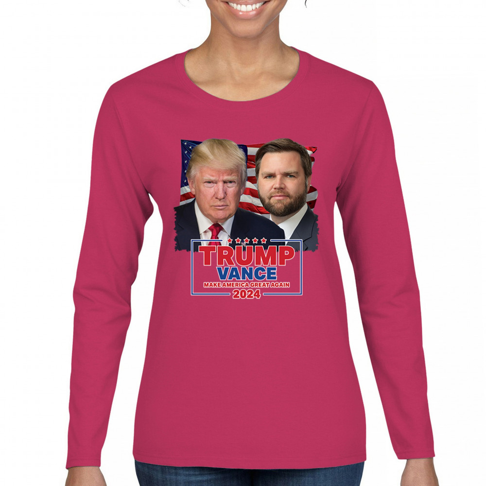 Show your support for Trump-Vance 2024 with this bold design featuring Trump and Vance against the American flag. Perfect for rallies and political events.