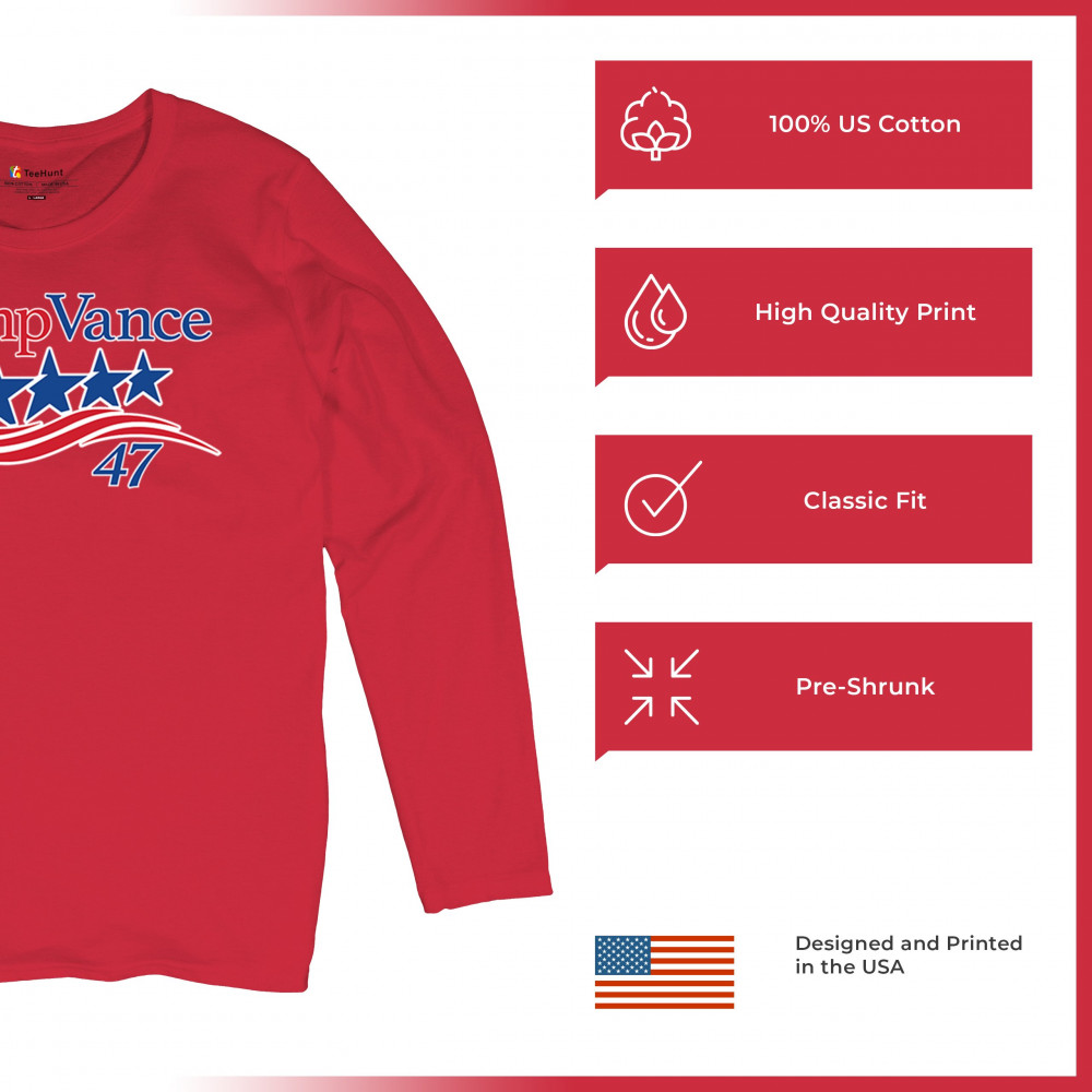 Celebrate patriotism and conservative strength with the "Trump Vance 47" design, a perfect tribute to the America First movement. This design features a bold representation of Donald J. Trump and J.D. Vance’s commitment to American values, proudly showcasing the Red Wave. For supporters who want to rally behind Republican ideals, this is the design to wear and share, symbolizing hope, unity, and victory for America's future.