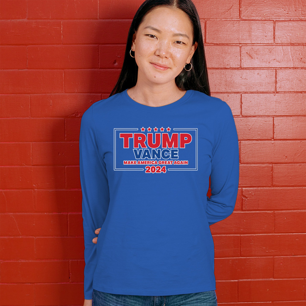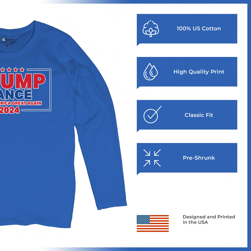 Show your support for Trump-Vance 2024 with this patriotic design featuring the American flag and bold slogan. Perfect for rallies and conservative events.