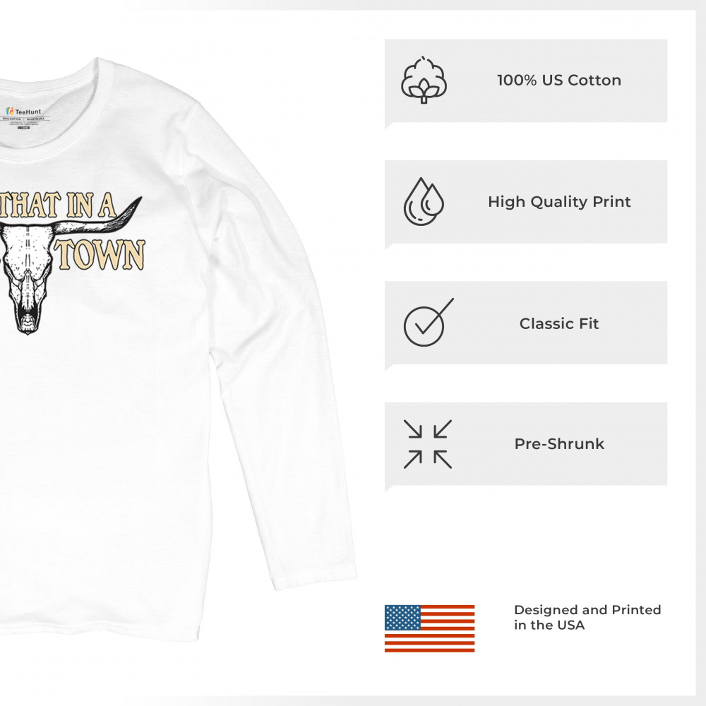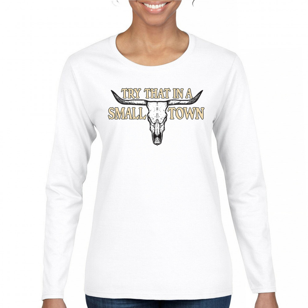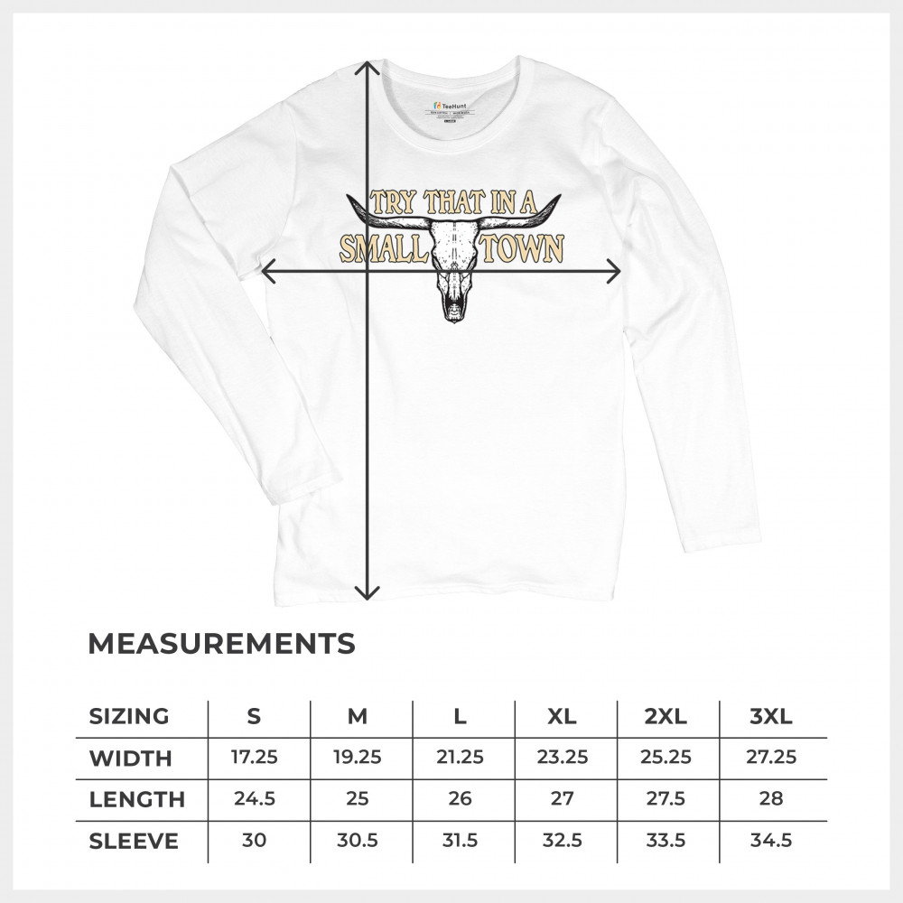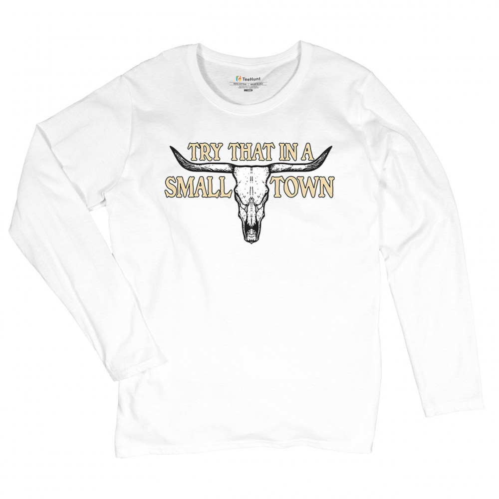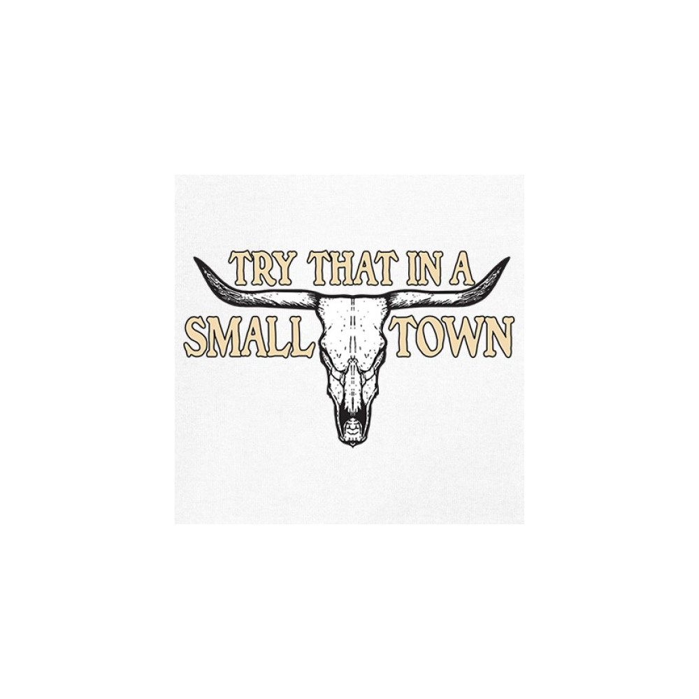 This design boldly proclaims "Try That in a SMALL TOWN," set against the backdrop of a stark cattle skull—a symbol deeply rooted in southern heritage and the undying American spirit. It's a tribute to the small-town sheriffs, the unwritten laws of backbone and duty, and the patriotic fervor that runs through the country's veins. Whether you're a motorcycle enthusiast, a Republican, or simply a connoisseur of all things vintage, this piece is a testament to enduring strength and local pride.