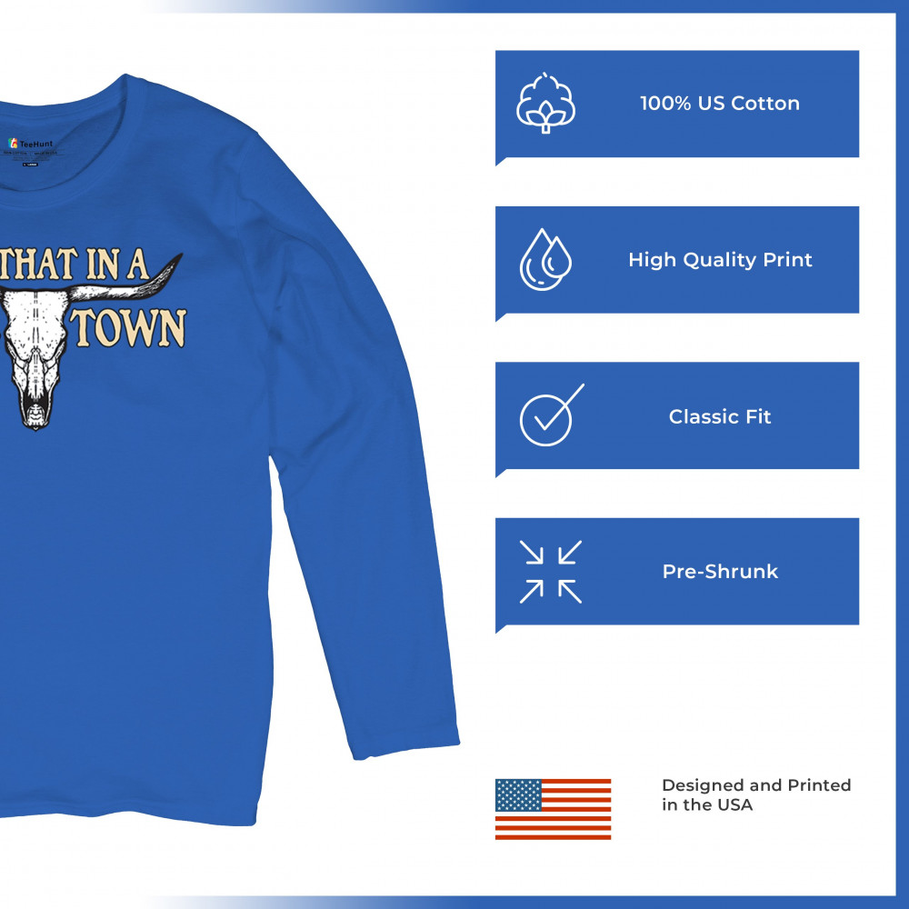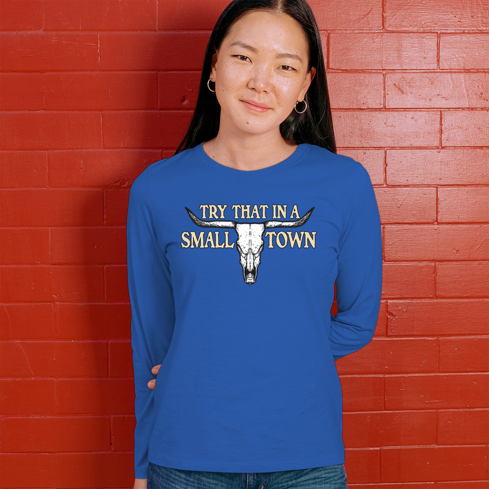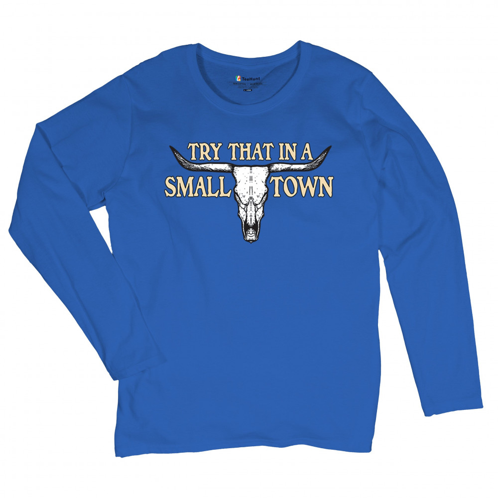 This design boldly proclaims "Try That in a SMALL TOWN," set against the backdrop of a stark cattle skull—a symbol deeply rooted in southern heritage and the undying American spirit. It's a tribute to the small-town sheriffs, the unwritten laws of backbone and duty, and the patriotic fervor that runs through the country's veins. Whether you're a motorcycle enthusiast, a Republican, or simply a connoisseur of all things vintage, this piece is a testament to enduring strength and local pride.