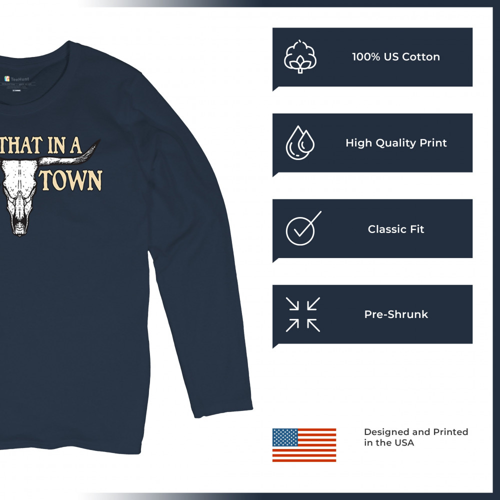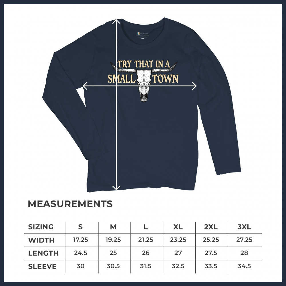 This design boldly proclaims "Try That in a SMALL TOWN," set against the backdrop of a stark cattle skull—a symbol deeply rooted in southern heritage and the undying American spirit. It's a tribute to the small-town sheriffs, the unwritten laws of backbone and duty, and the patriotic fervor that runs through the country's veins. Whether you're a motorcycle enthusiast, a Republican, or simply a connoisseur of all things vintage, this piece is a testament to enduring strength and local pride.