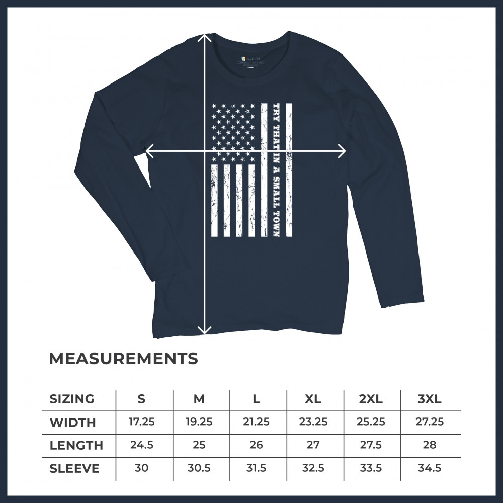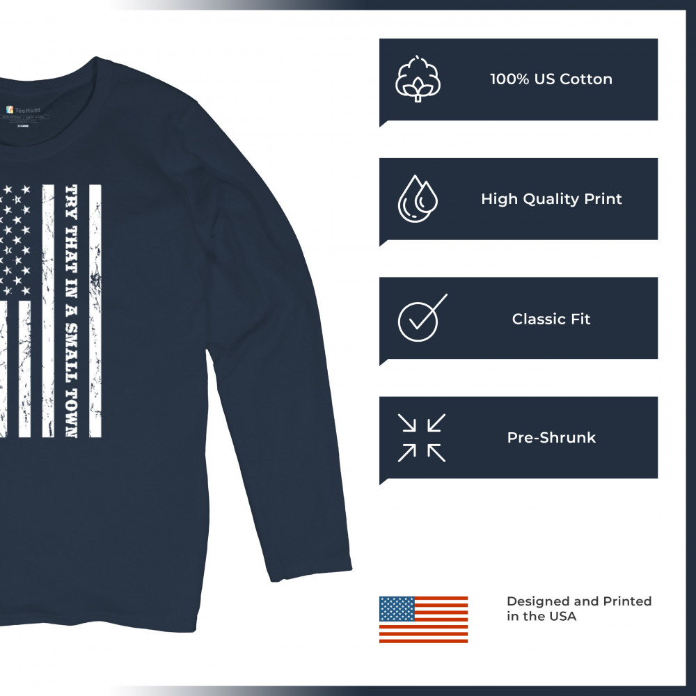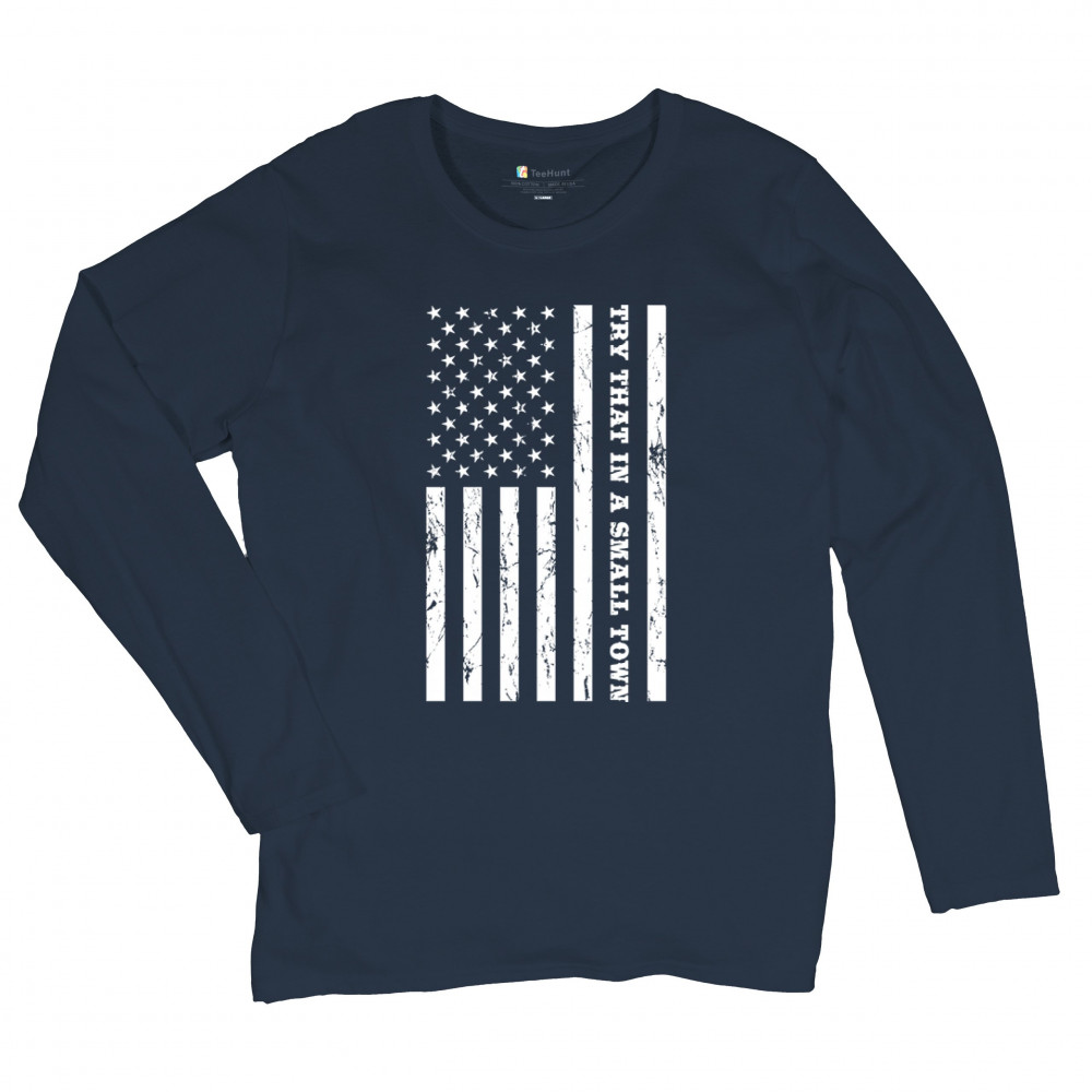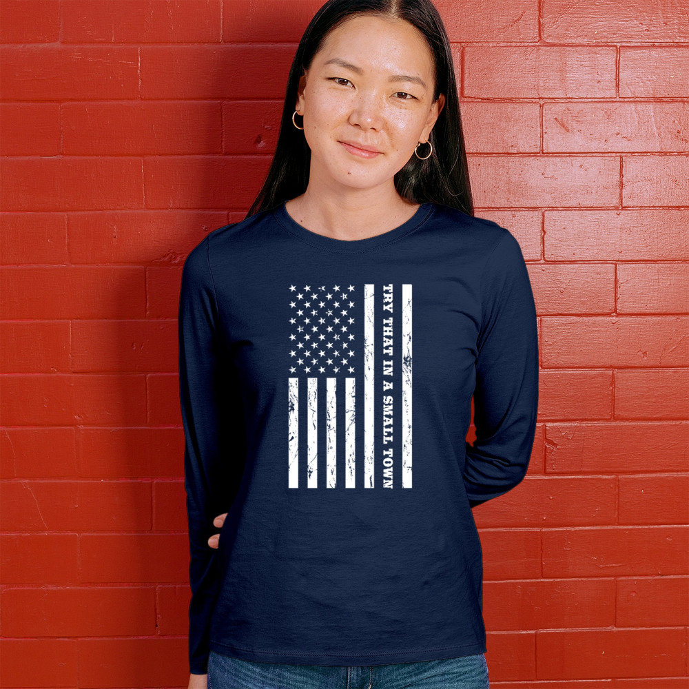 TRY THAT IN A SMALL TOWN GRUNGE AMERICAN FLAG women's long sleeve t-shirt patriotic navy blue
