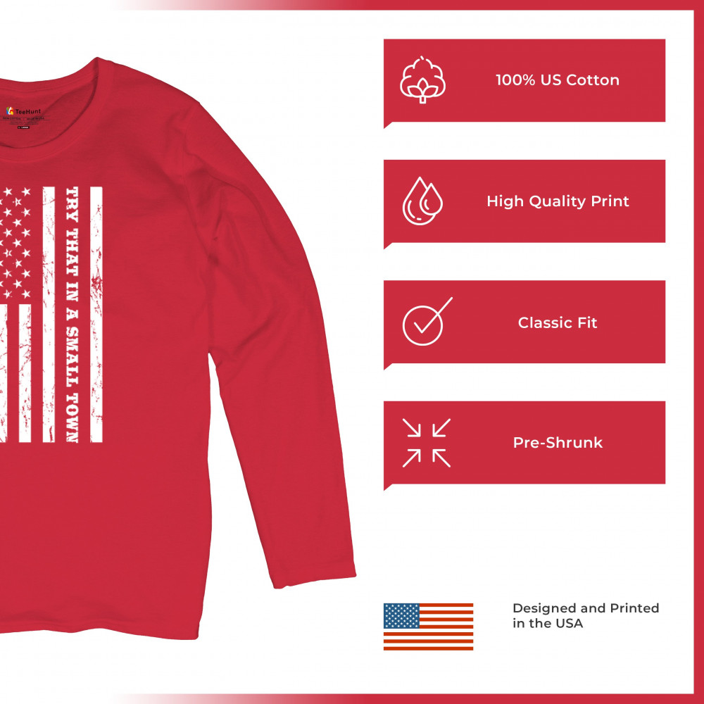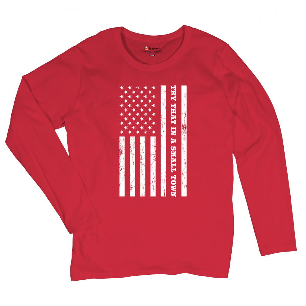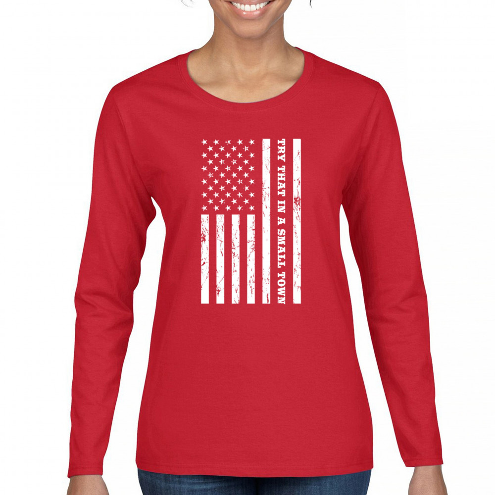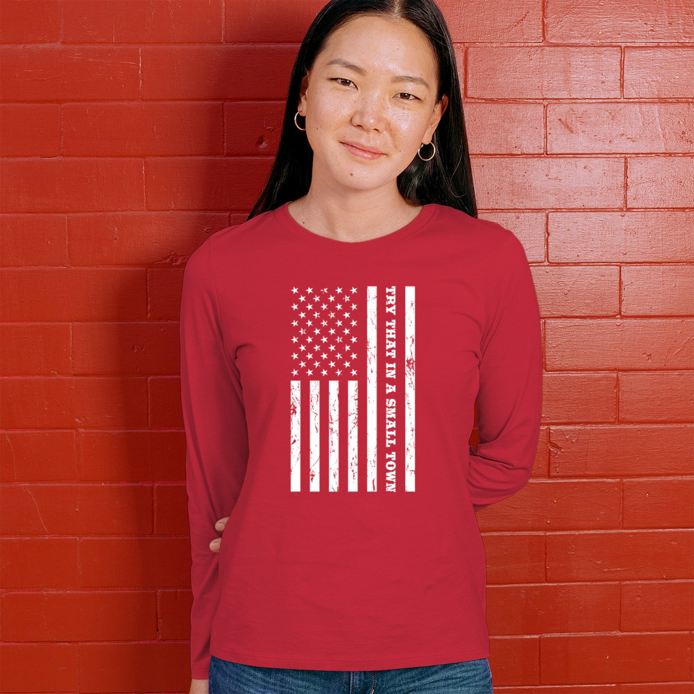 TRY THAT IN A SMALL TOWN GRUNGE AMERICAN FLAG women's long sleeve t-shirt patriotic red