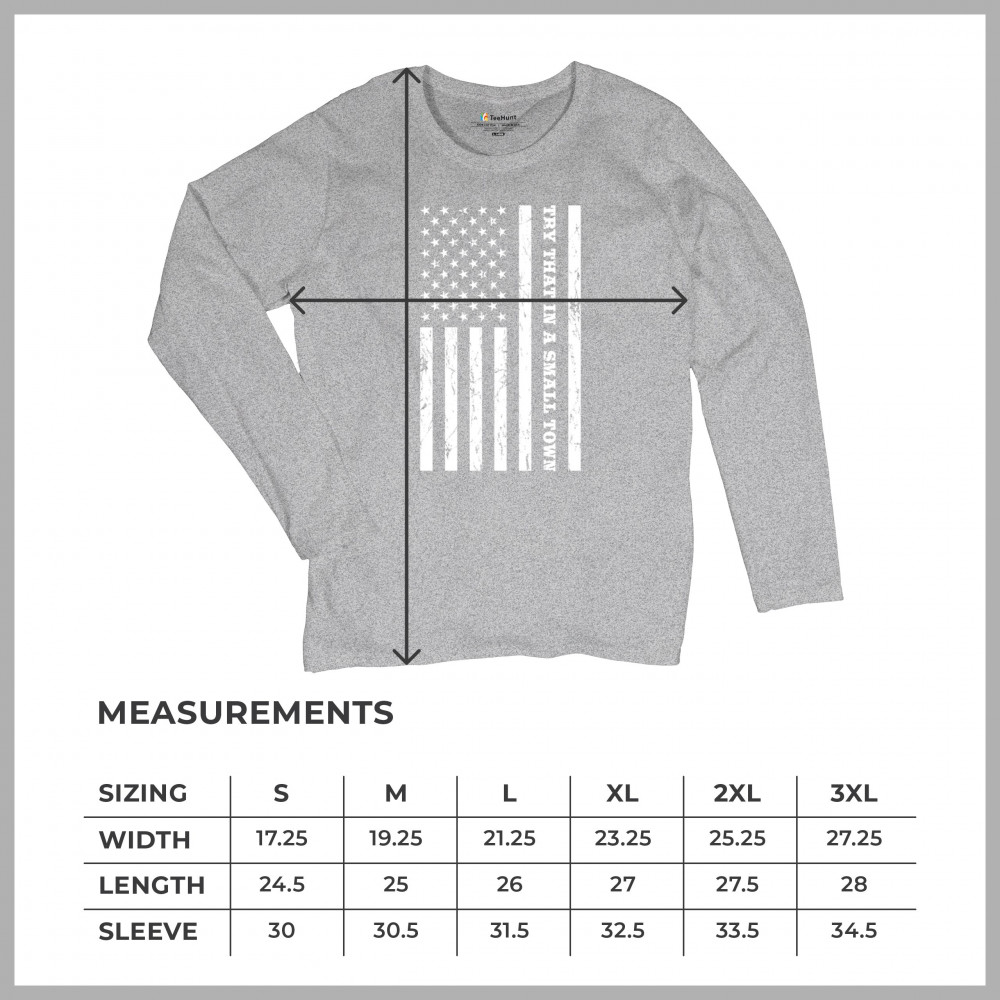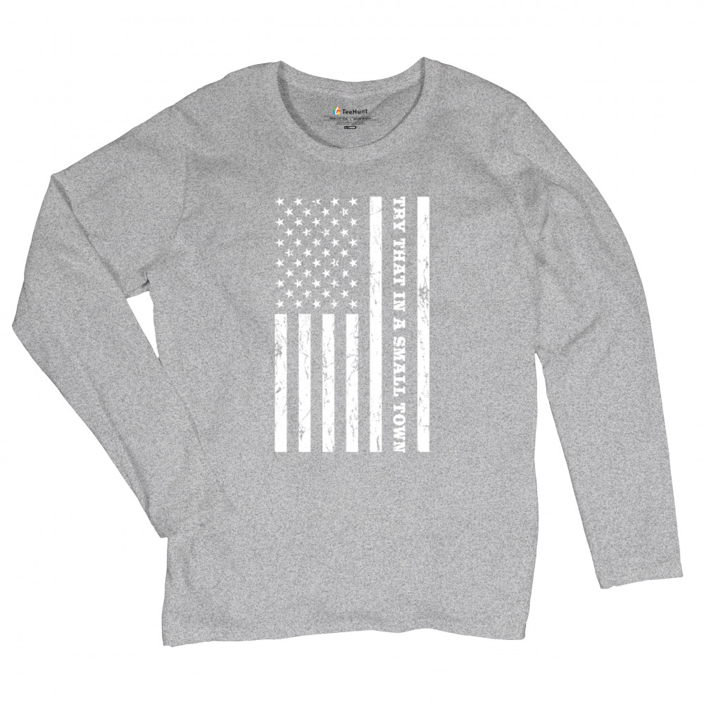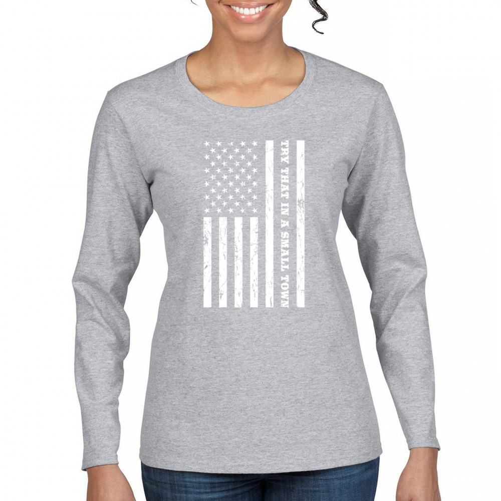 TRY THAT IN A SMALL TOWN GRUNGE AMERICAN FLAG women's long sleeve t-shirt patriotic gray