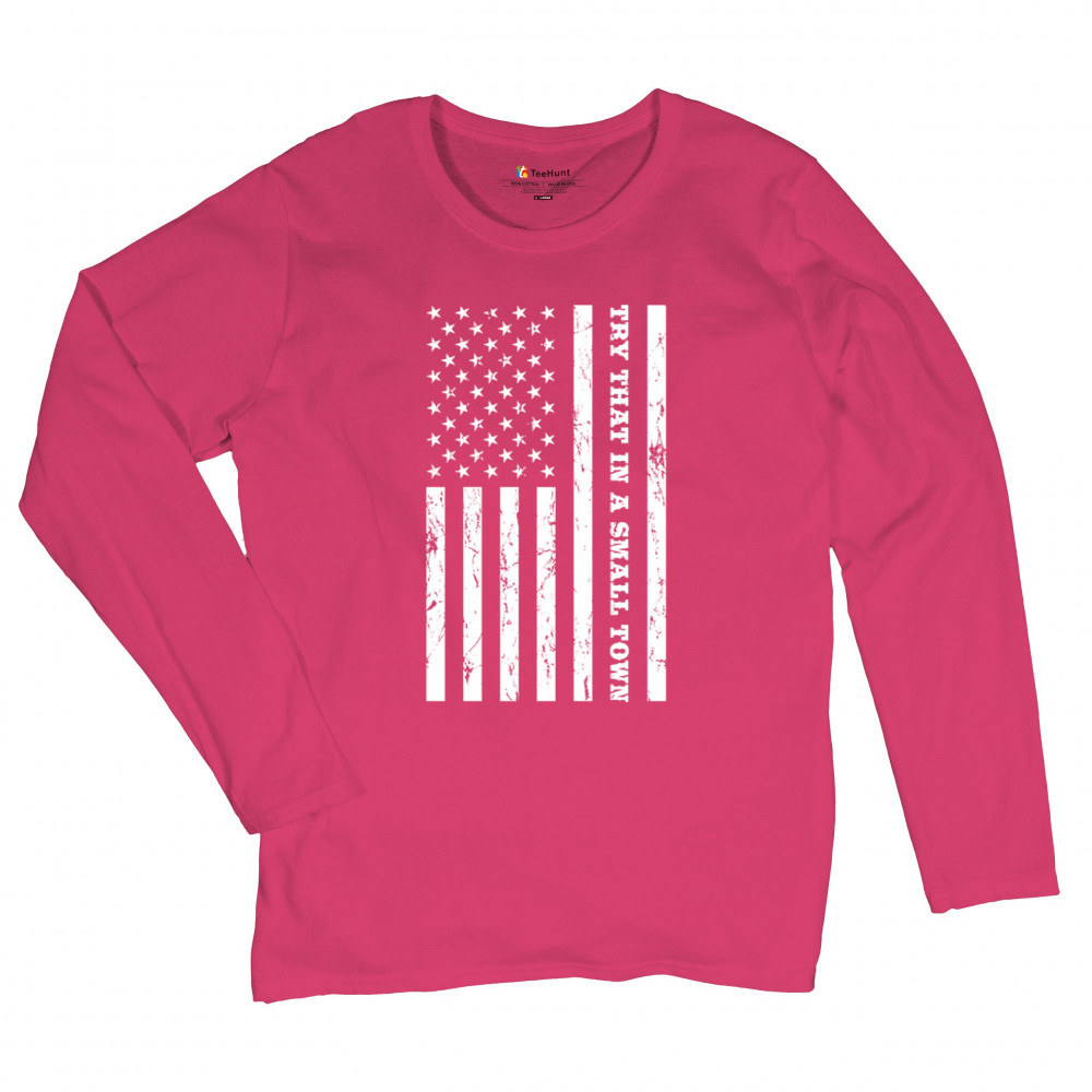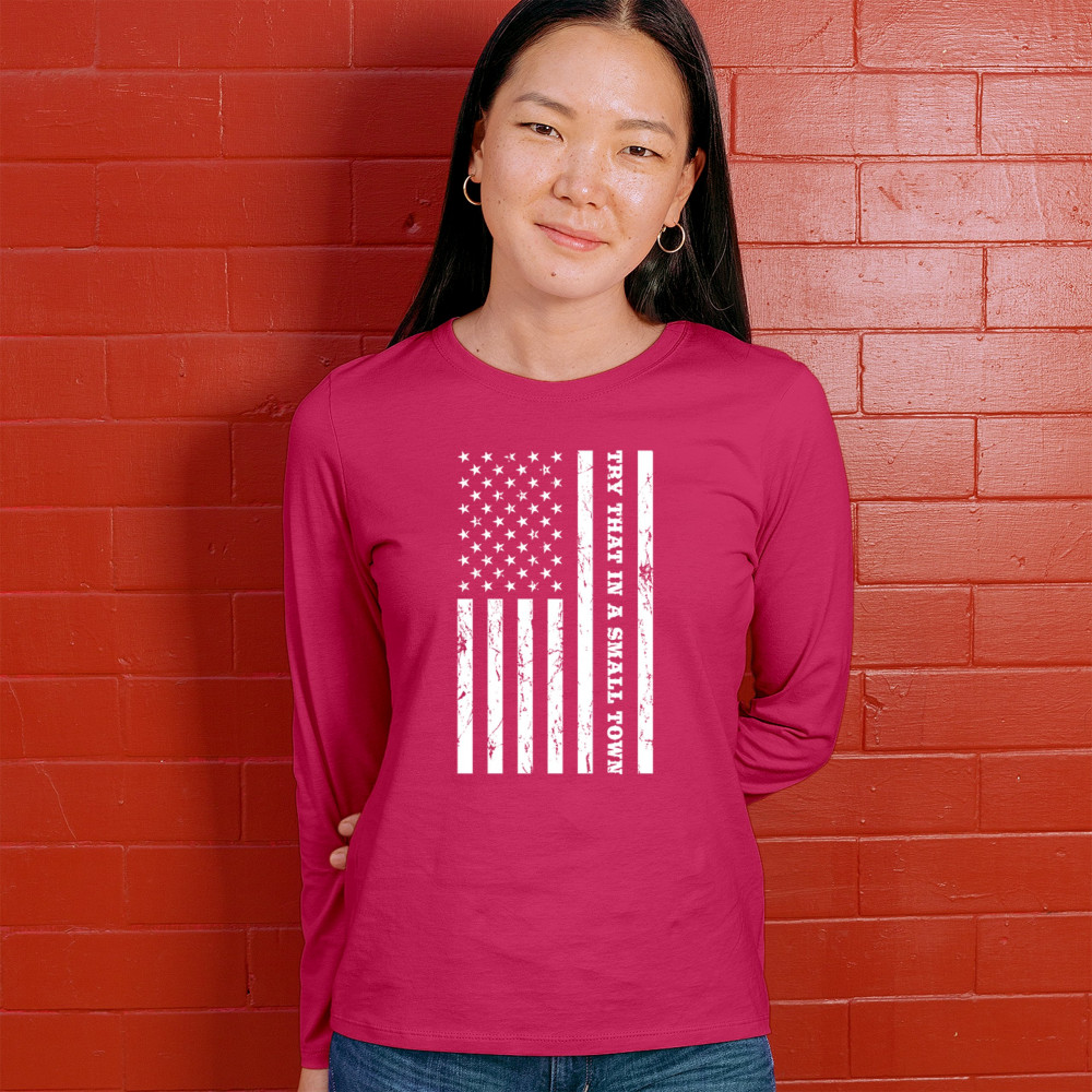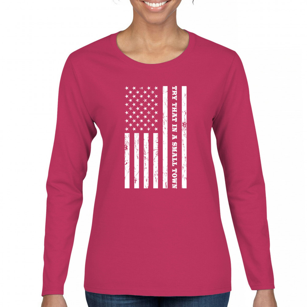 TRY THAT IN A SMALL TOWN GRUNGE AMERICAN FLAG women's long sleeve t-shirt patriotic pink