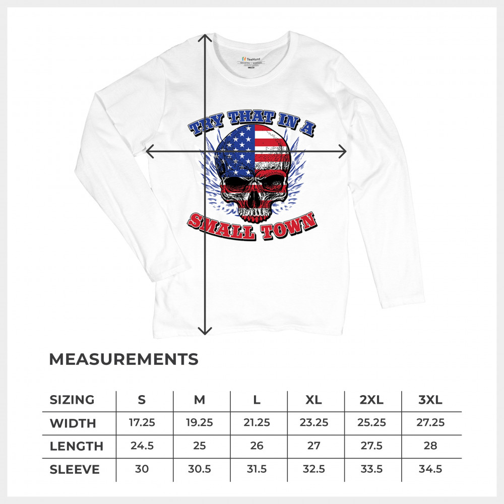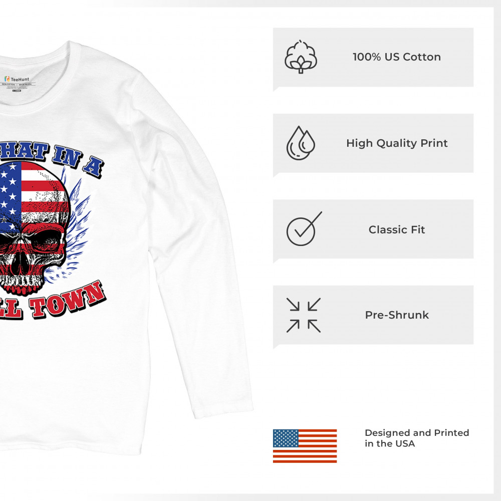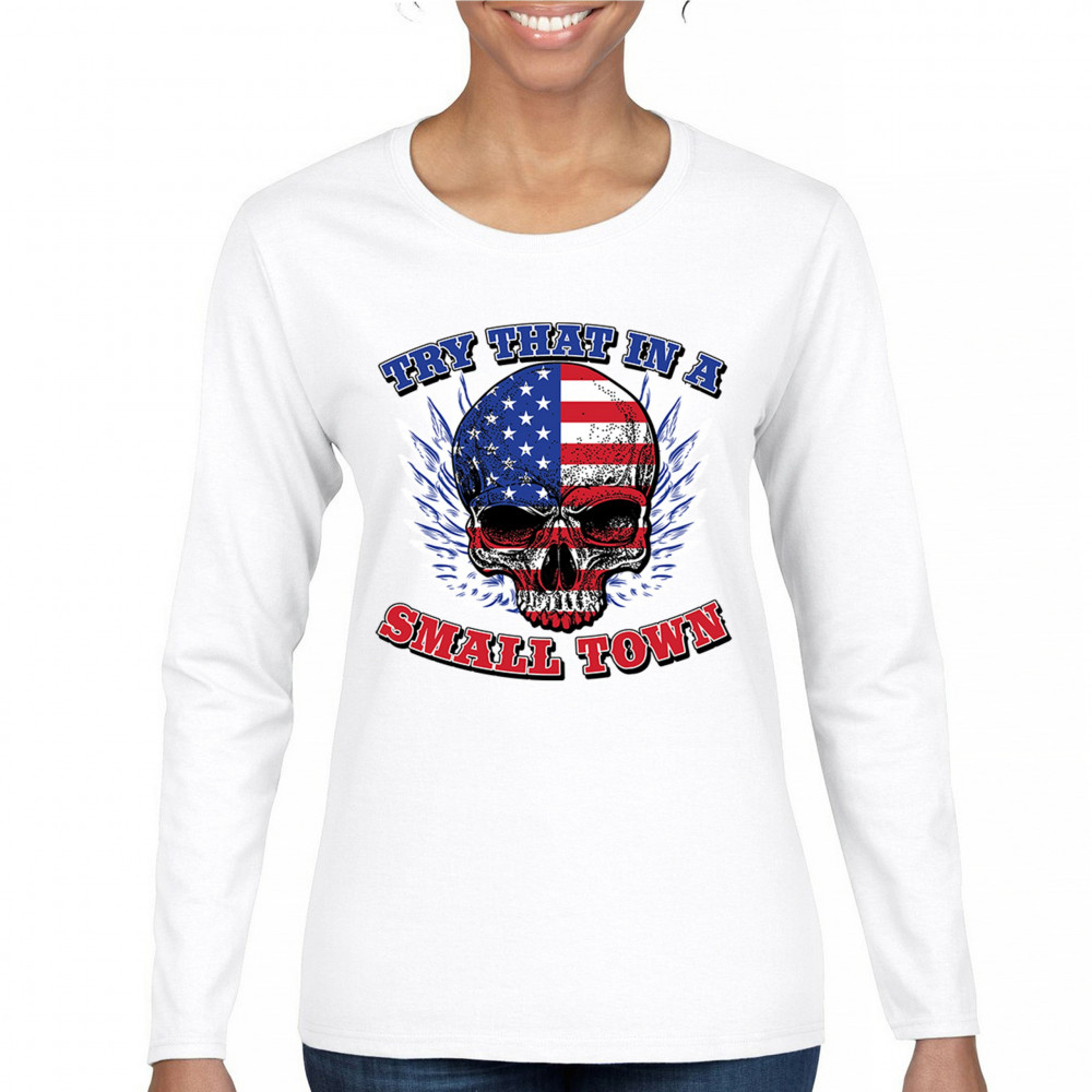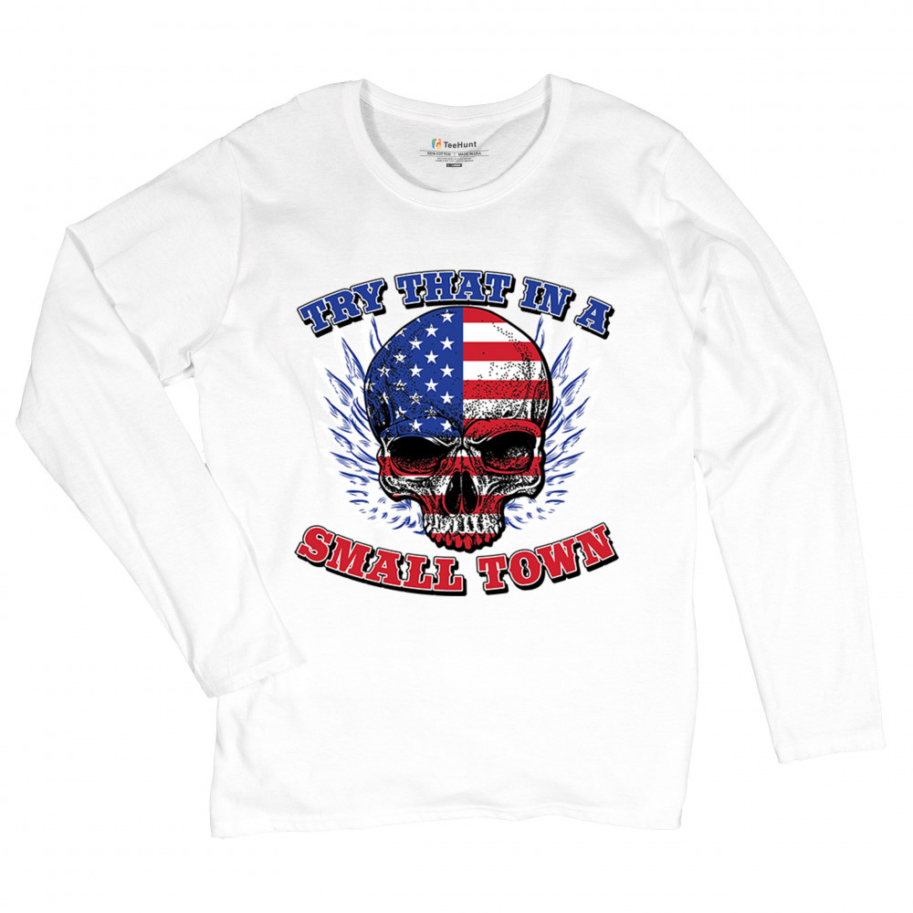 TRY THAT IN A SMALL TOWN women's long sleeve t-shirt american skull patriotic white