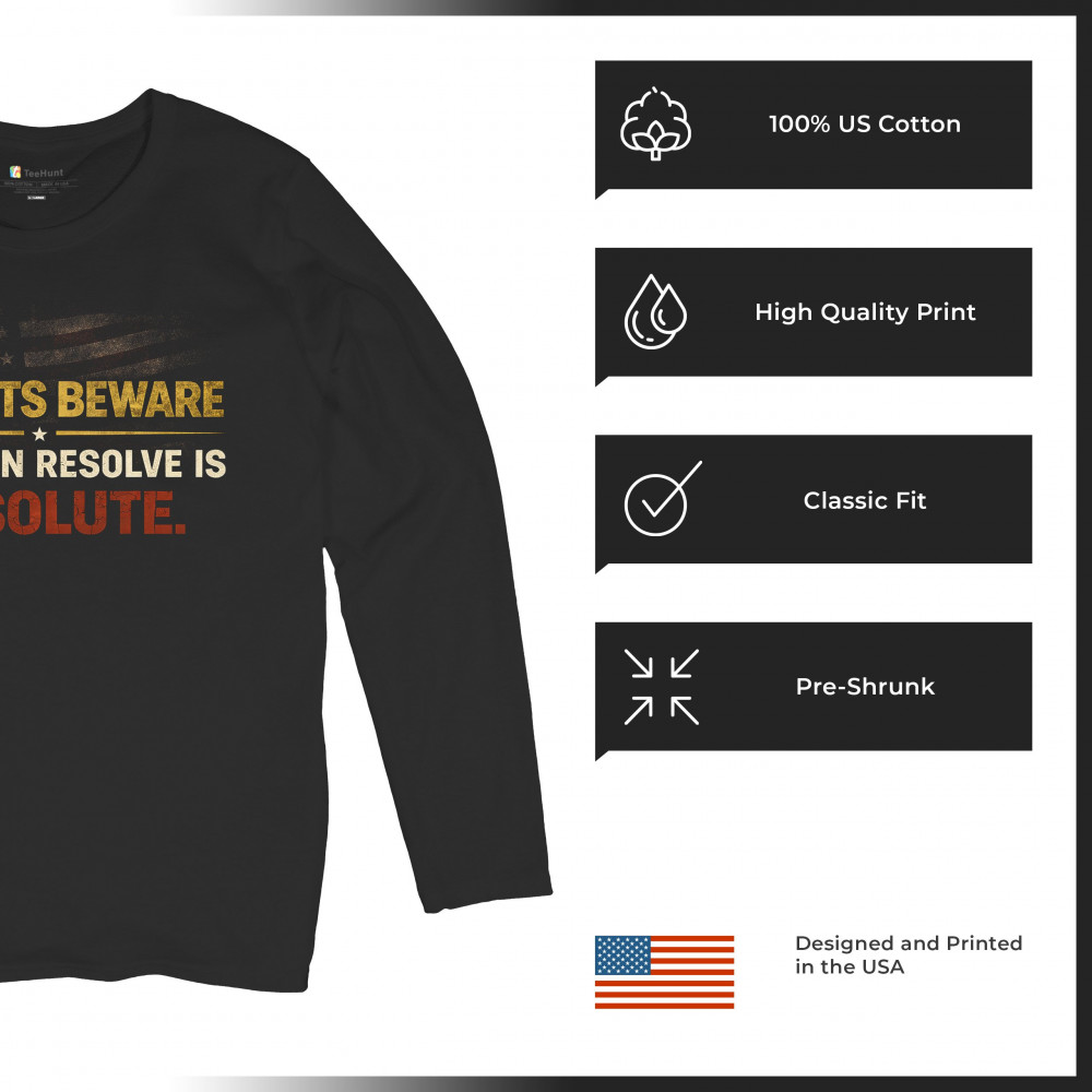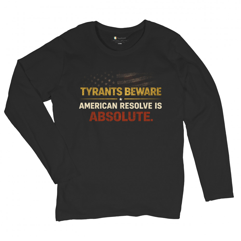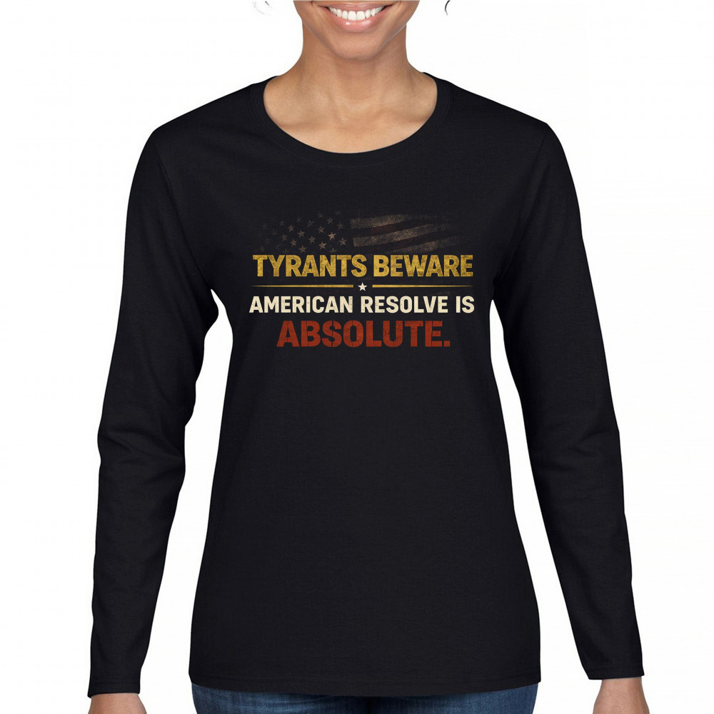 TYRANTS BEWARE AMERICAN RESOLVE IS ABSOLUTE women's long sleeve t-shirt military black