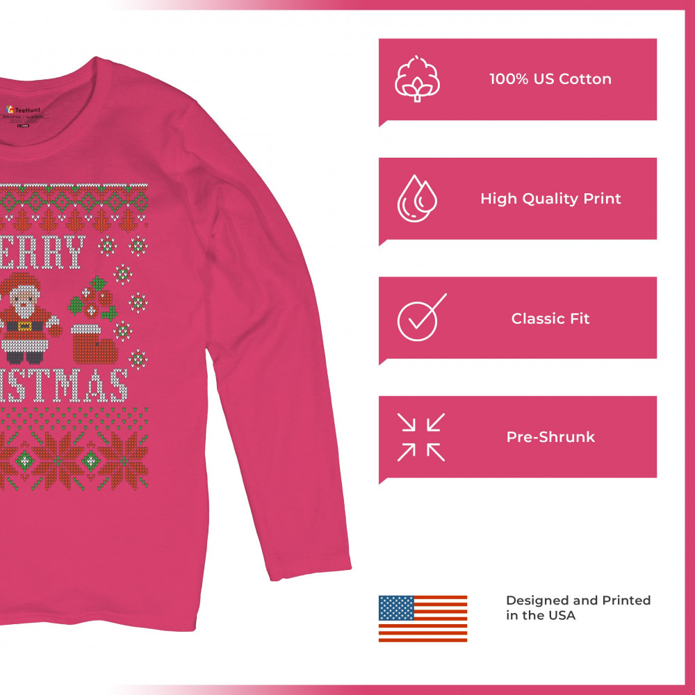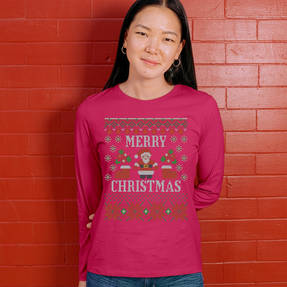 UGLY SWEATER SANTA CLAUS women's long sleeve t-shirt let it snow christmas xmas pink