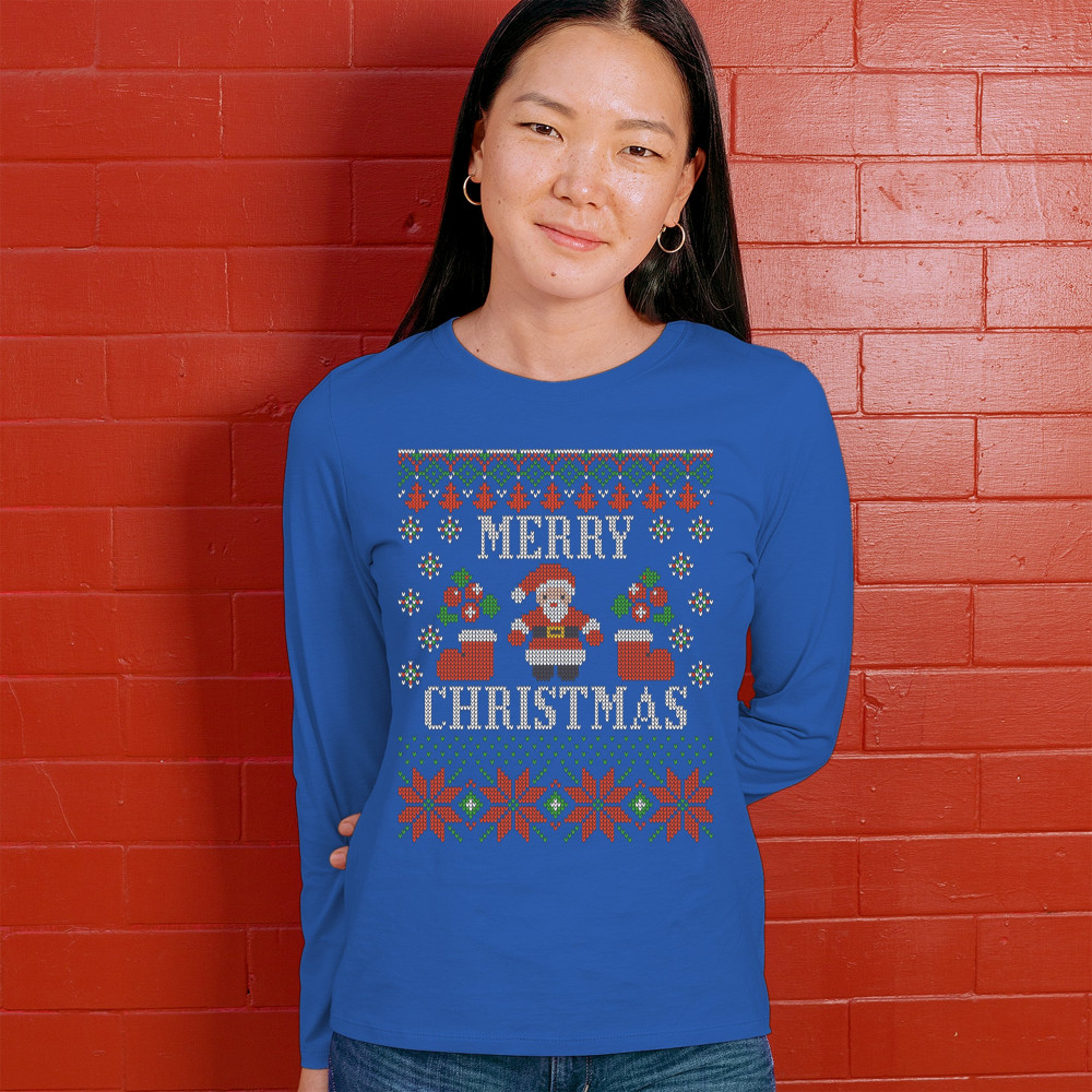 UGLY SWEATER SANTA CLAUS women's long sleeve t-shirt let it snow christmas xmas royal blue