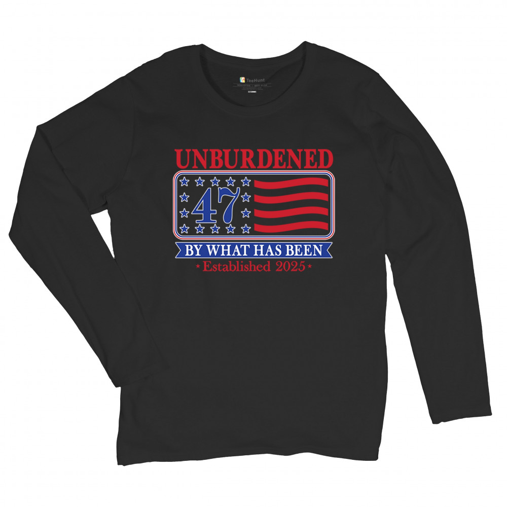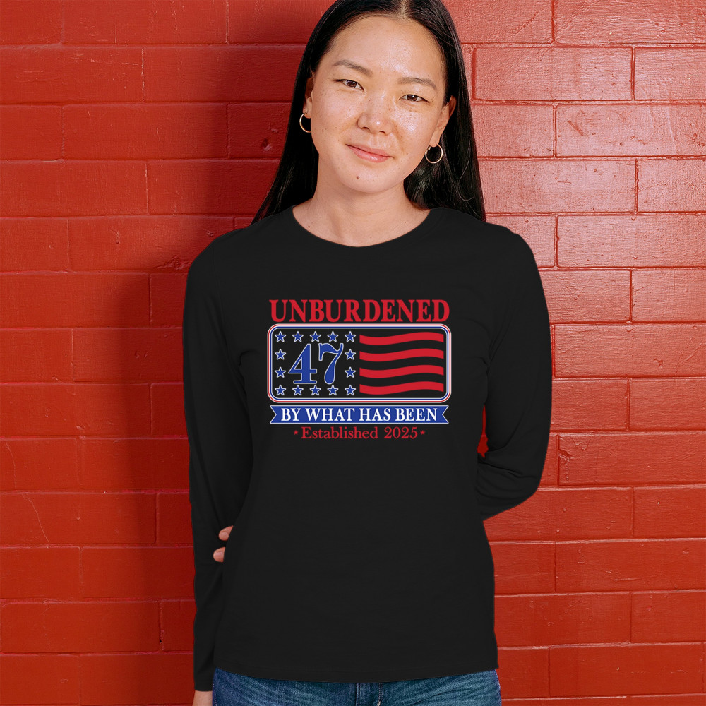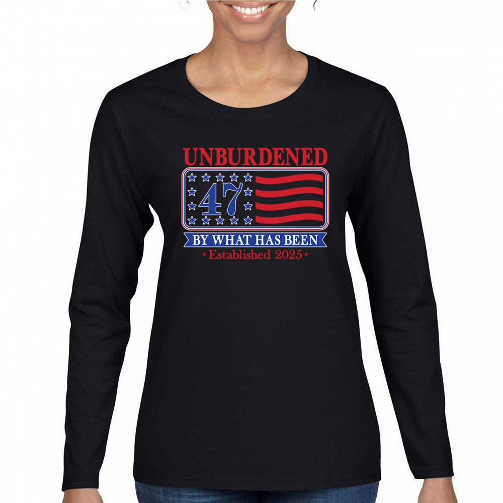 UNBURDENED 47 PATRIOTIC ELECTION women's long sleeve t-shirt red white blue usa black