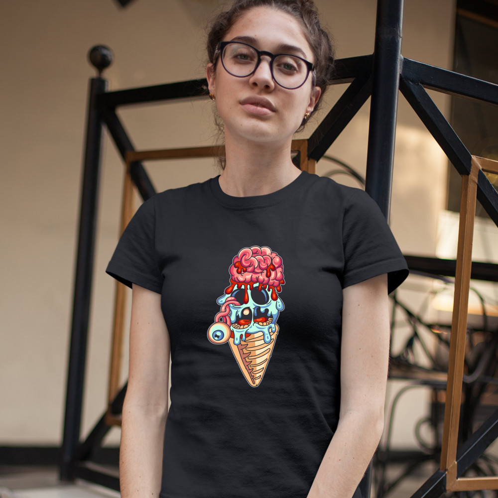 A print featuring an undead ice cream. The ice cream ball looks like a head of a zombie with an eye popping out and hanging and bloodied brains attached on top. A great choice for a person who is into horror movies, haunted houses and freaking people out!