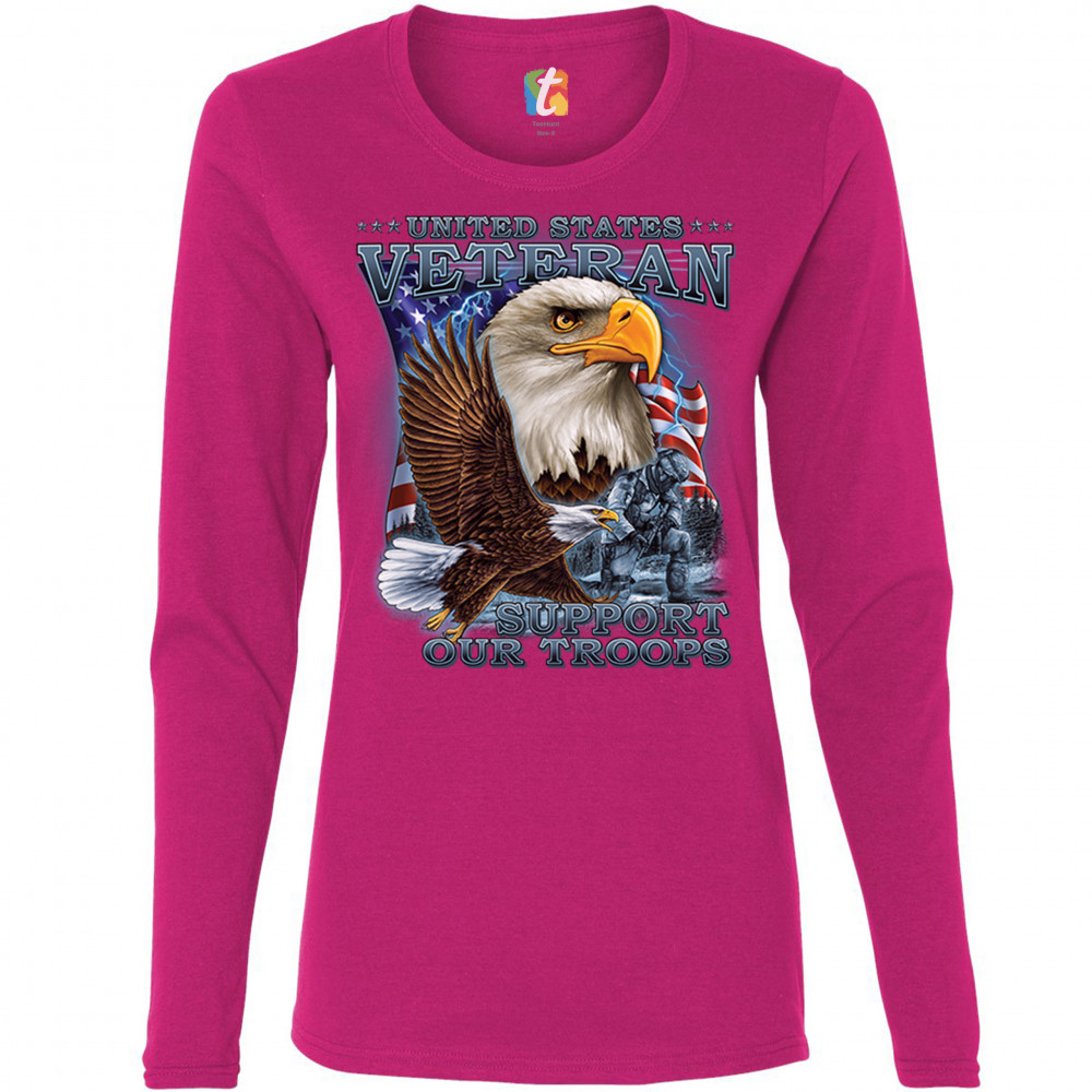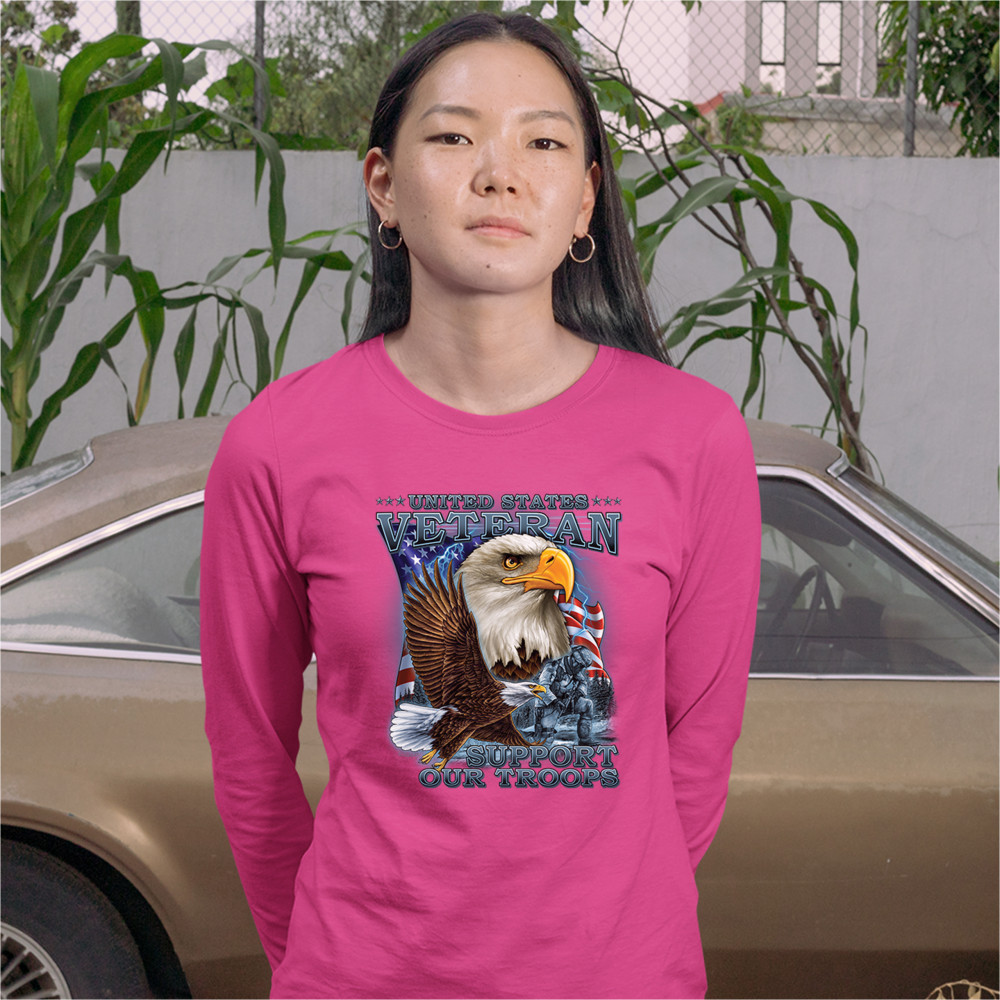 A patriotic print featuring a flying American bald eagle. There is another bald eagle covering most of the American flag in the background. There is a kneeling soldier in the front. The print says: "United States Veteran, Support our Troops". A great choice for a true patriot of the USA