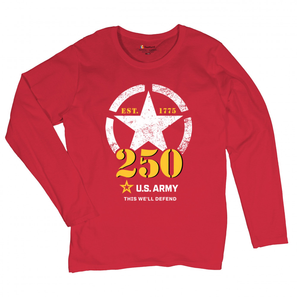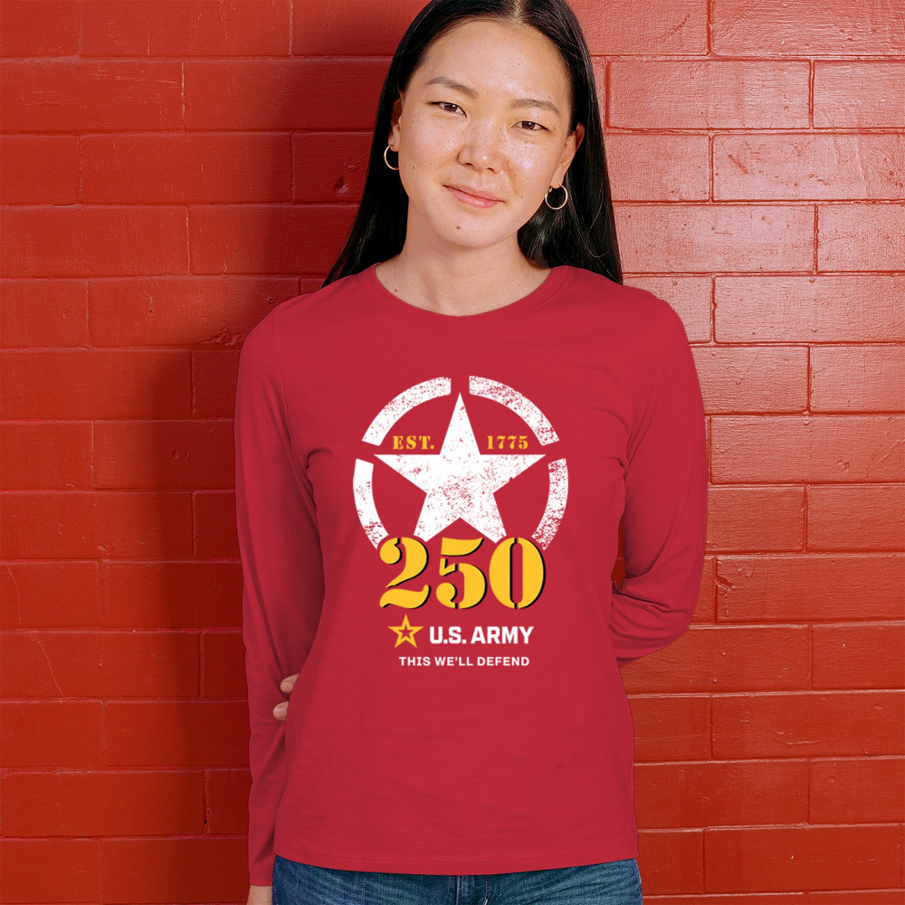 Celebrate 250 years of U.S. Army duty and pride with bold stencil design, EST 1775 mark, and patriotic “This We’ll Defend†motto.