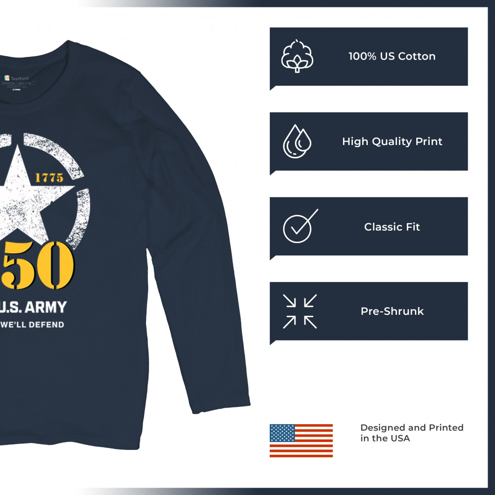 Celebrate 250 years of U.S. Army duty and pride with bold stencil design, EST 1775 mark, and patriotic “This We’ll Defend†motto.