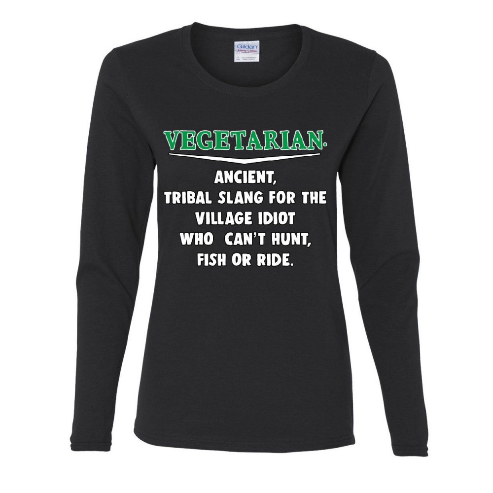VEGETARIAN - VILLAGE IDIOT vegetarian definition women's long sleeve tee offensive village idiot vegan meat black
