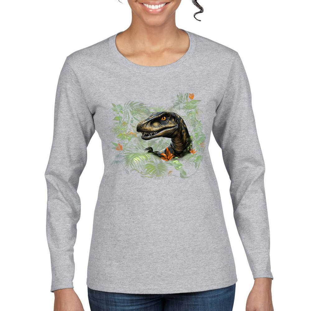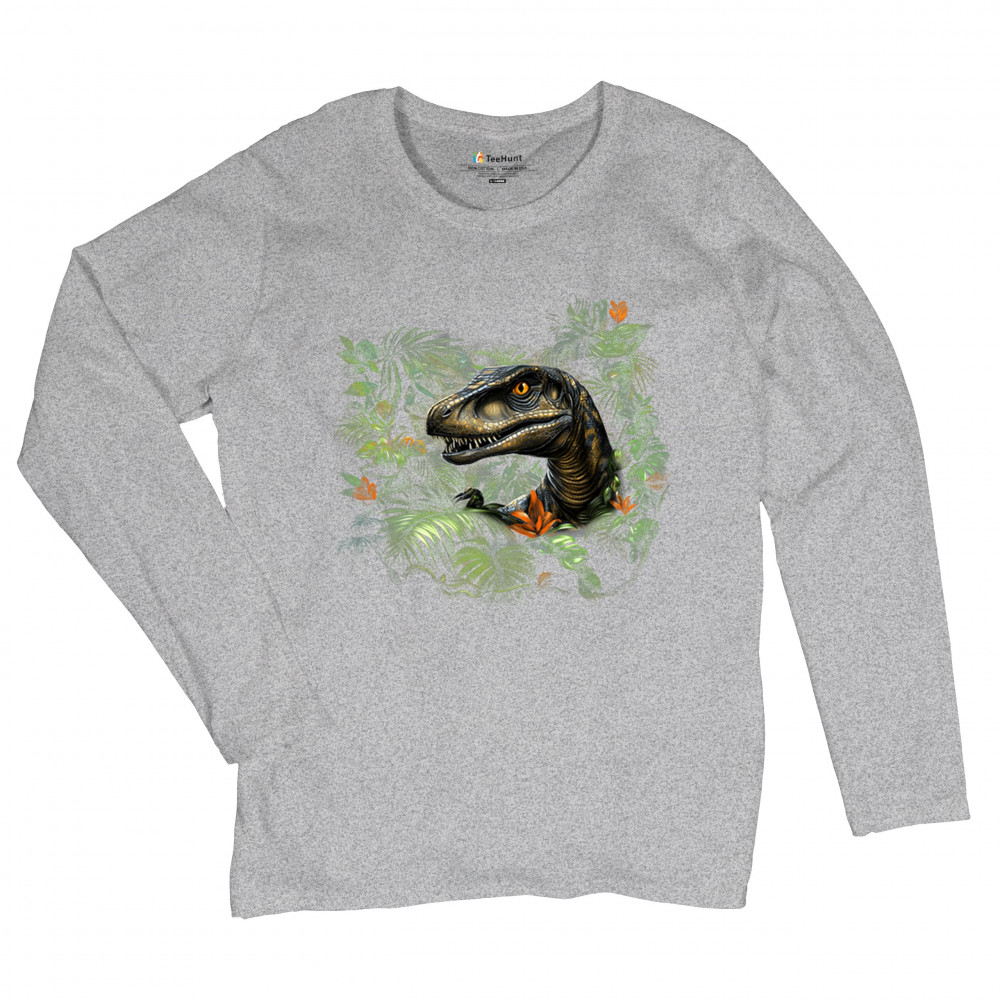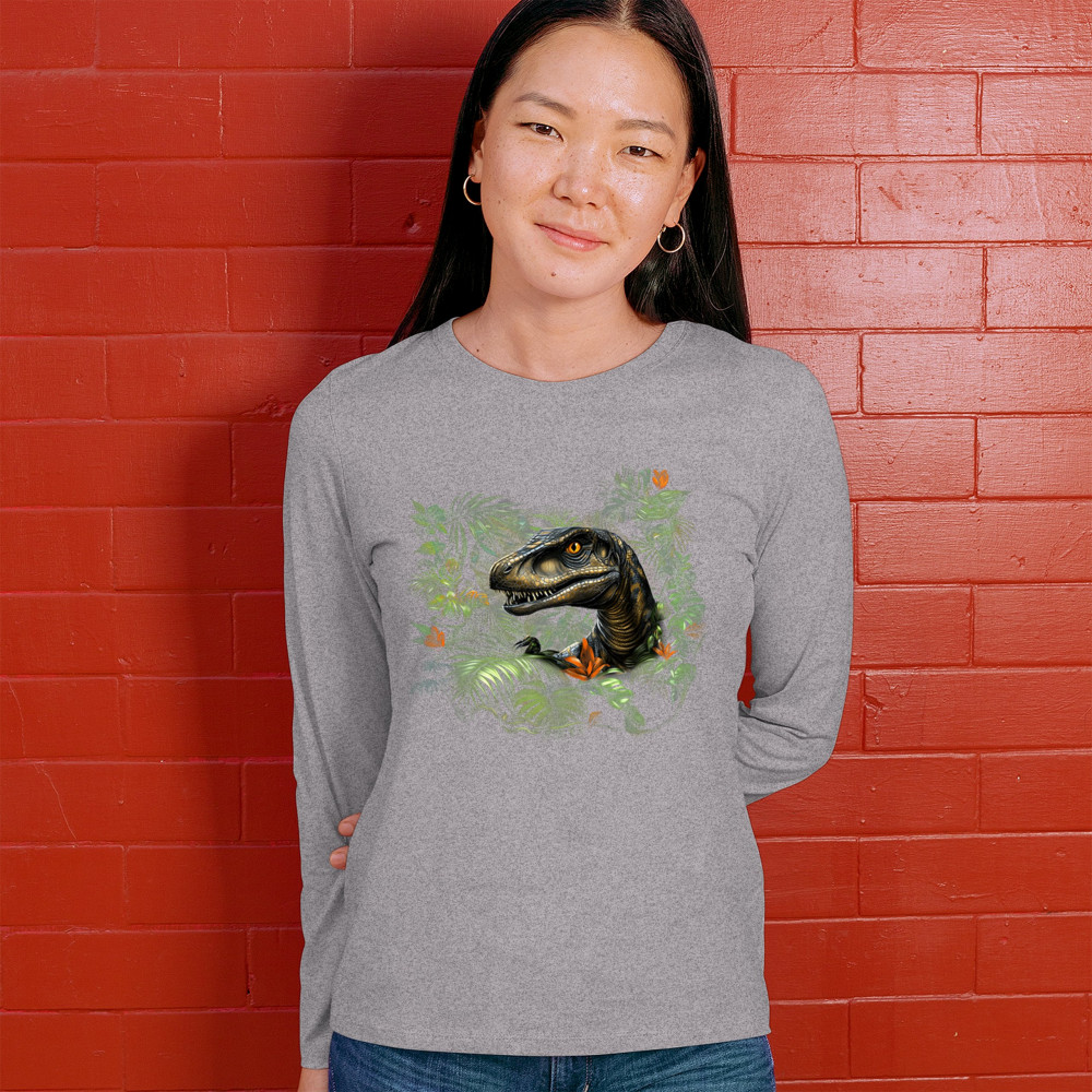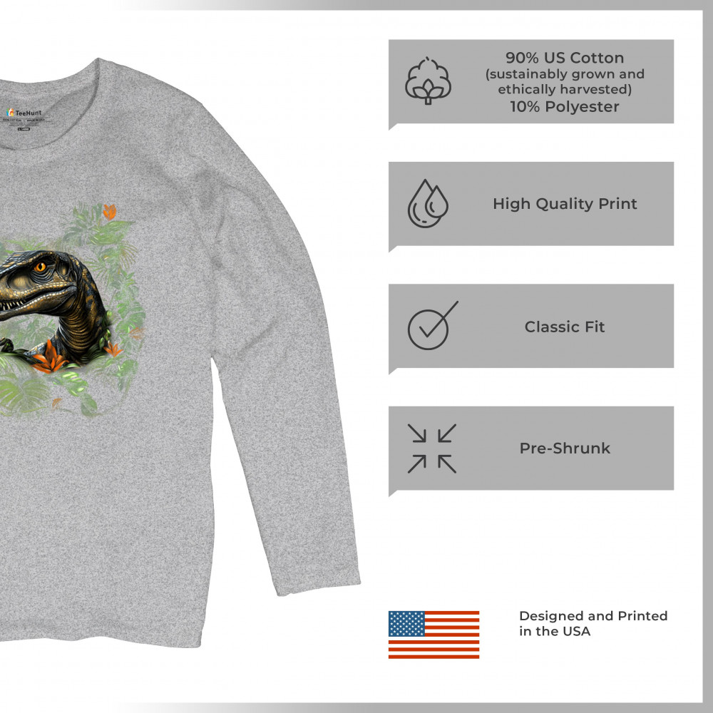 Step into the wild with this striking jungle raptor design. A highly detailed velociraptor peeks from vivid tropical foliage and flowers, perfect for dinosaur lovers, fossil fans, and ancient creature enthusiasts. Whether for Jurassic adventures, museum trips, or themed events, this design unleashes untamed prehistoric energy.