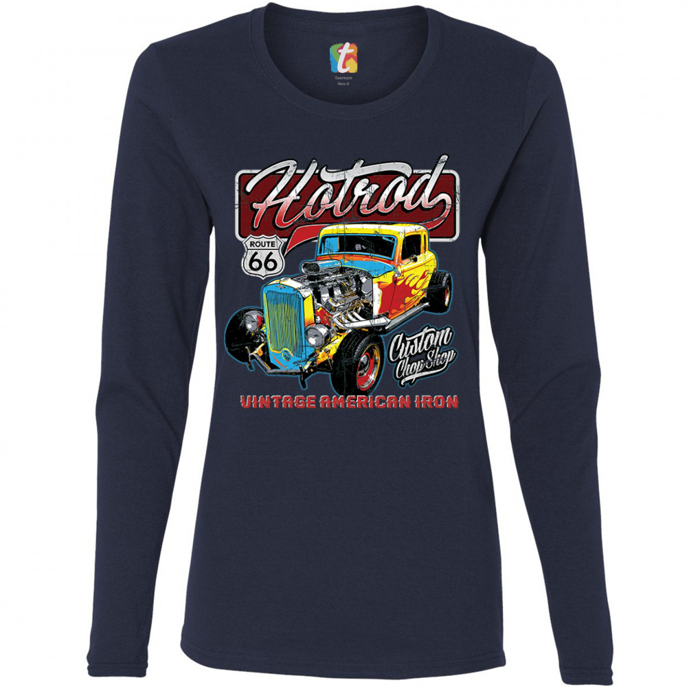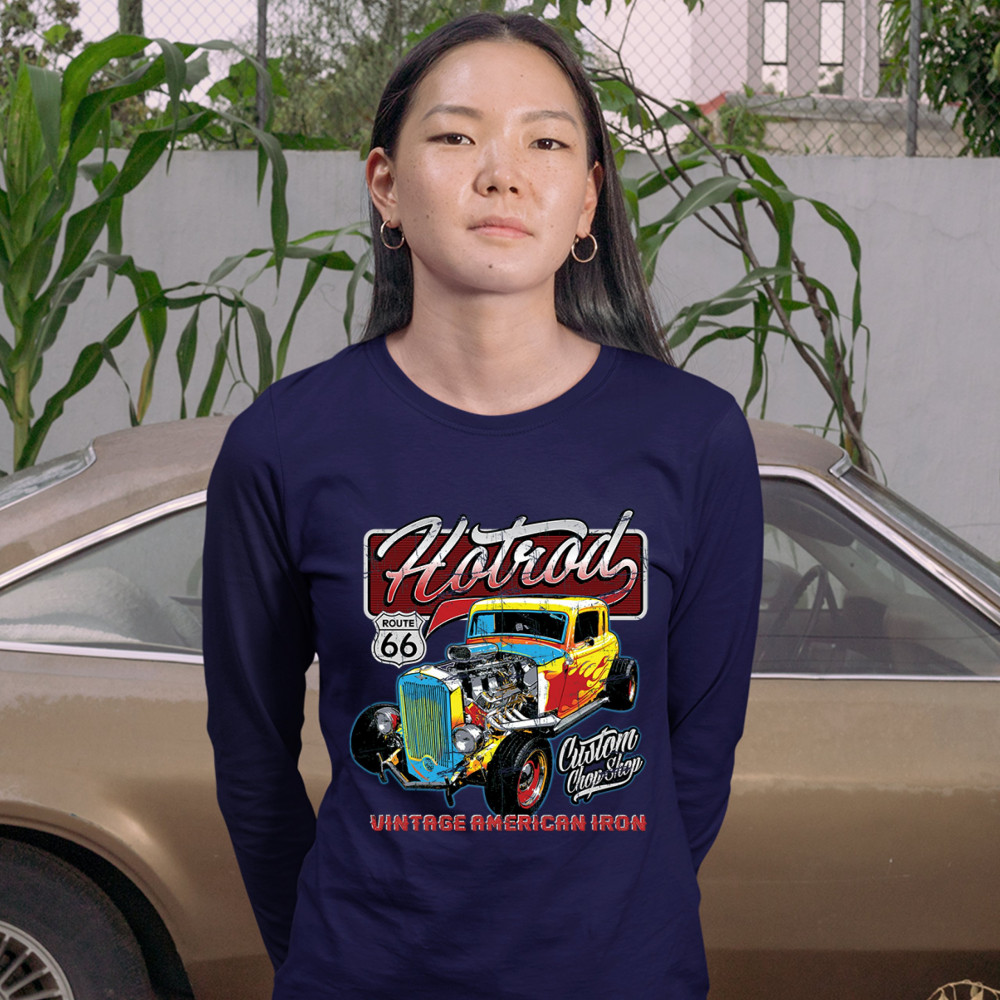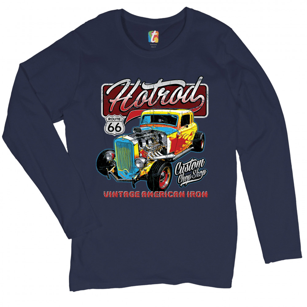 VINTAGE AMERICAN IRON women's long sleeve t-shirt hot rod route 66 retro racing navy blue