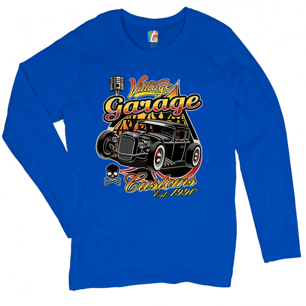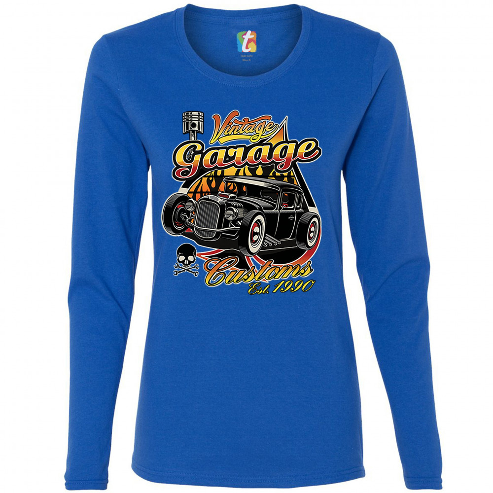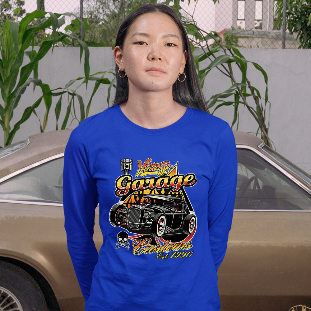 VINTAGE GARAGE CUSTOMS EST. 1990 women's long sleeve t-shirt old school hot rod royal blue