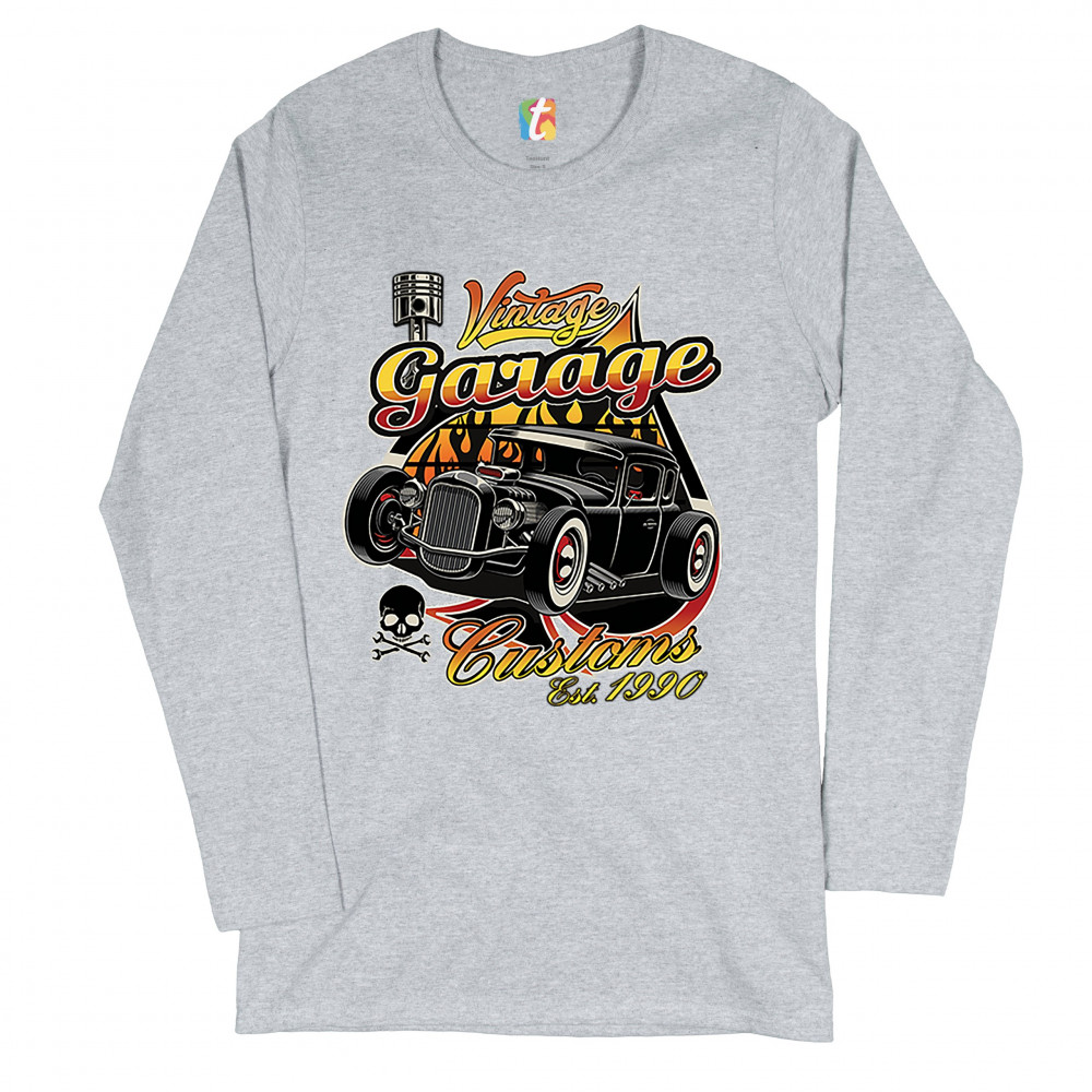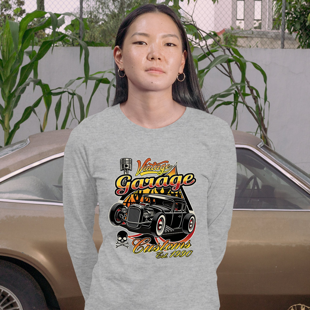 A print featuring a lowrider hot rod, a small skull with crossed wrenches instead of bones, a piston and an ace of spades in the background. The orint says: "Vintage Garage Customs Est. 1990". A great choice for a fan of customized American classic cars a