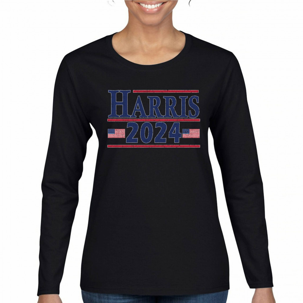 Show your support for Kamala Harris with this bold "Harris 2024" t-shirt, featuring American flags. Perfect for rallies and events. Join the movement today!
