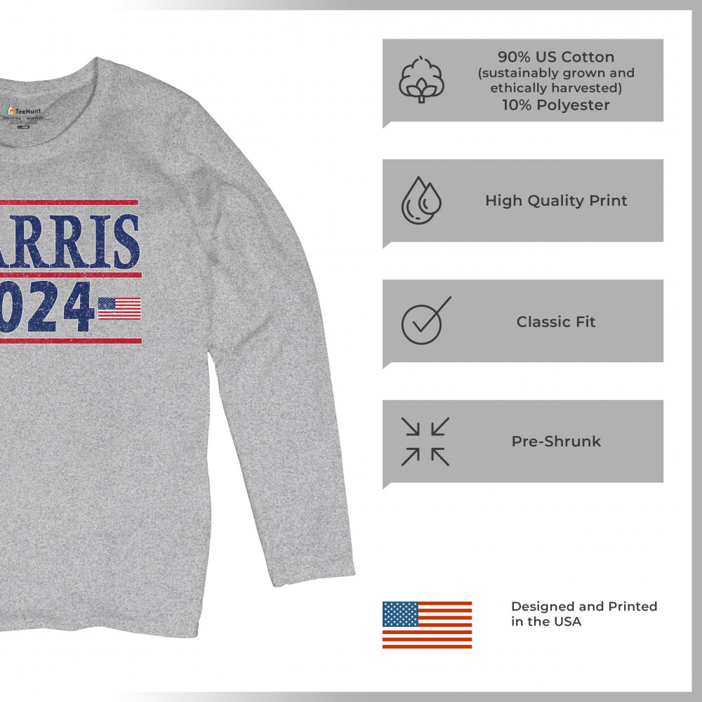 Show your support for Kamala Harris with this bold "Harris 2024" t-shirt, featuring American flags. Perfect for rallies and events. Join the movement today!