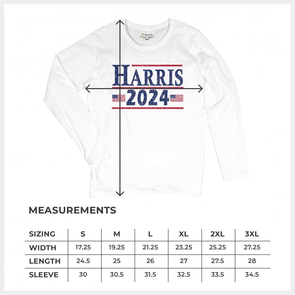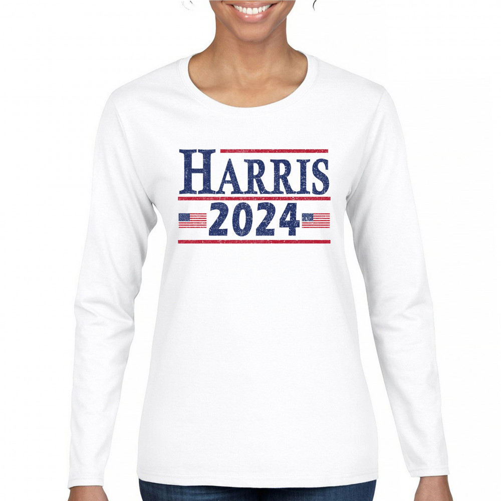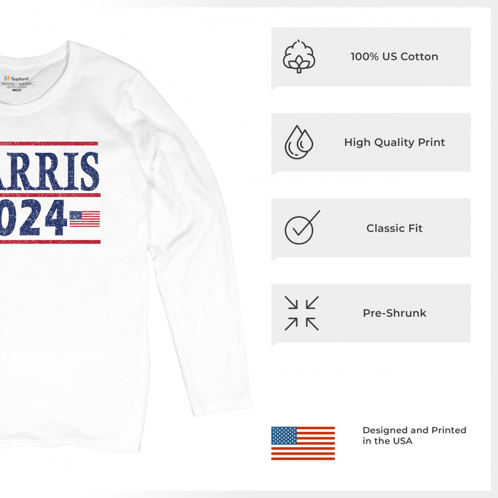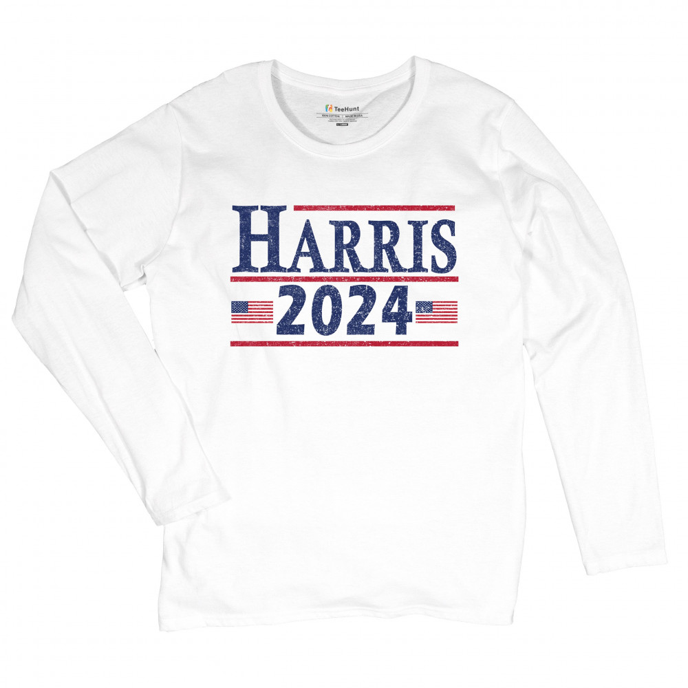 Show your support for Kamala Harris with this bold "Harris 2024" t-shirt, featuring American flags. Perfect for rallies and events. Join the movement today!