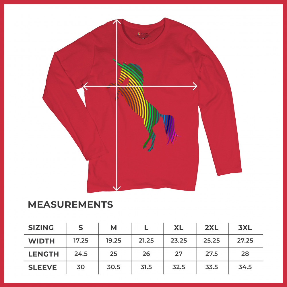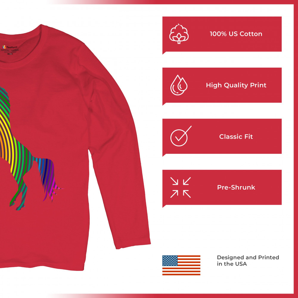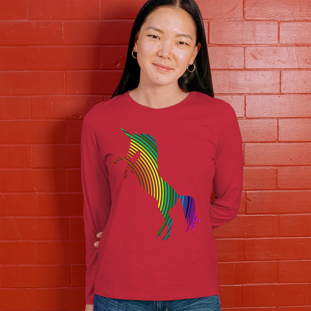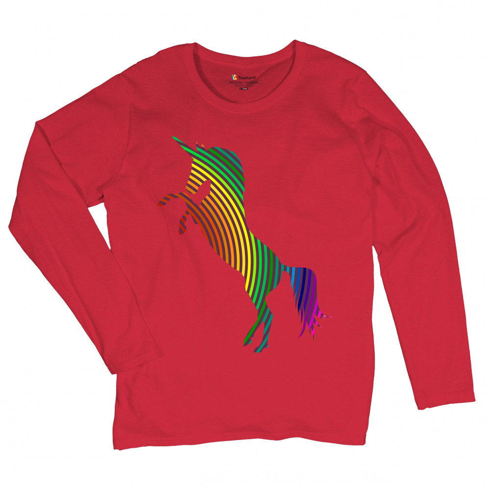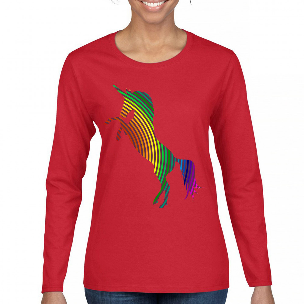 VIVID RAINBOW-STRIPE REARING unicorn women's long sleeve t-shirt lgbt gay pride red