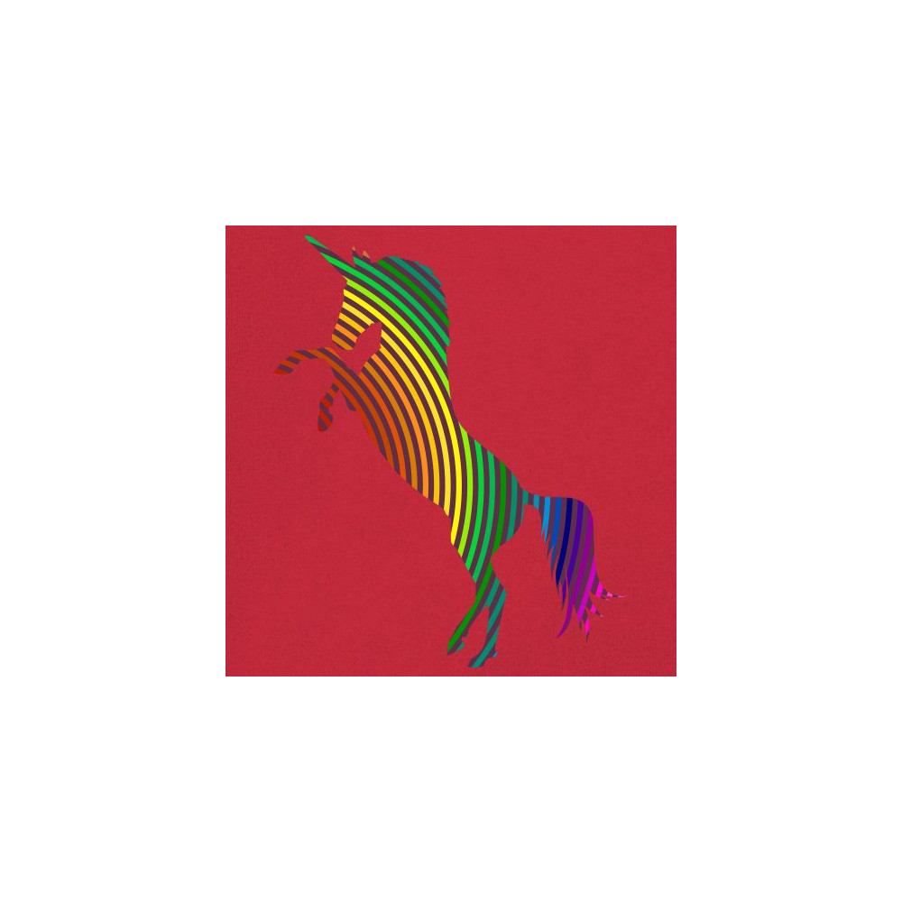 The print depicts a strong rearing unicorn. The unicorn is painted in vivid rainbow-stripe colors. This can symbolize a strong spirit of the sexual and gender minority.