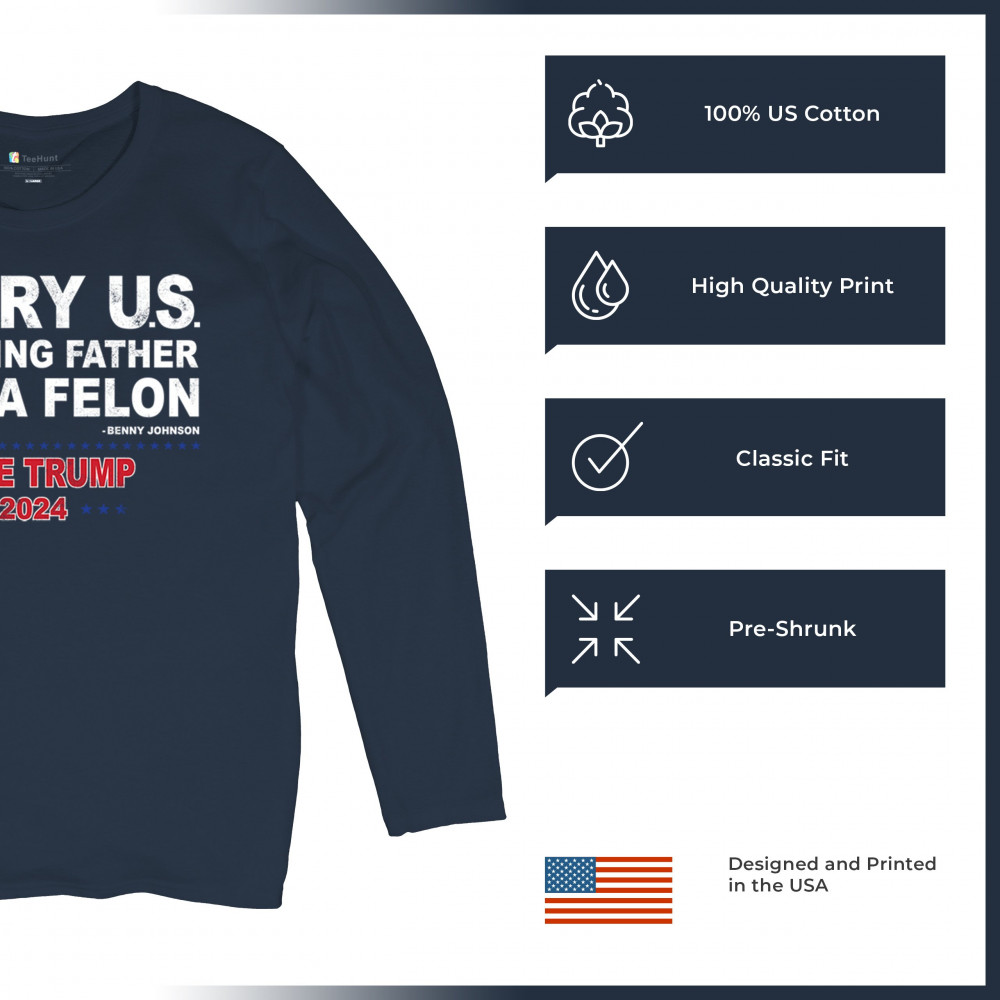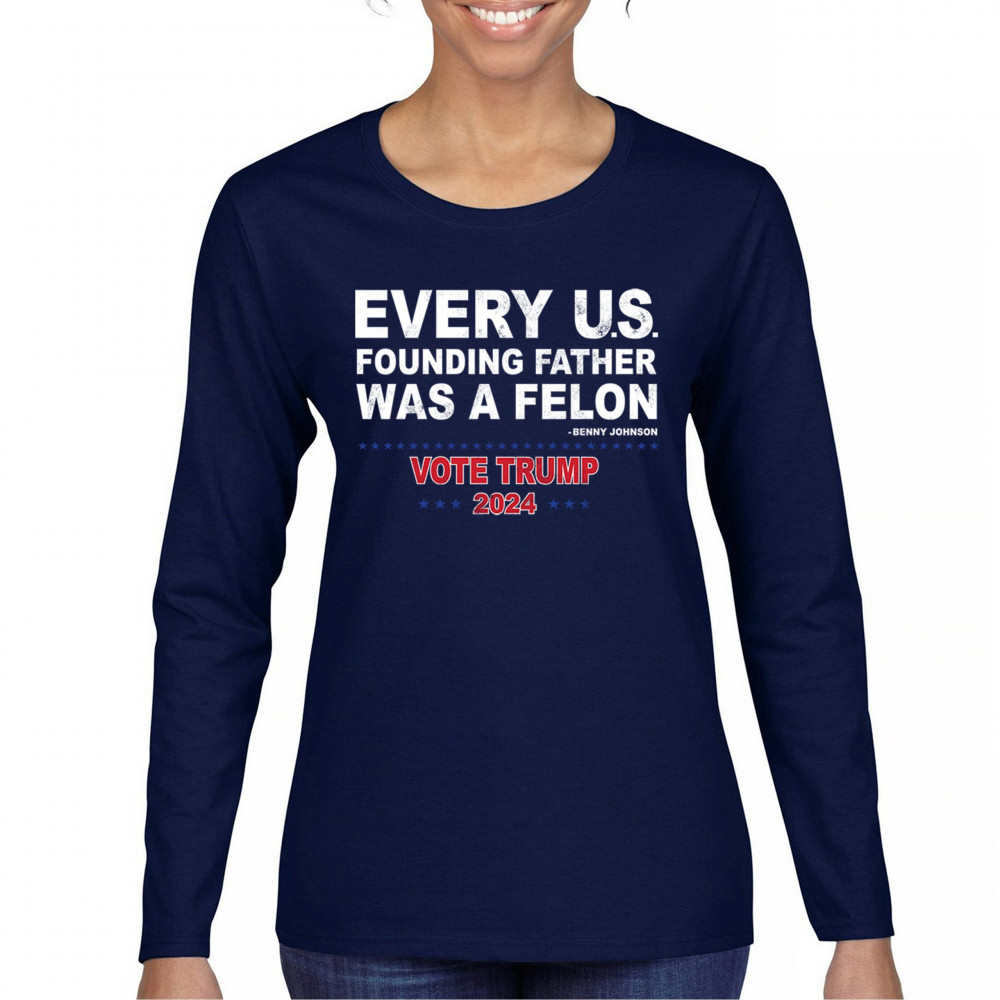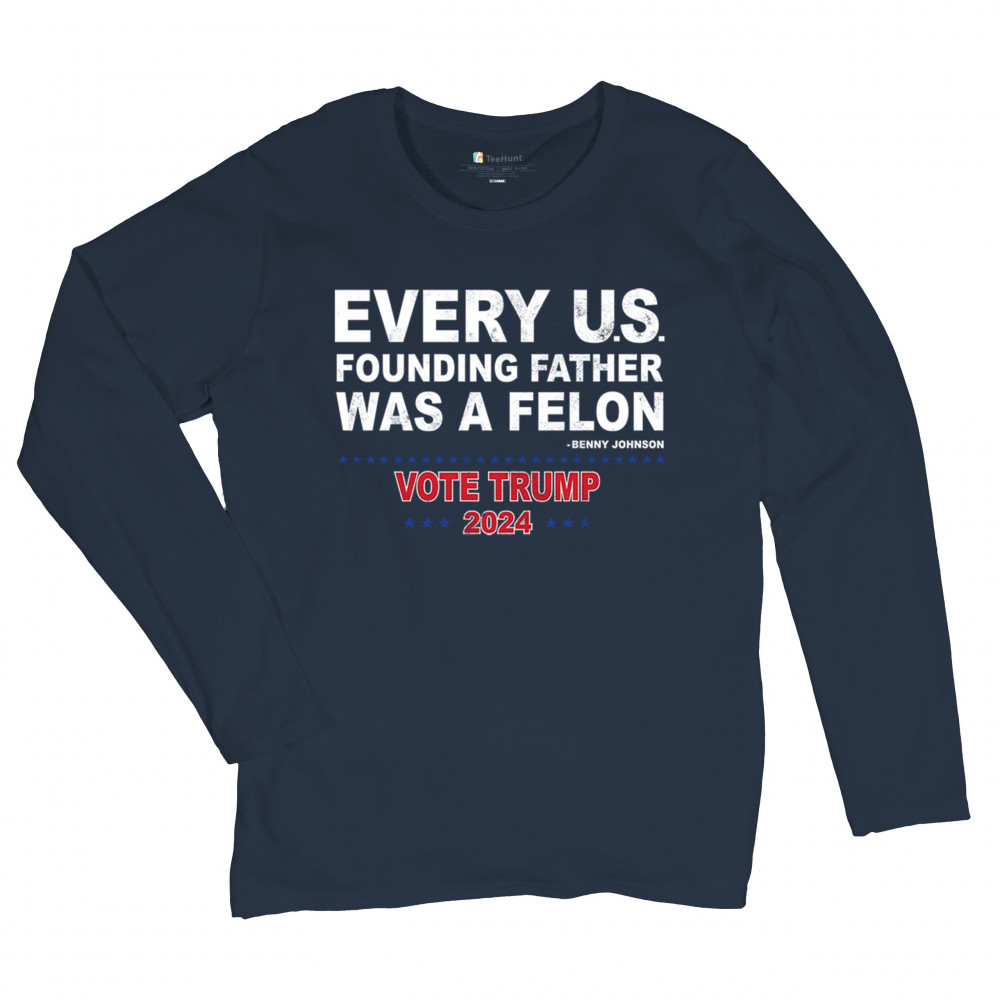 Show your support for Trump 2024 with a bold design quoting "Every U.S. founding father was a felon." Stand against political attacks and support an America-first vision.