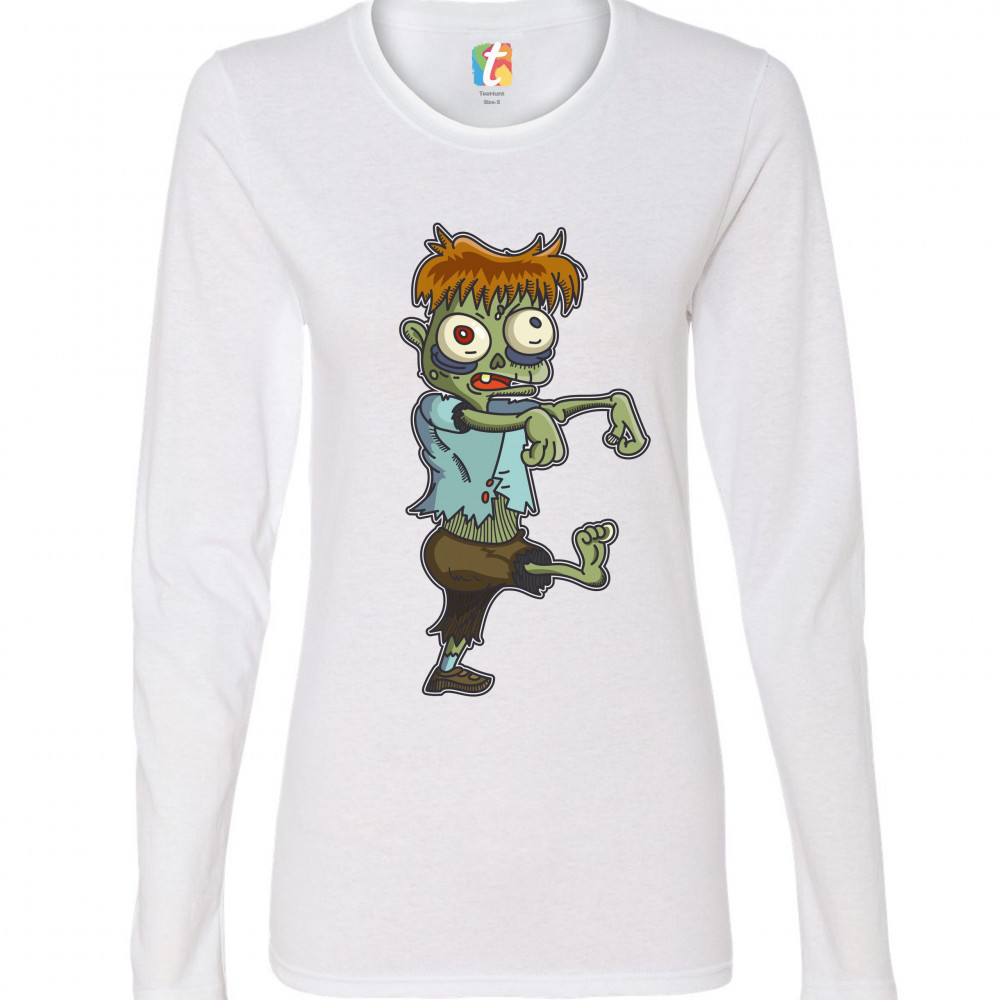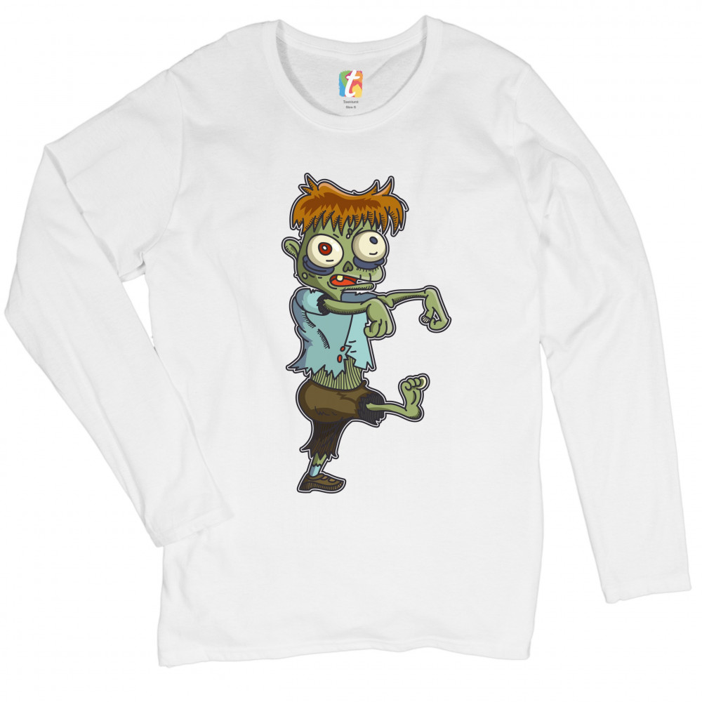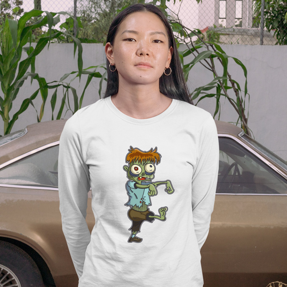 A print featuring a zombie, walking in a stereotypical movie fashion with the arms extended forward. The zombie has messy ginger hair and eyes popping out but he looks rather funny and non-threatening. A great choice for a person who is into horror movies