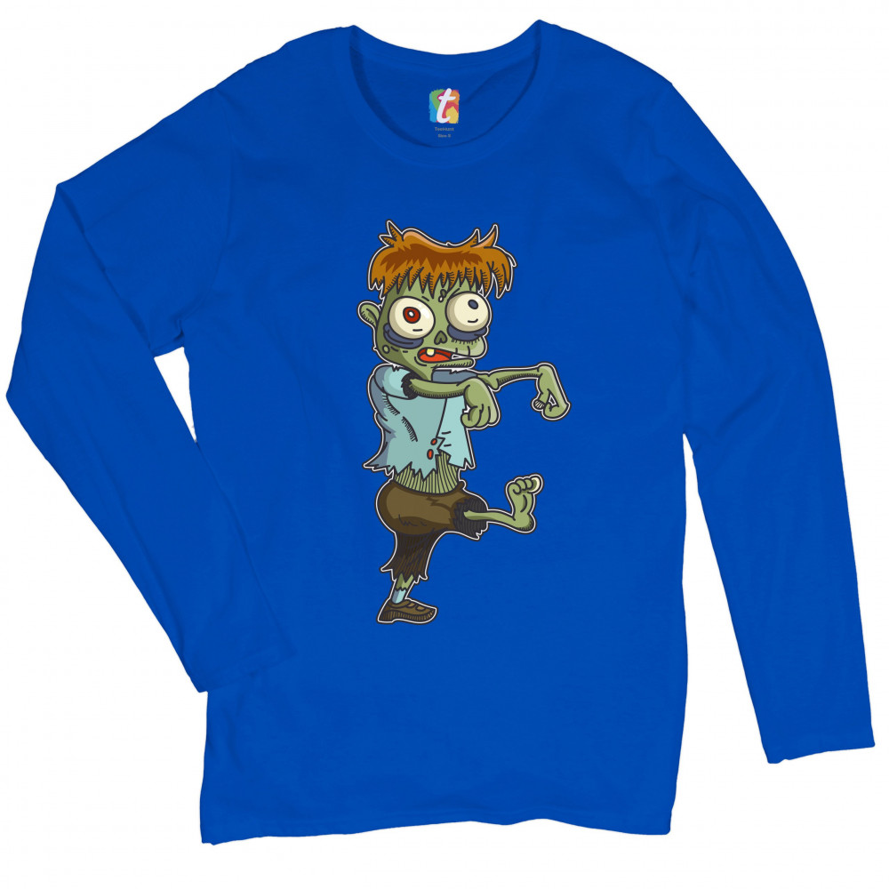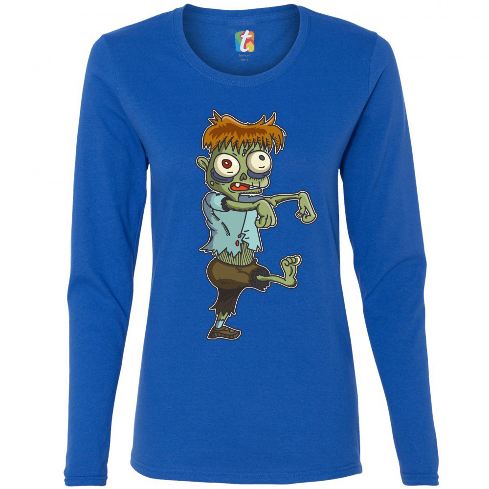 WALKING ZOMBIE women's long sleeve t-shirt eat brains halloween spooky undead royal blue