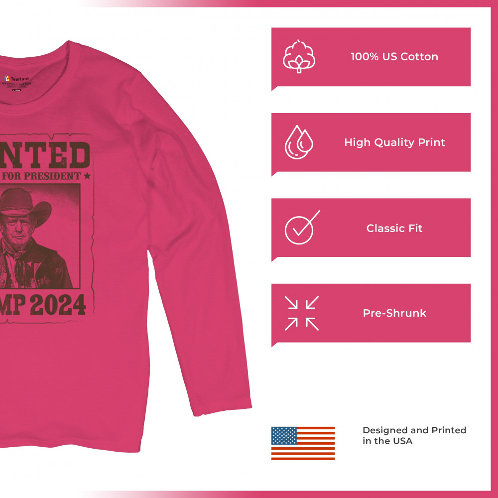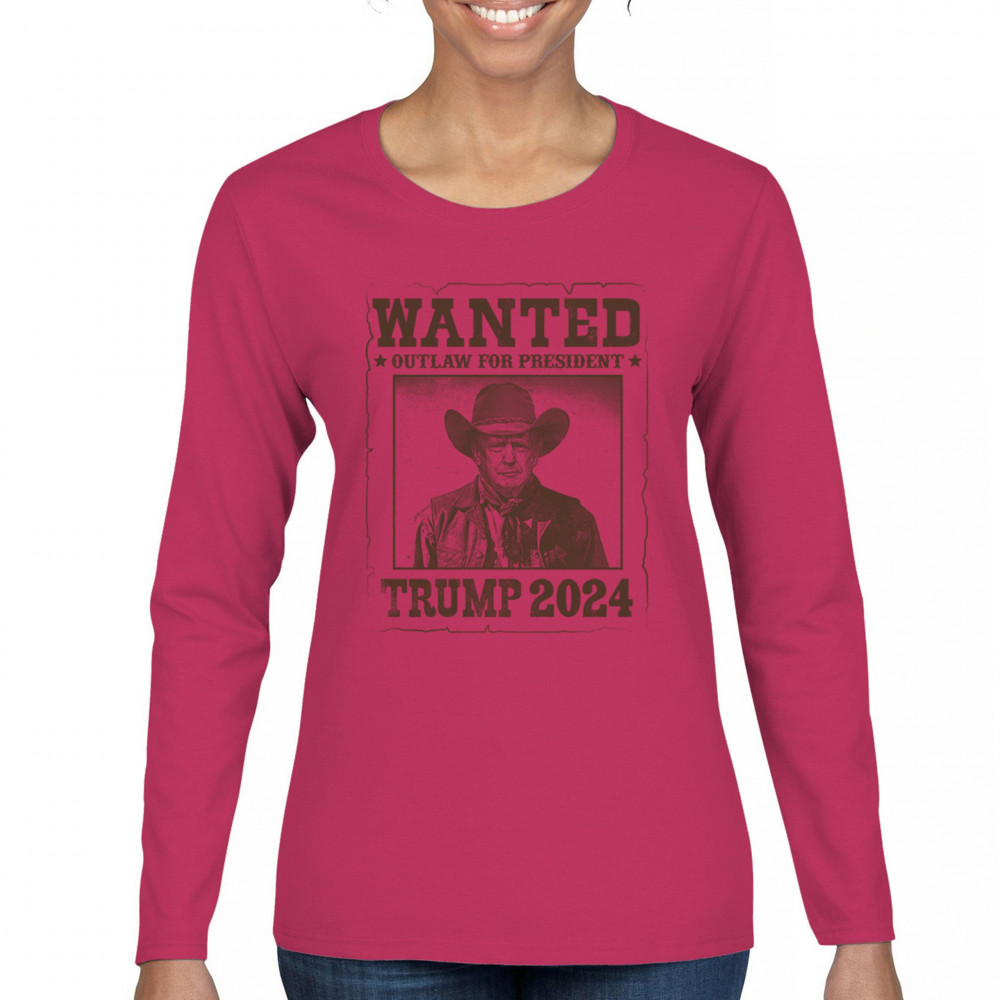 Bold "Wanted: Outlaw for President" design featuring Trump in cowboy attire, perfect for rally-goers and supporters. Express your support for the 2024 election.
