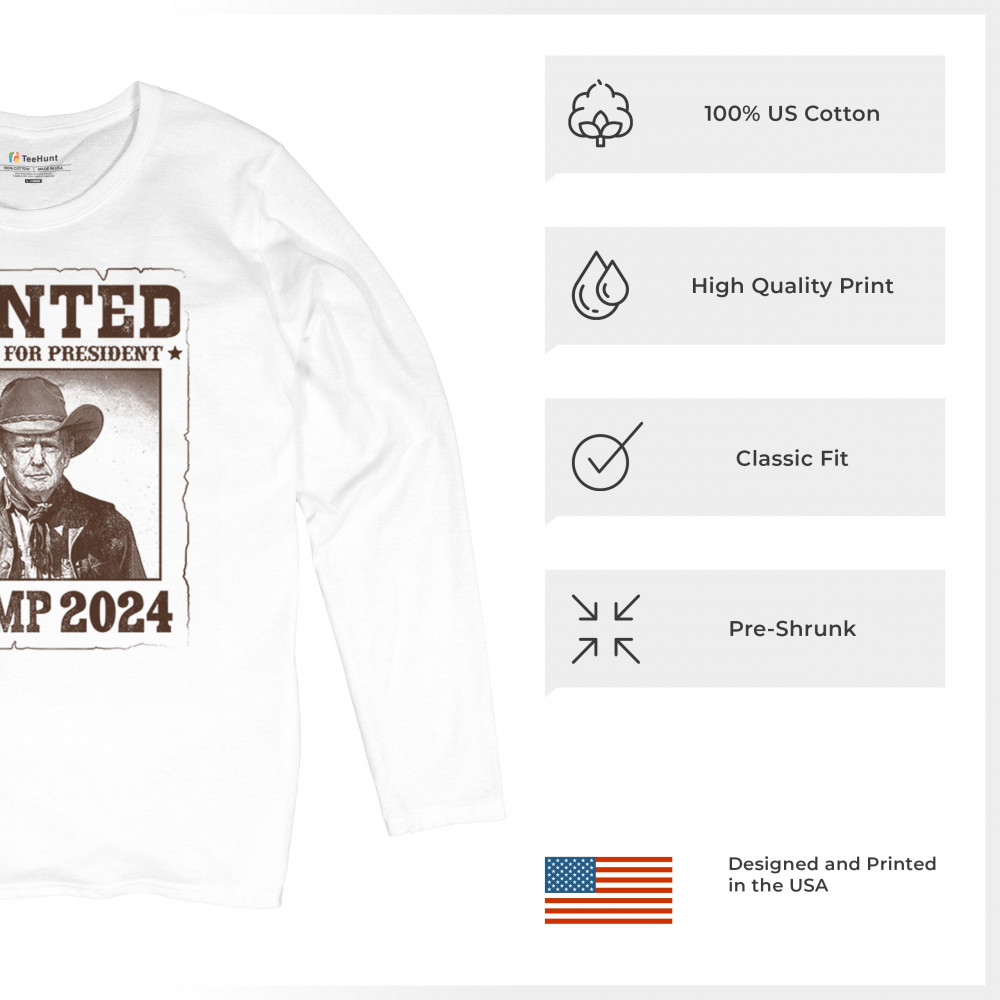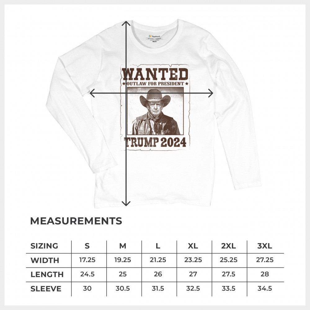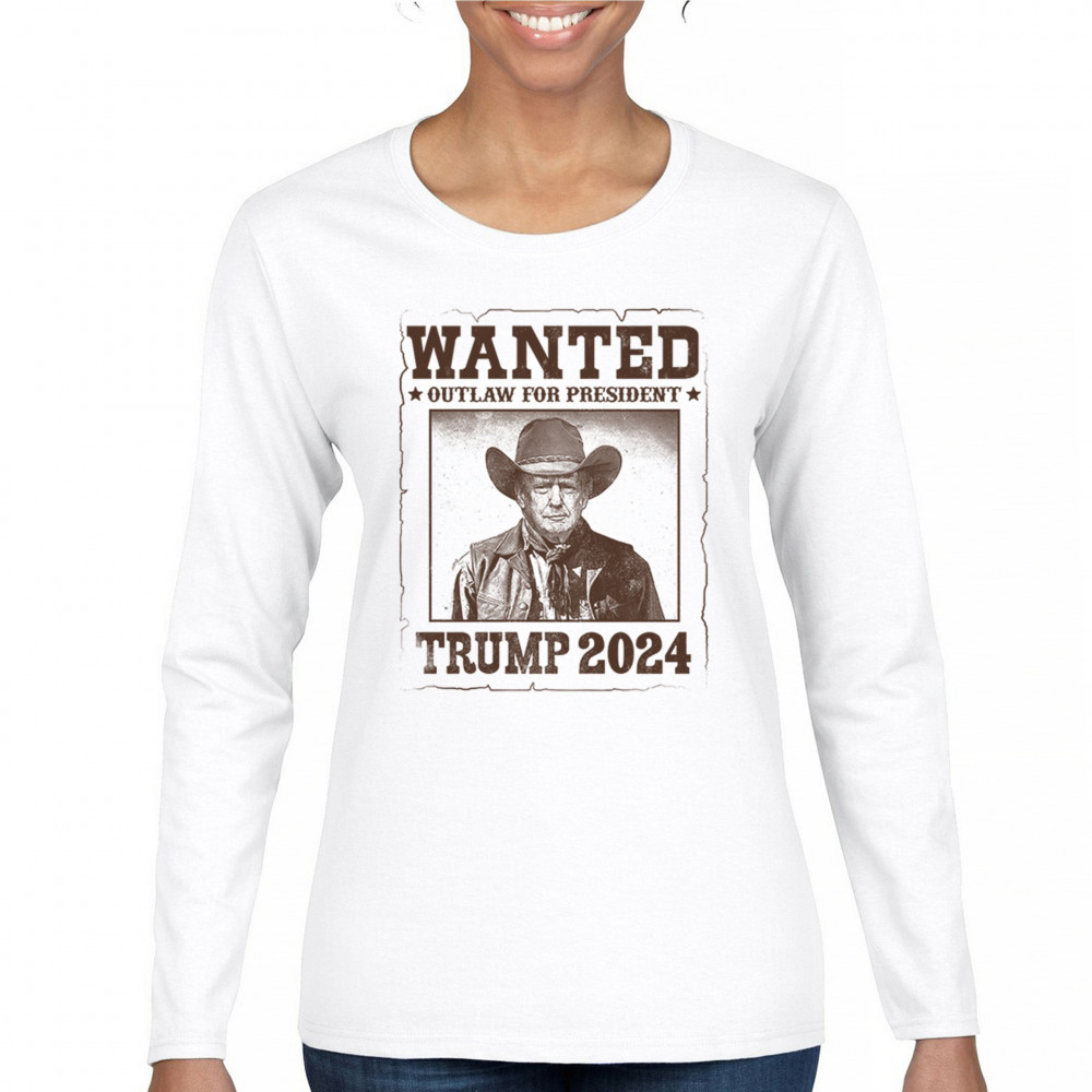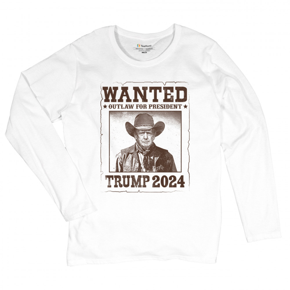 Bold "Wanted: Outlaw for President" design featuring Trump in cowboy attire, perfect for rally-goers and supporters. Express your support for the 2024 election.