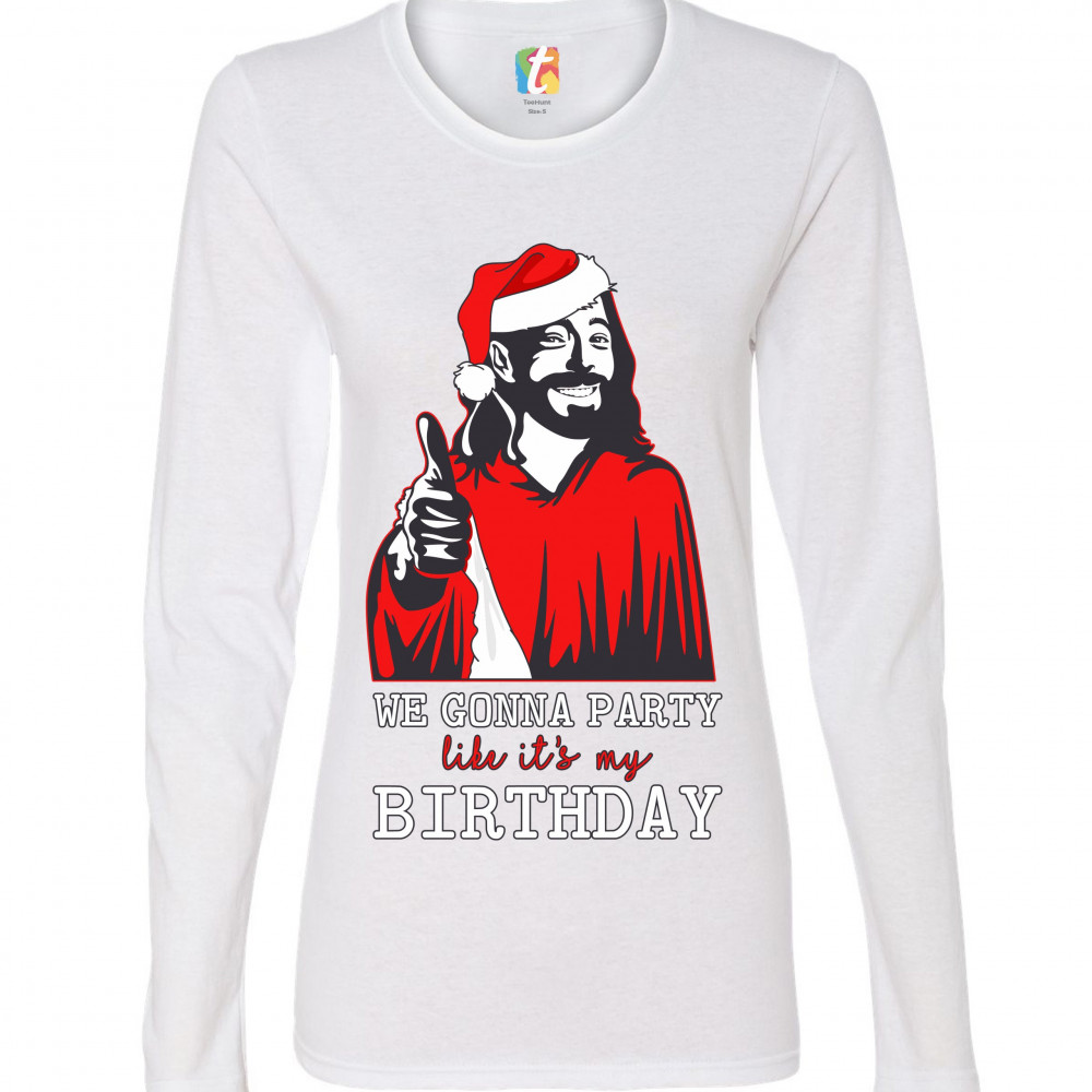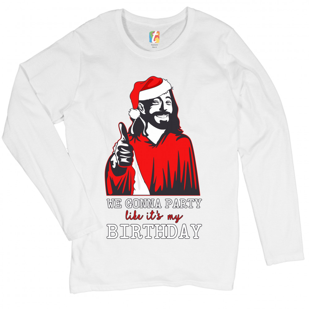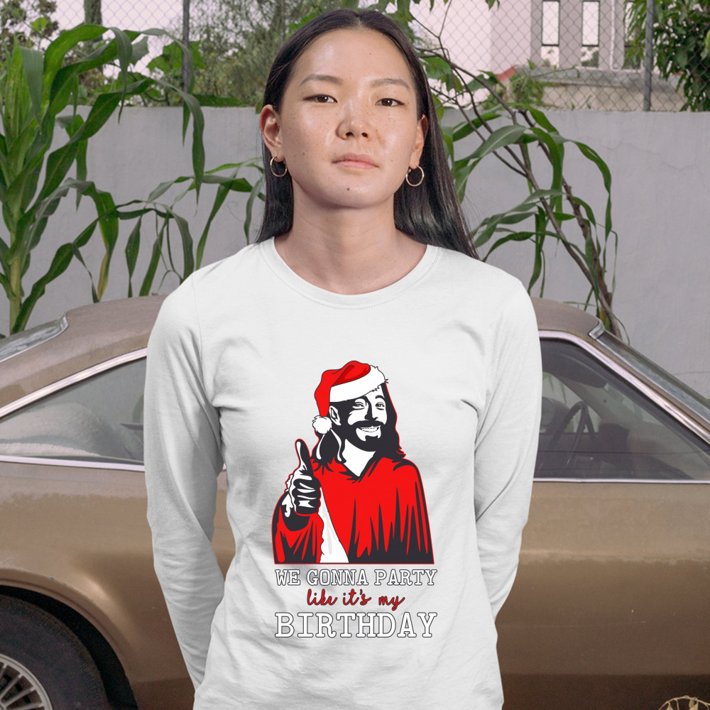 WE GONNA PARTY LIKE IT'S MY BIRTHDAY women's long sleeve t-shirt jesus christ white