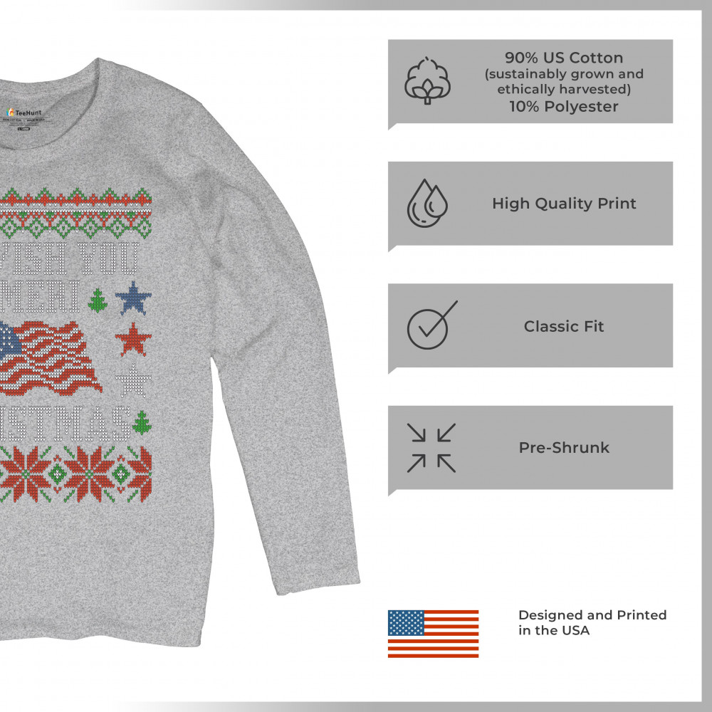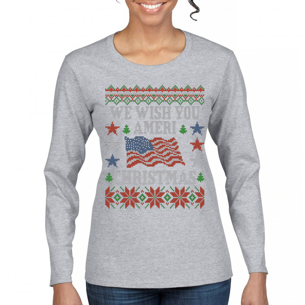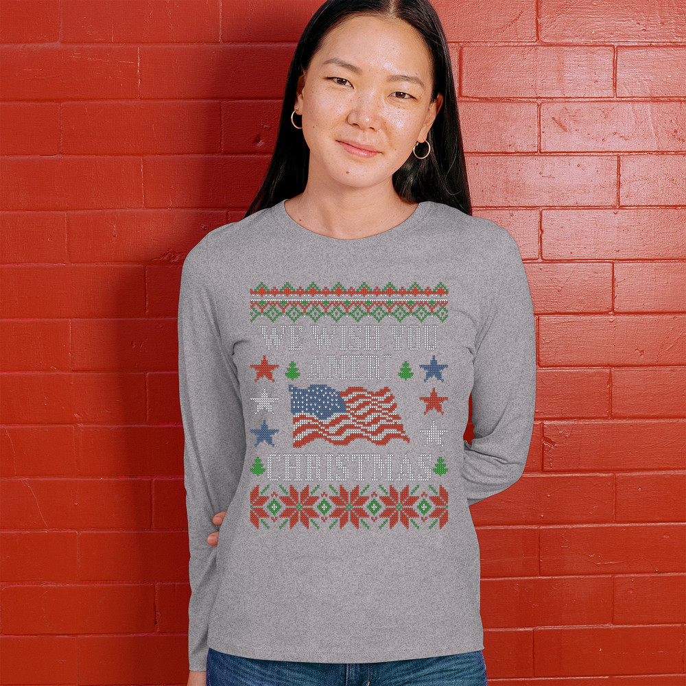 WE WISH YOU AMERI CHRISTMAS women's long sleeve t-shirt ugly sweater patriotic gray