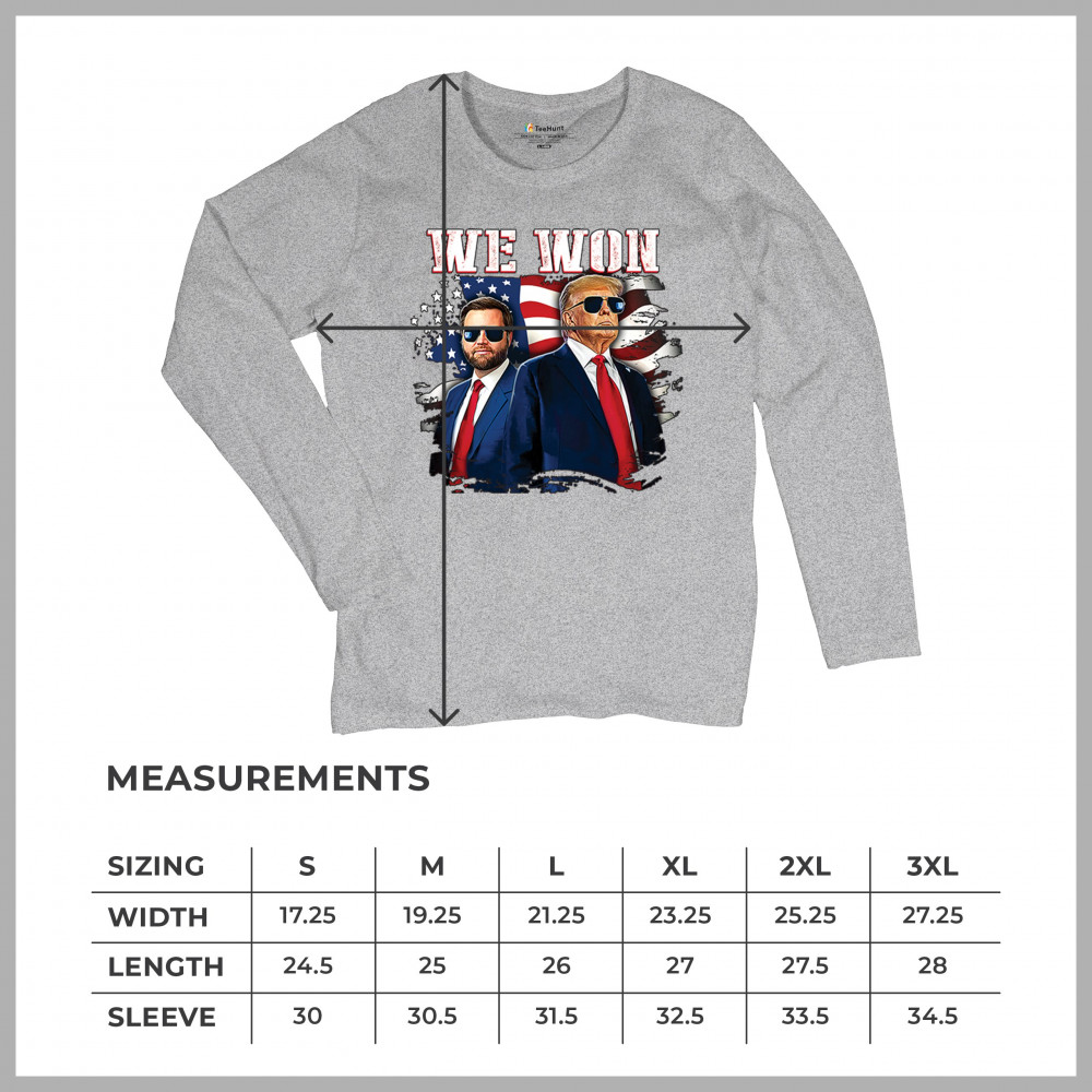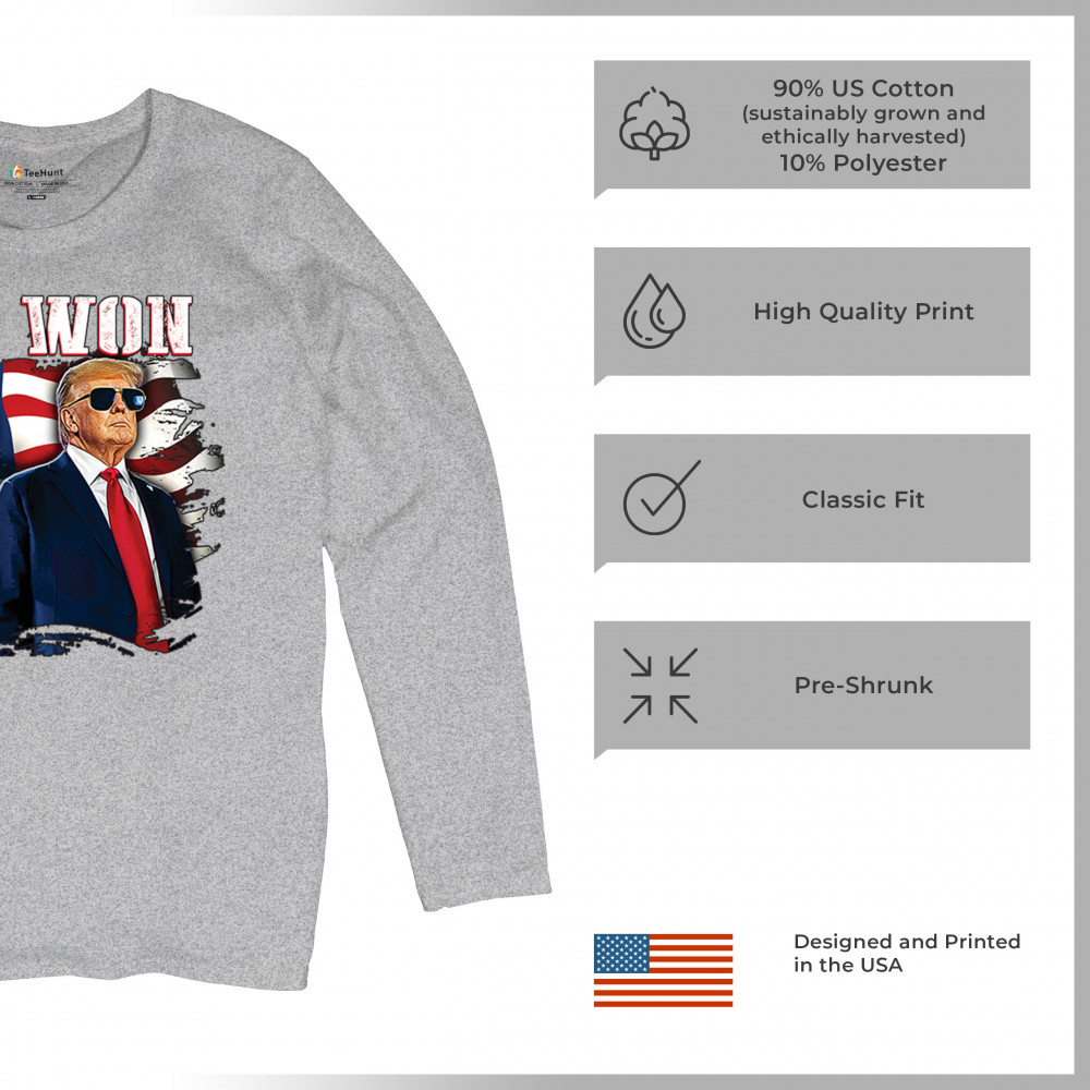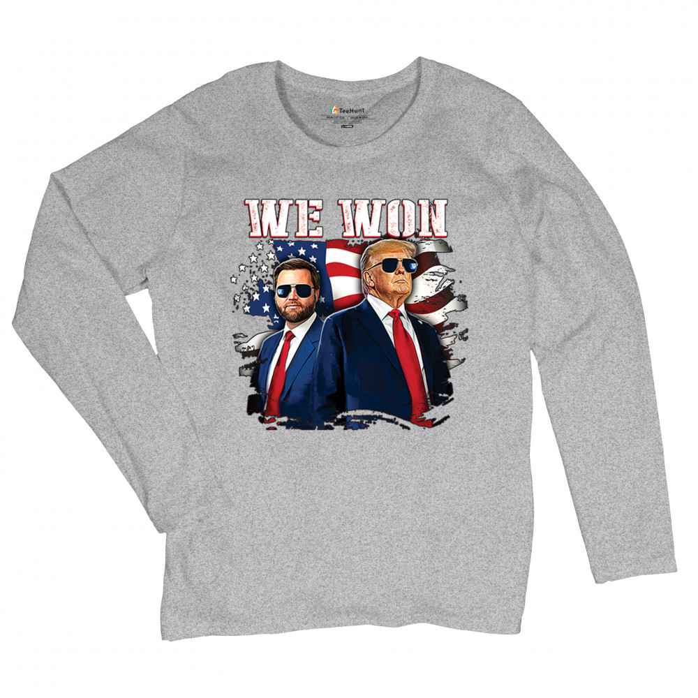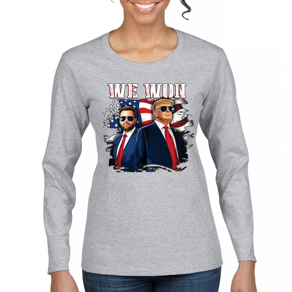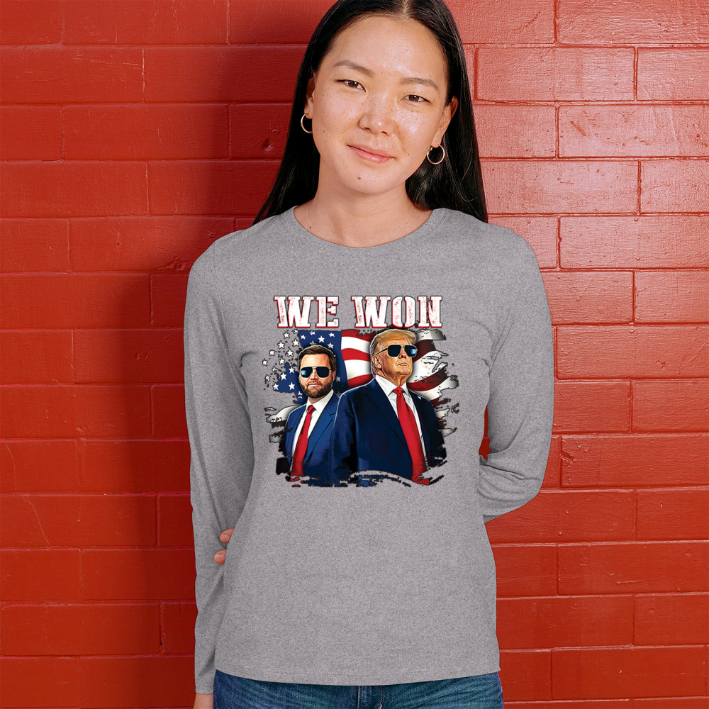 Celebrate Republican victory with this bold "We Won" design featuring Trump and patriotic flair—perfect for rallies, events, and patriotic pride.