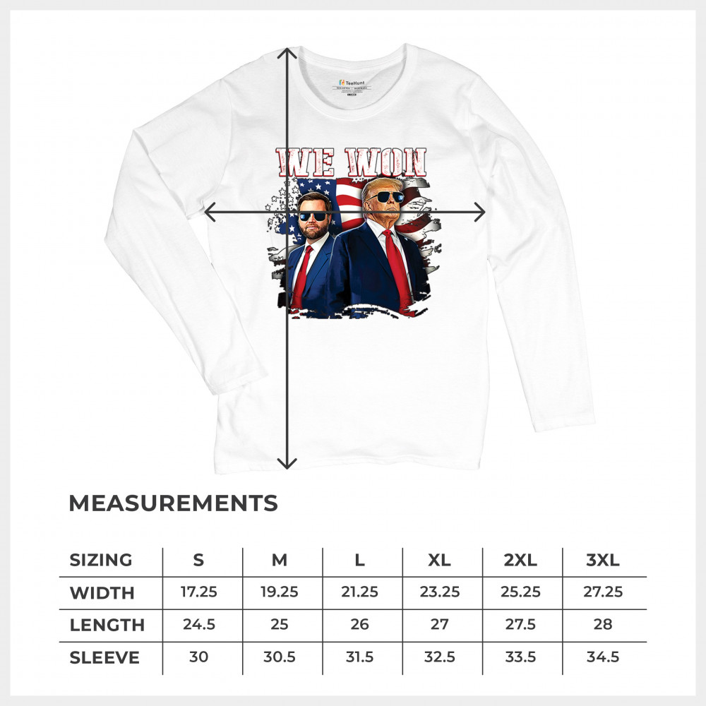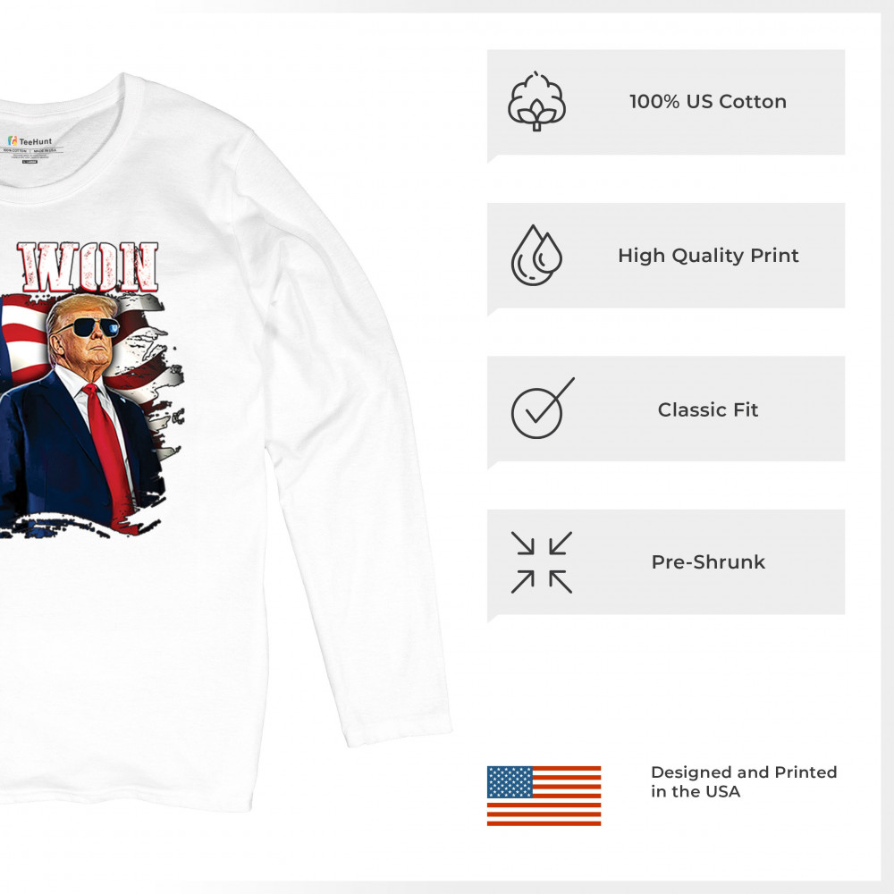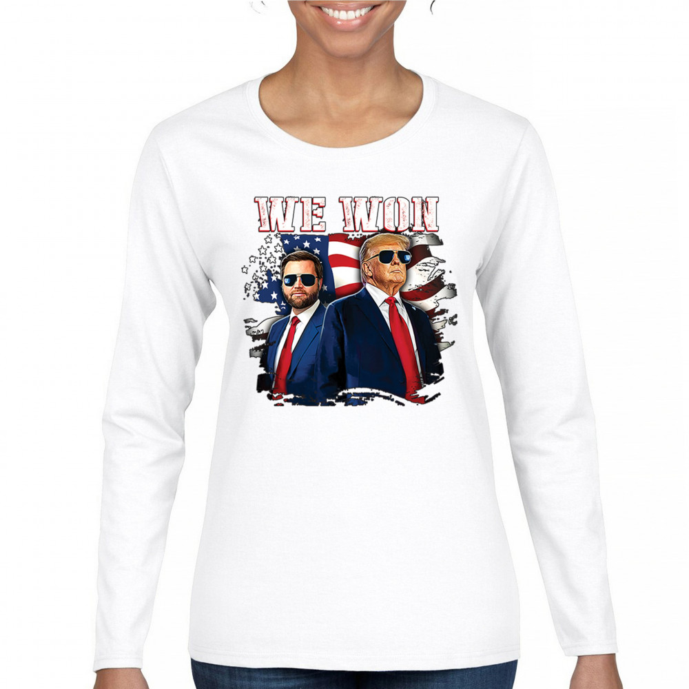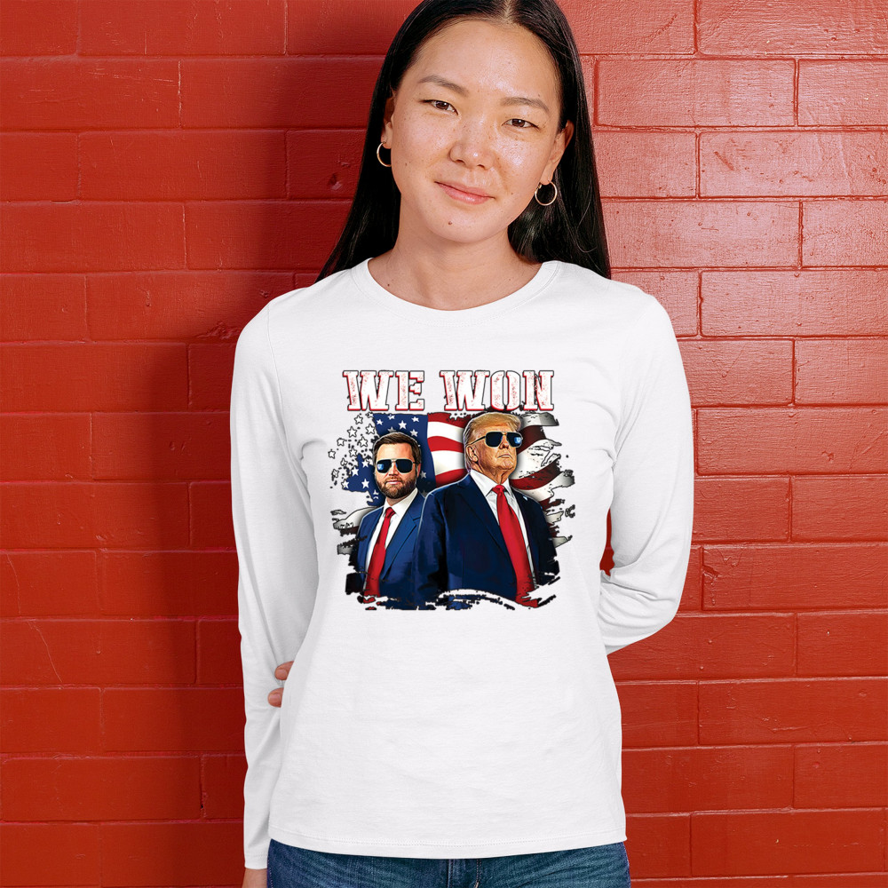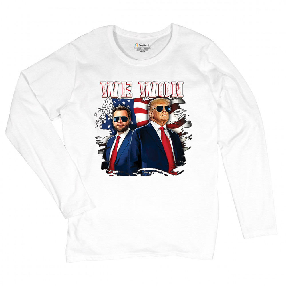 Celebrate Republican victory with this bold "We Won" design featuring Trump and patriotic flair—perfect for rallies, events, and patriotic pride.