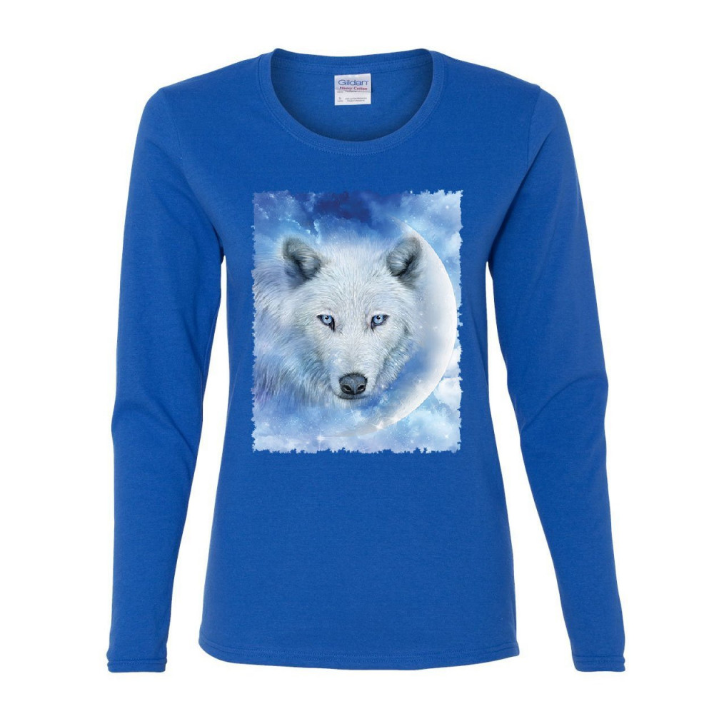 WHITE WOLF women's long sleeve tee wildlife animal moon howl nature wolfpack royal blue