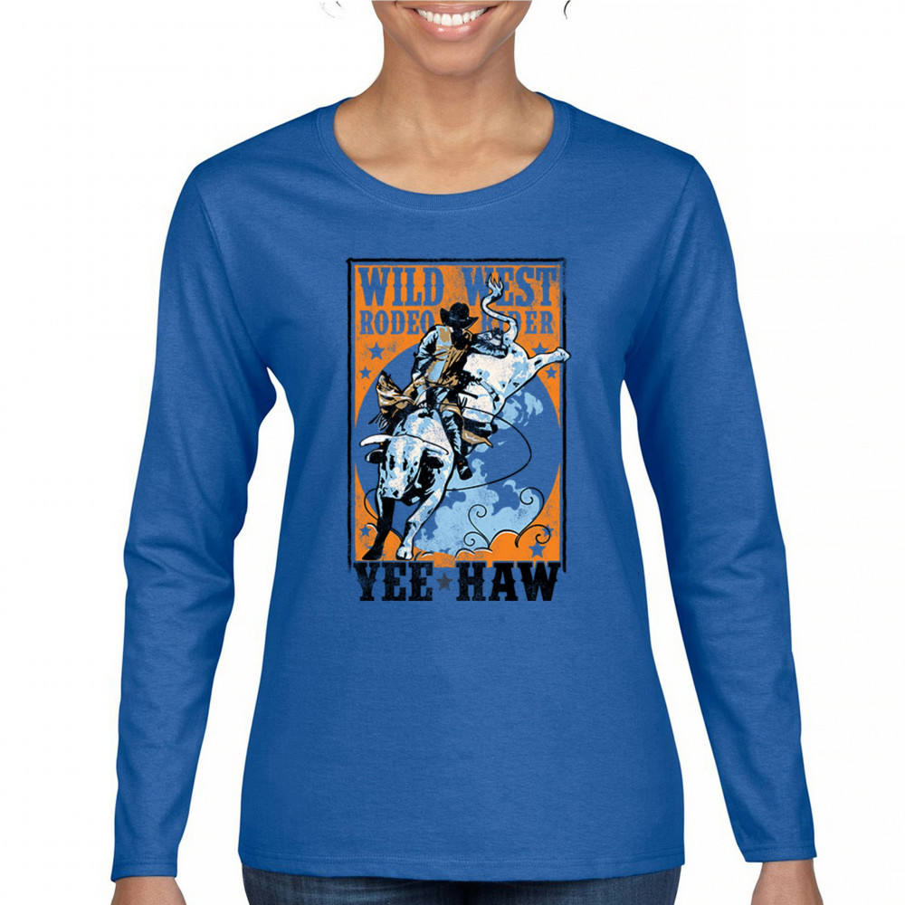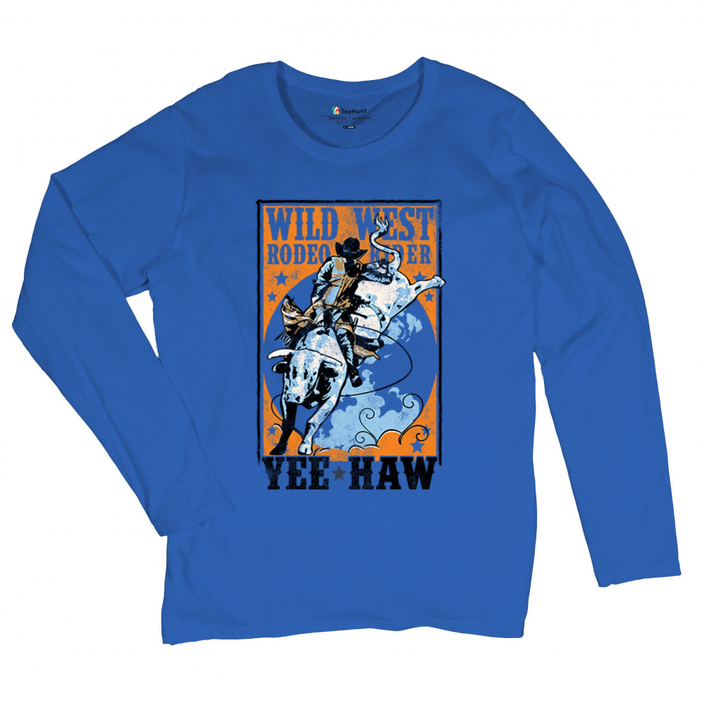 Bold cowboy bull riding design with orange backdrop, perfect for rodeo fans, western events, and country festivals.
