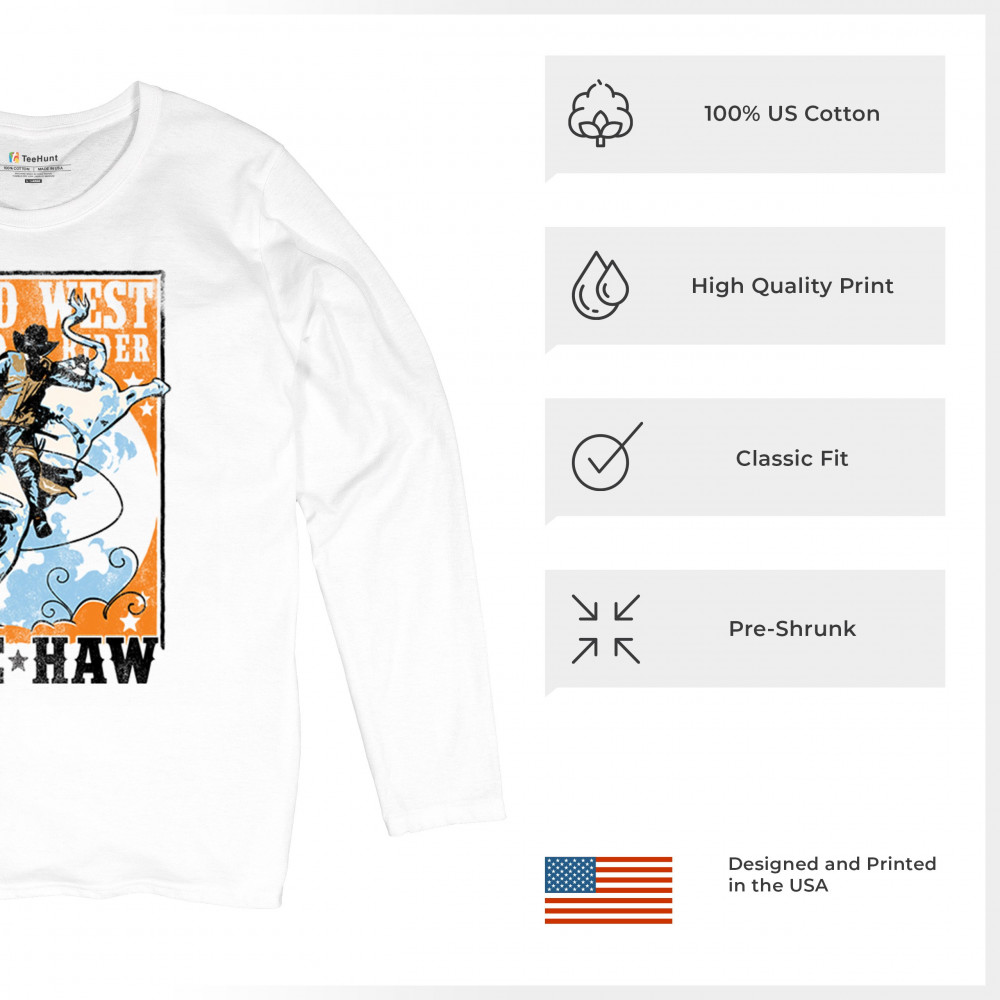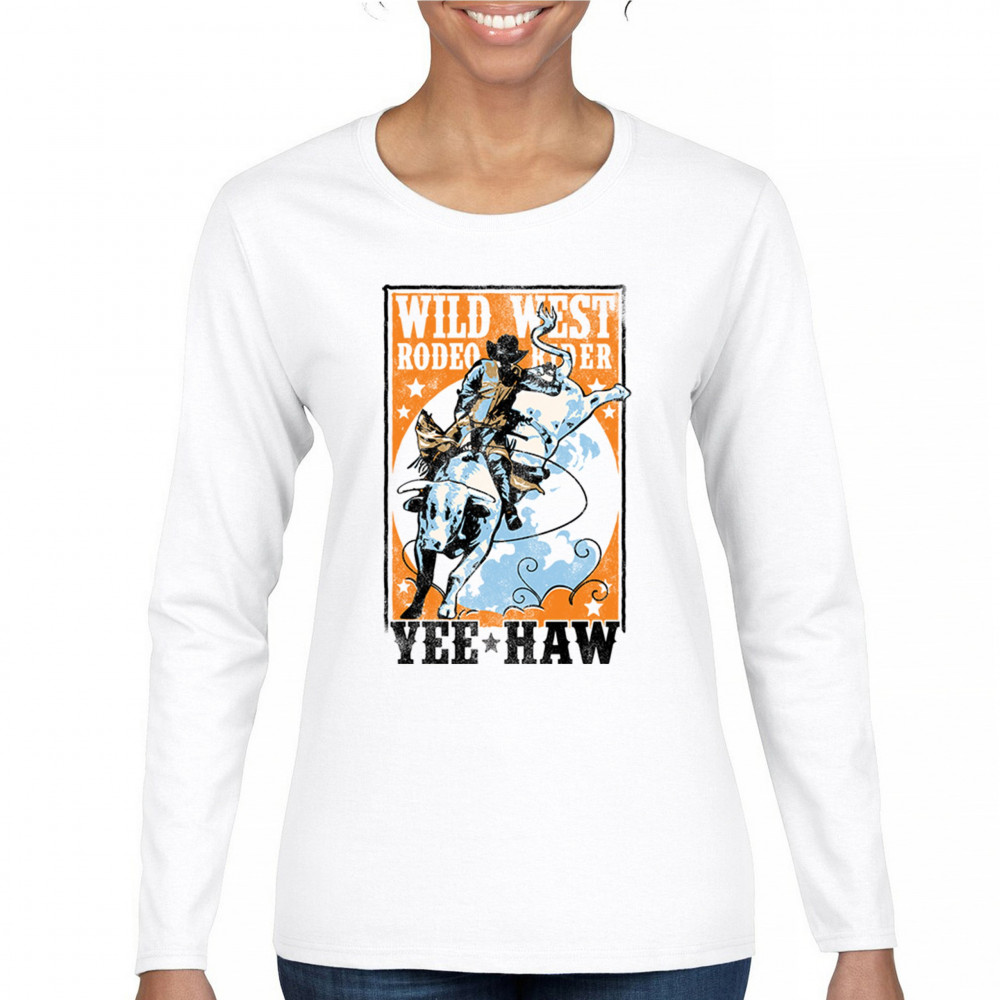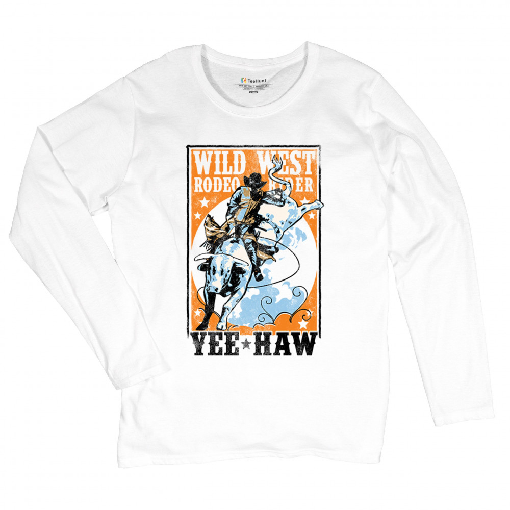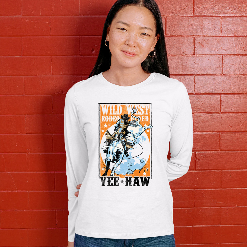 Bold cowboy bull riding design with orange backdrop, perfect for rodeo fans, western events, and country festivals.