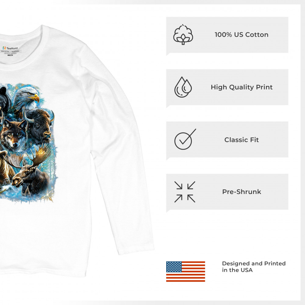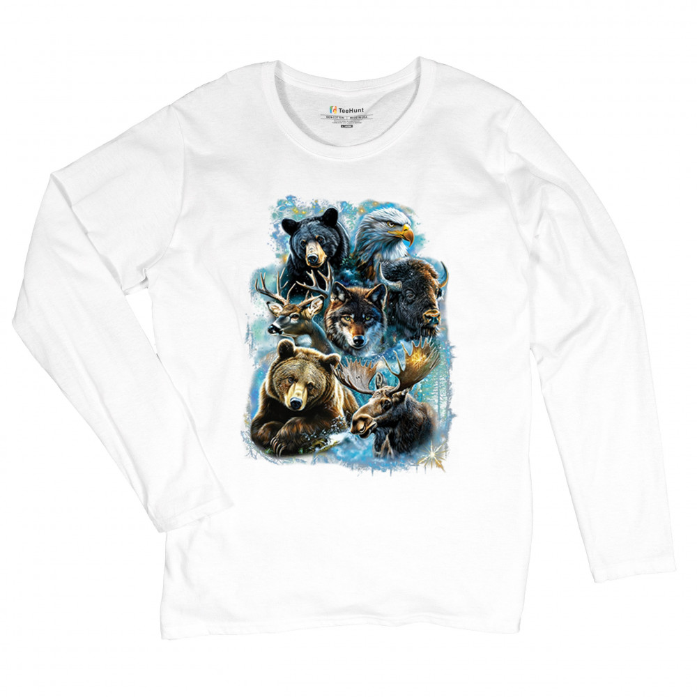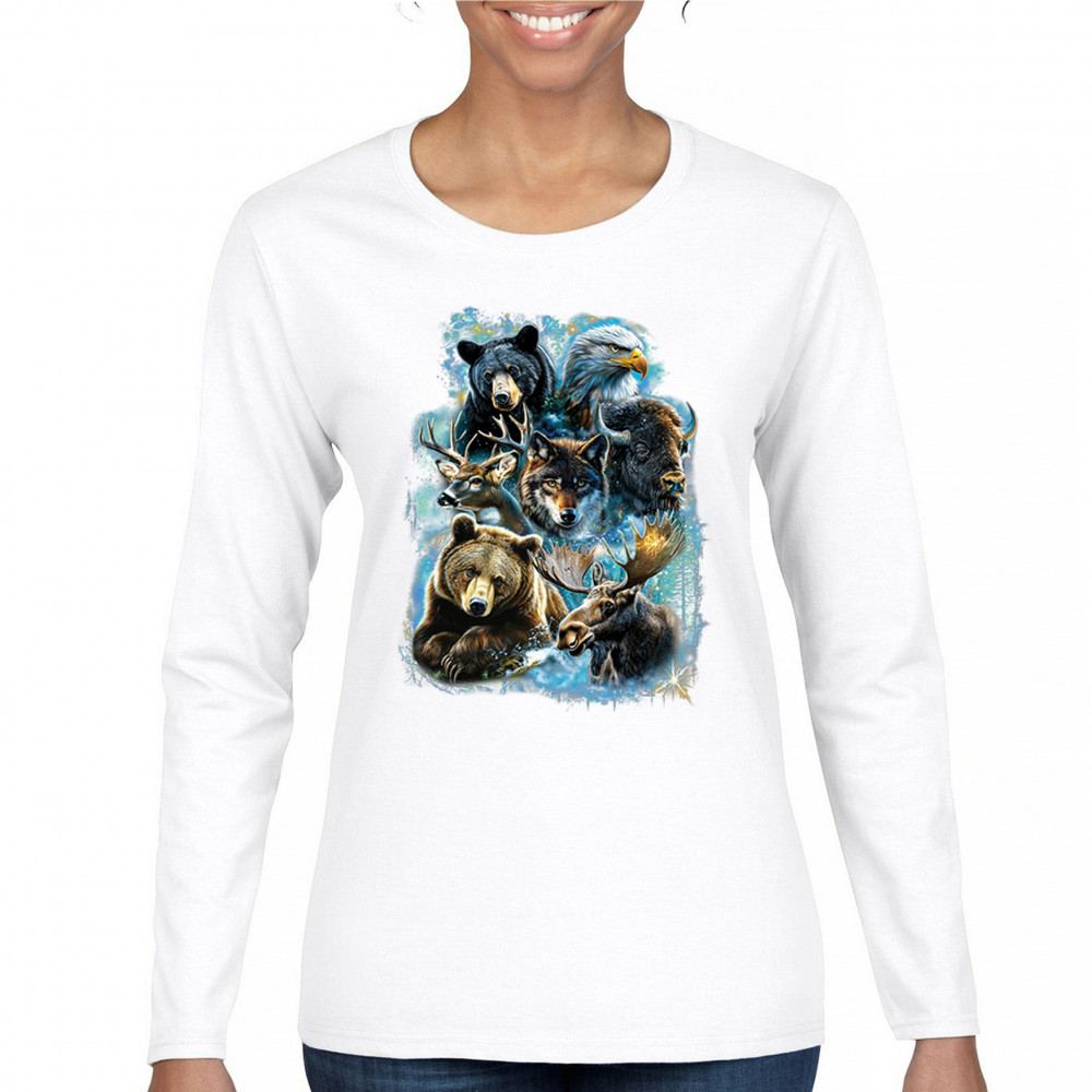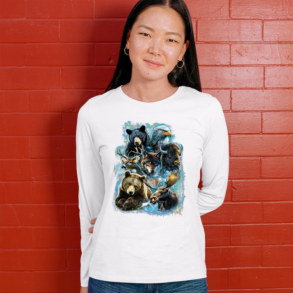 Wilderness design with moose, bear, eagle, bison, and wolf. A bold tribute to forest animals, nature strength, and rugged outdoor spirit.