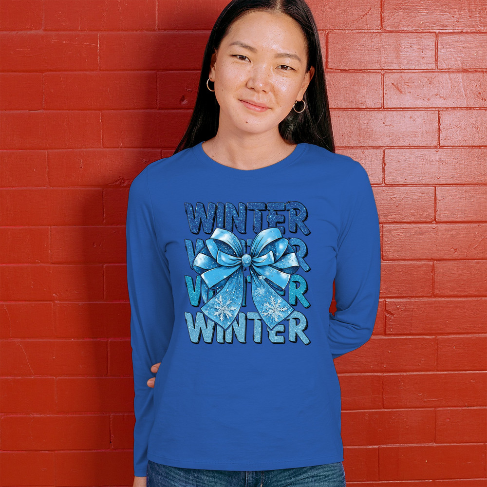 This shimmering winter bow design blends icy blue glitter style with bold repeating WINTER text for a bright seasonal statement. Snowflake accents and frosty tones create a cozy, cheerful vibe perfect for holiday outfits, gifting, or cold-weather lovers. A standout graphic that brings festive winter charm to any wardrobe and boosts seasonal search visibility.