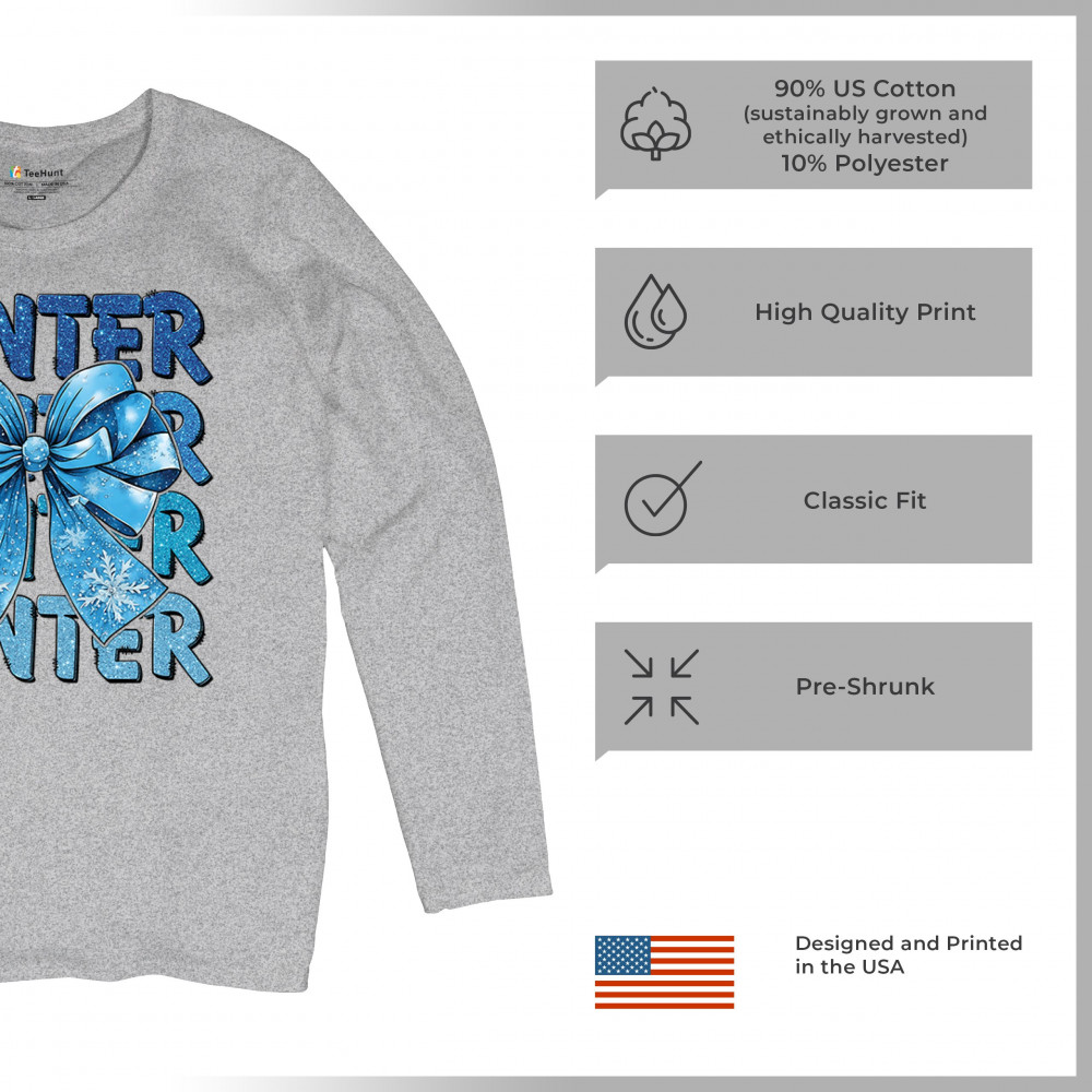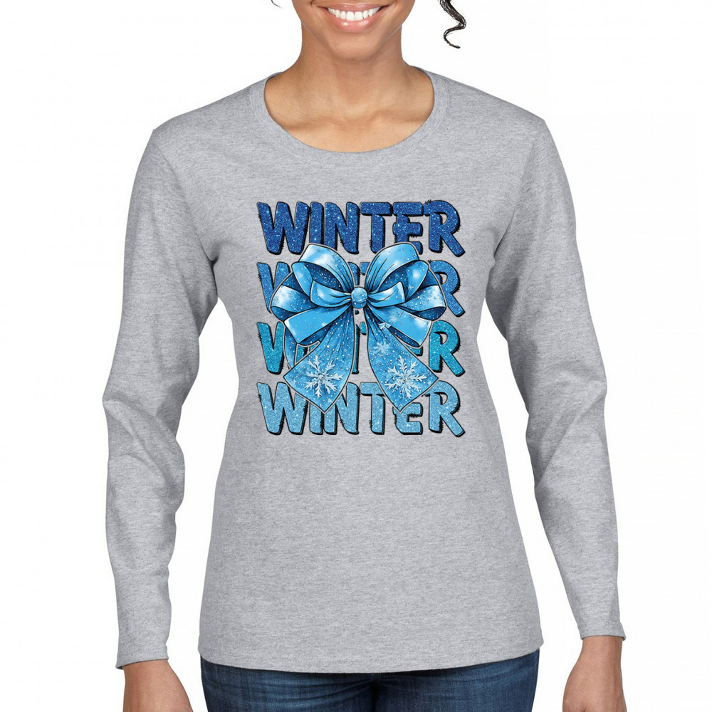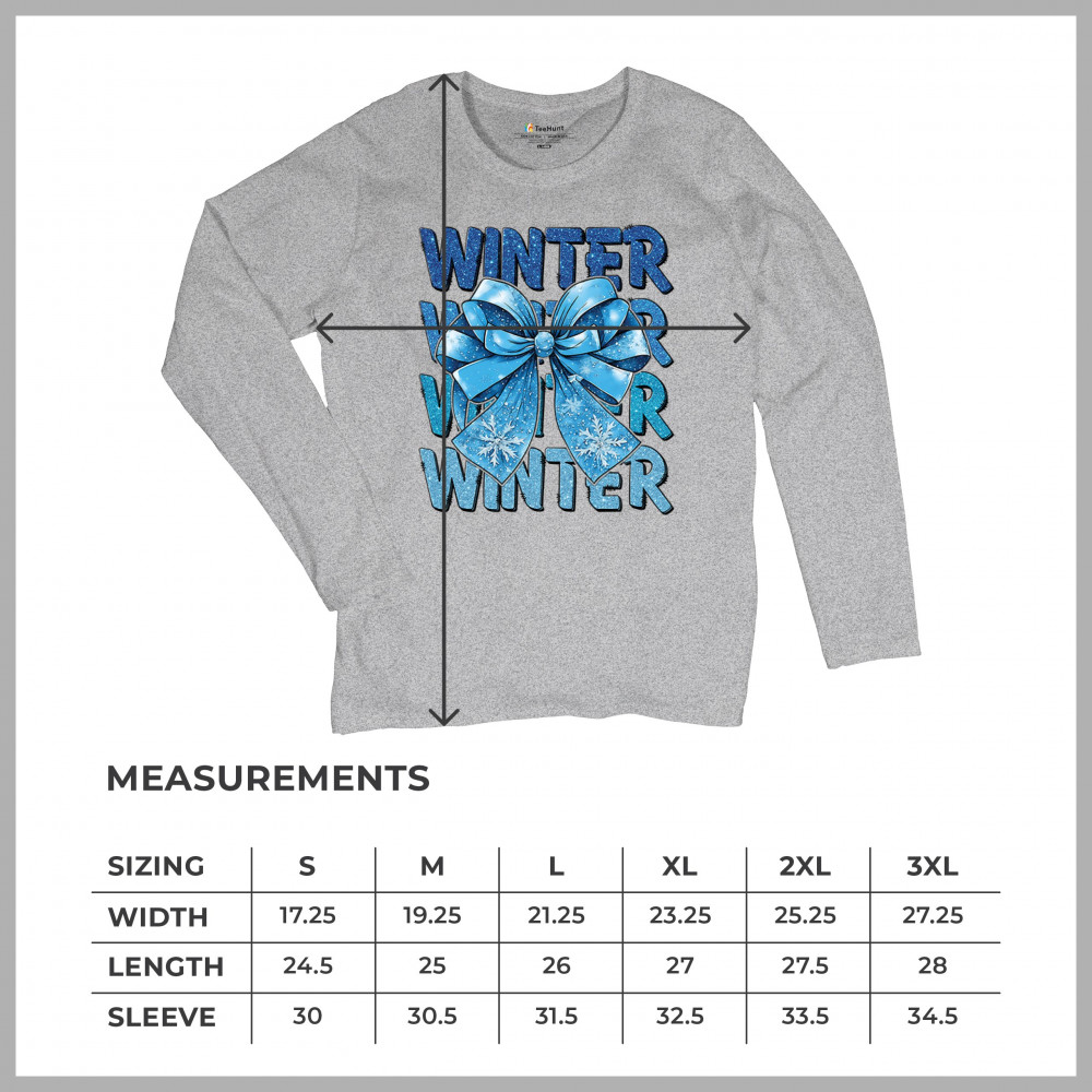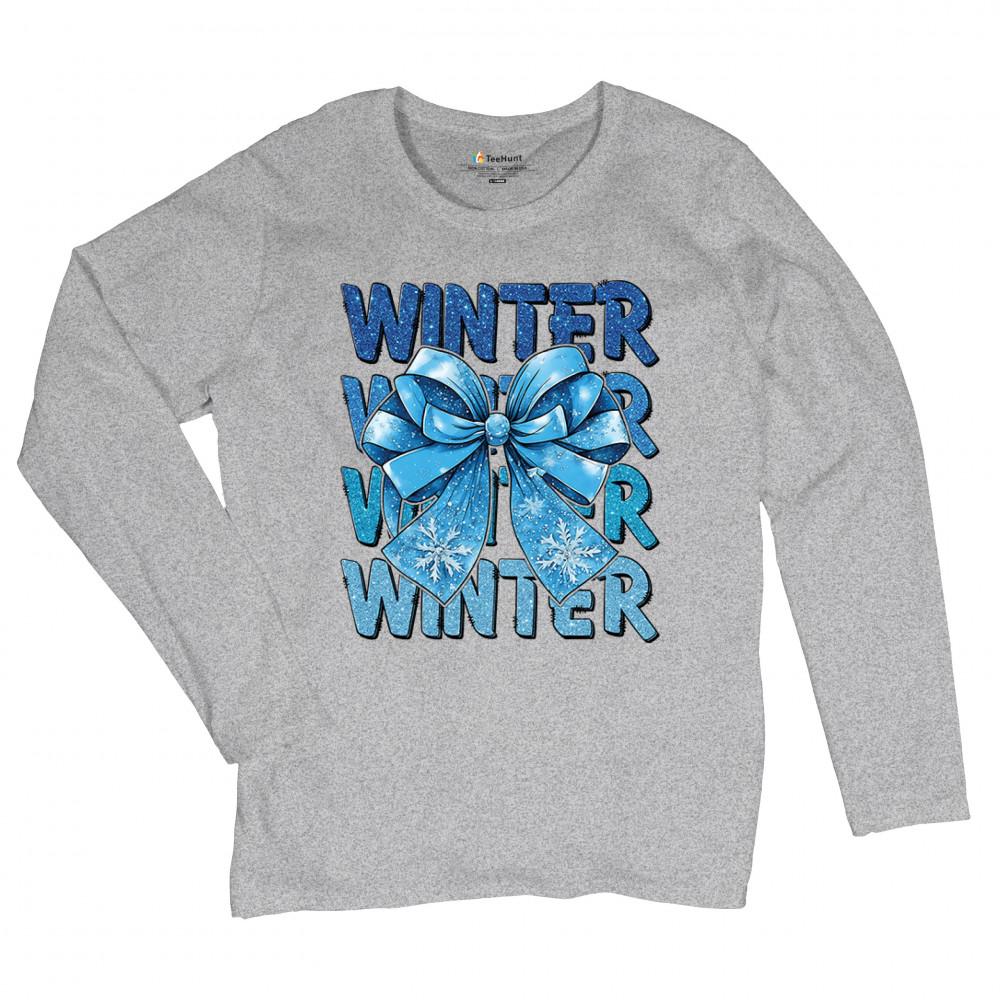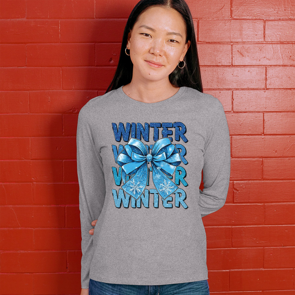 This shimmering winter bow design blends icy blue glitter style with bold repeating WINTER text for a bright seasonal statement. Snowflake accents and frosty tones create a cozy, cheerful vibe perfect for holiday outfits, gifting, or cold-weather lovers. A standout graphic that brings festive winter charm to any wardrobe and boosts seasonal search visibility.
